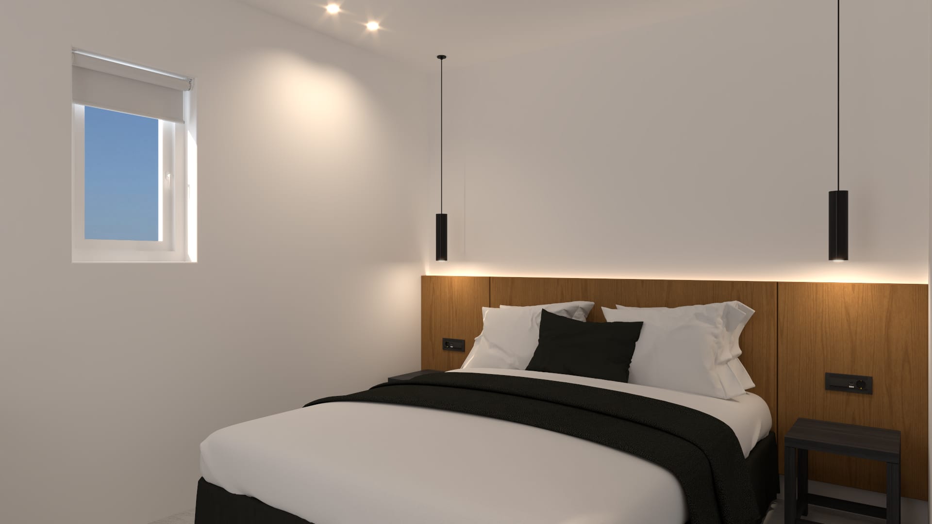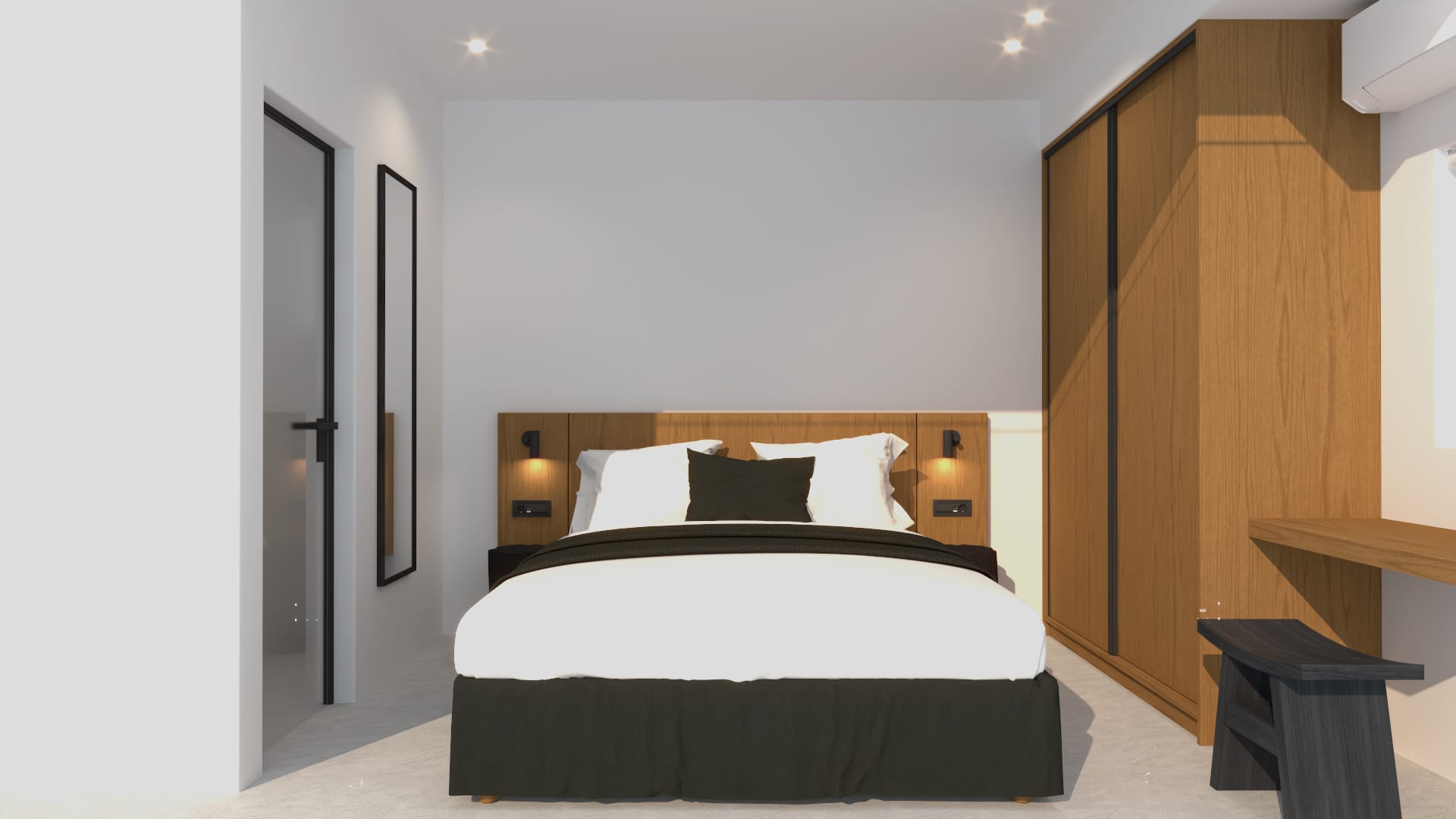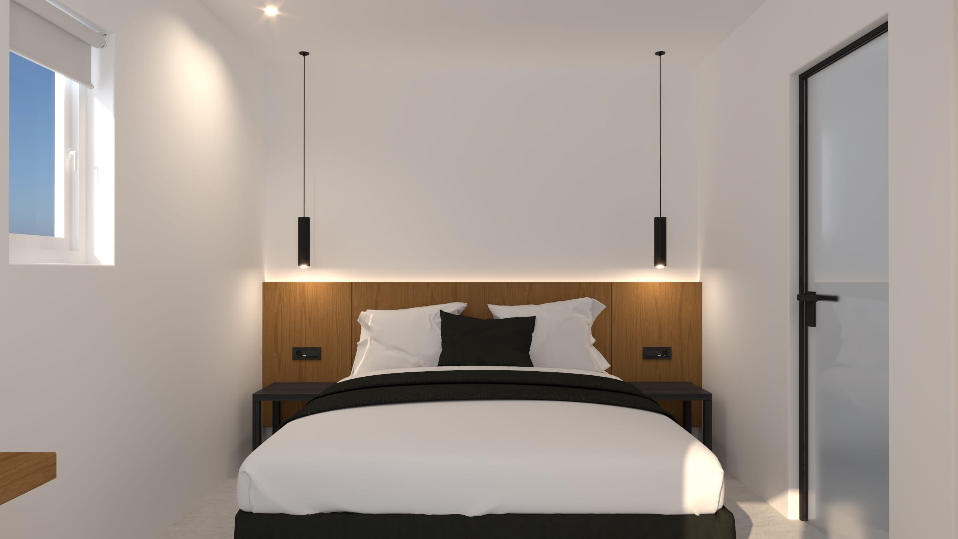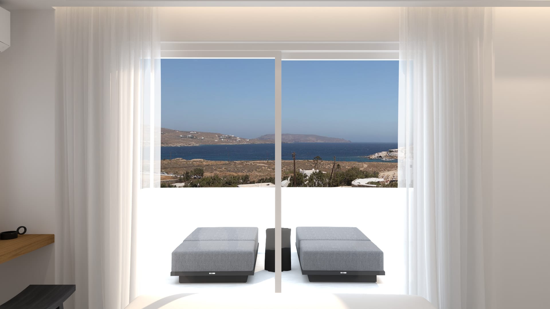 Suite 6: bedroom with queen-size bed, en-suite bathroom with walk-in rain shower, closets, ergonomic desk, direct access to a private balcony with sunbeds, panoramic sea view from the bed.