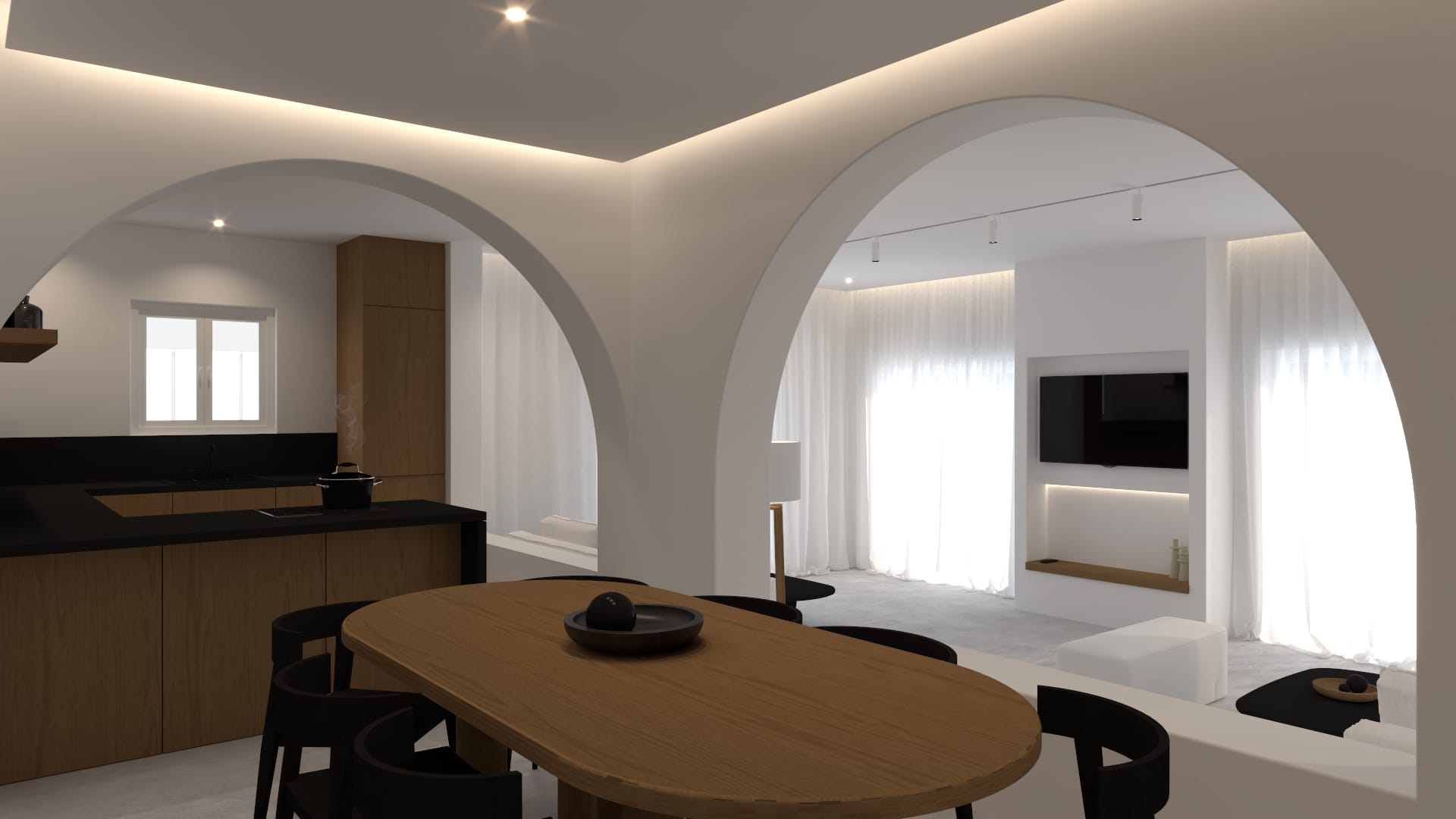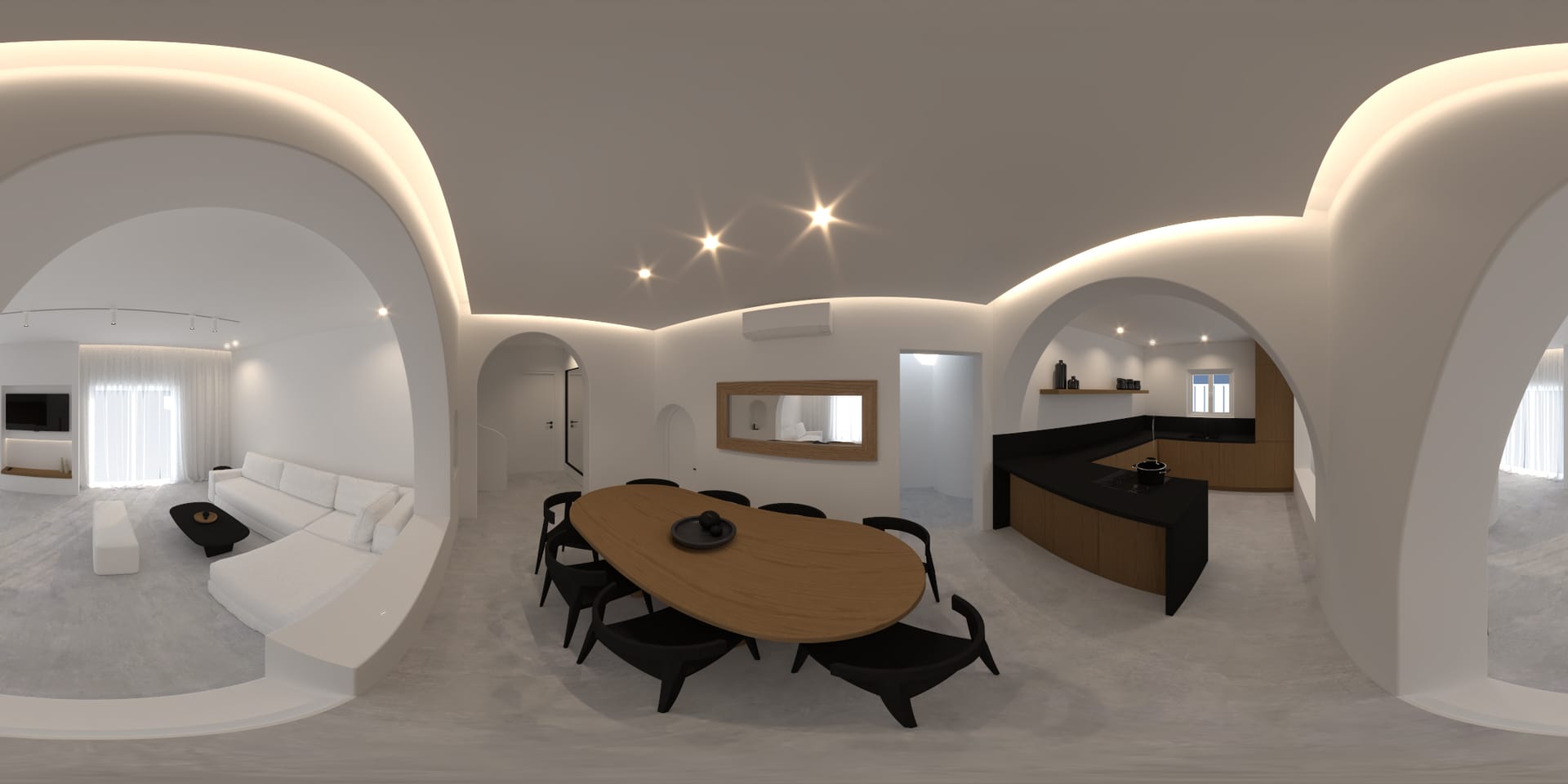 Open plan fully equipped kitchen, spacious living room with Satellite Smart TV, amazing panoramic sea view and pool view, guest bathroom, indoor dining area, access to the outdoor kitchen-bar with BBQ, outdoor dining area and outdoor lounge areas.