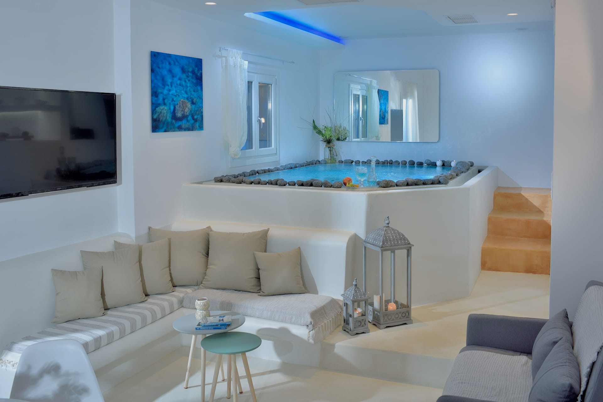 Living room with indoor mini pool with hydro-massage jets - The living room is 35㎡ and it has an indoor mini pool with hydro-massage jets. It has direct access to the stairs that takes you at pool area, upstairs balcony, upstairs kitchenete and the furnished outdoor open patio. The living room has direct sunset view, view to Mykonos Town, the Old Port and Tinos Island. It is equipped with a 52" tv, sitting area for up to 8ppl.