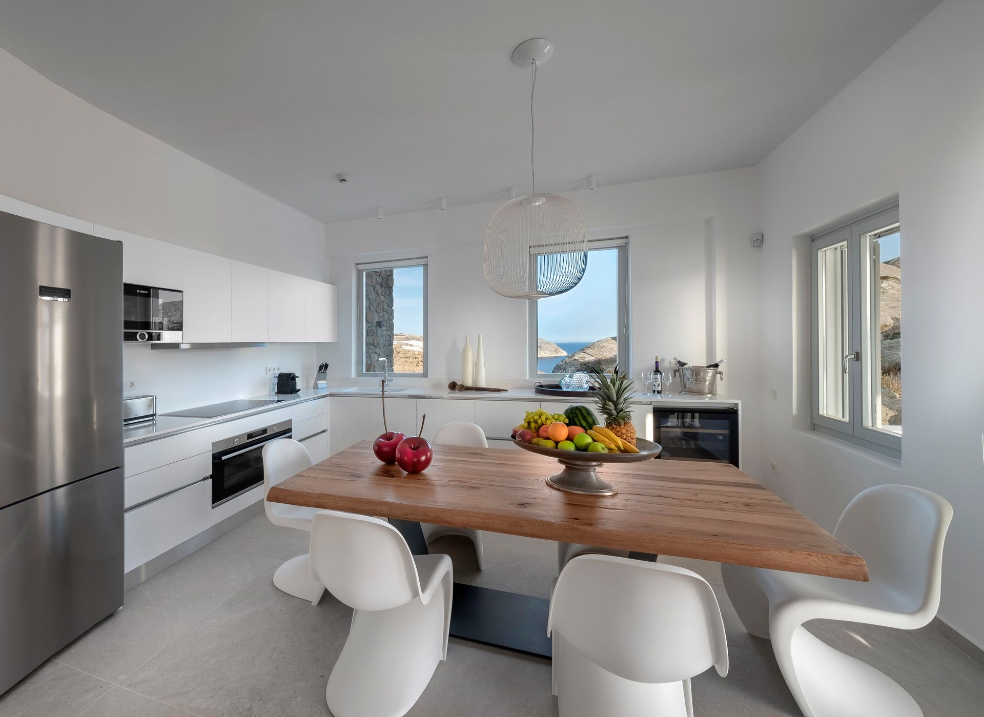The BBQ-bar area by the pool will be another of your favorite places to spend most of your time. Sitting comfortably at the stone-built cozy sofas which are surrounding the large wooden dining tables, you can enjoy an alfresco dinner and your drinks gazing at the shiny Aegean Sea.