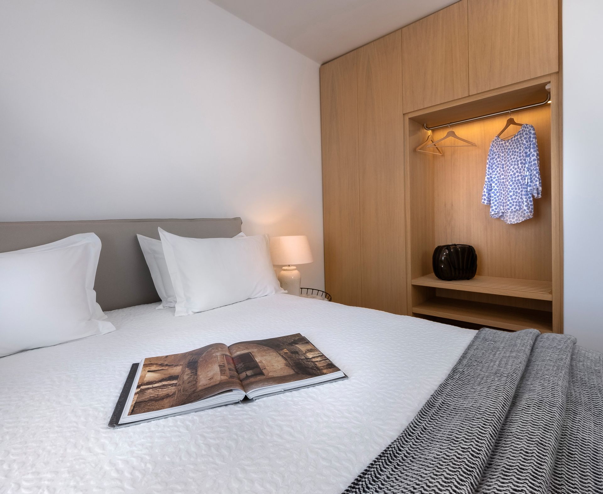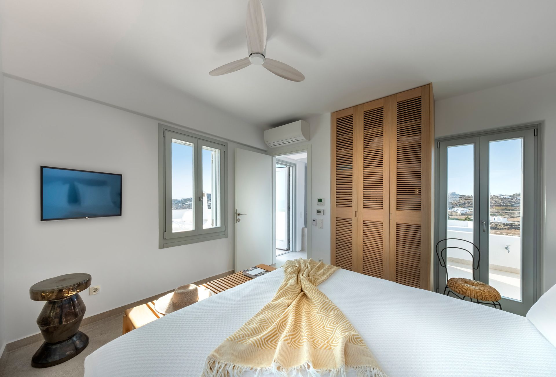 Room 2: bedroom with king size double bed (L 200cm / W180cm) and en suite bathroom with shower, heated towel rack, smart TV, USB socket, safe, A/C, ceiling fan, central floor heating, sea view window.