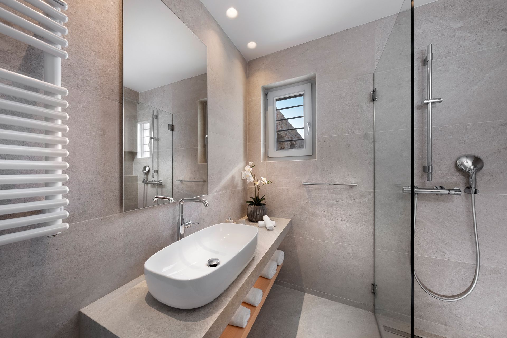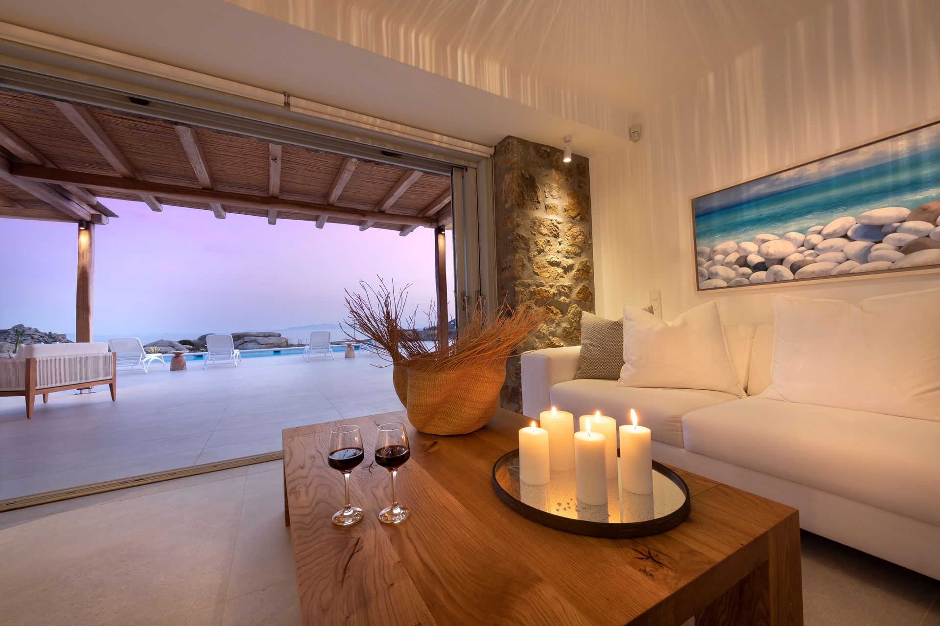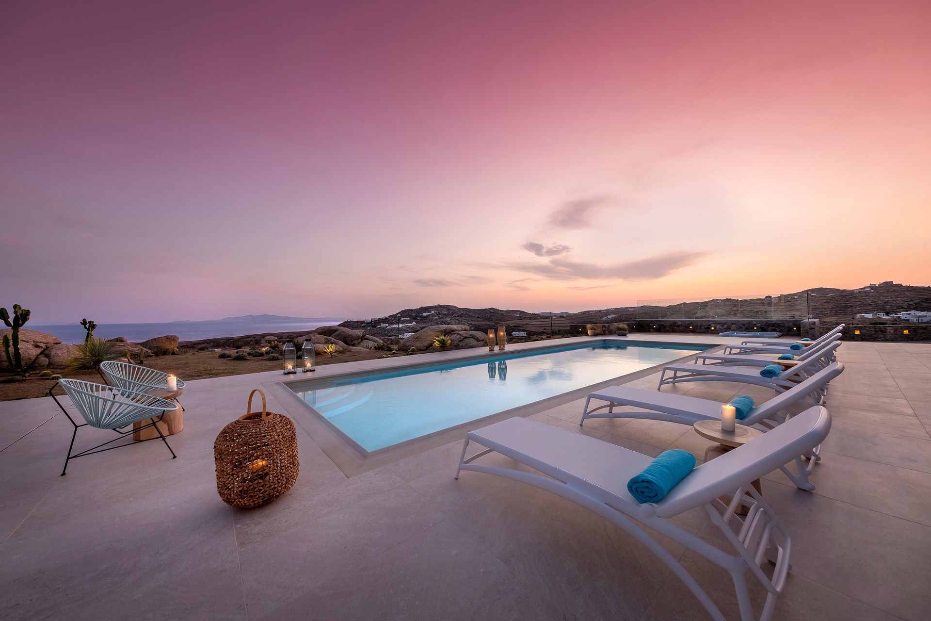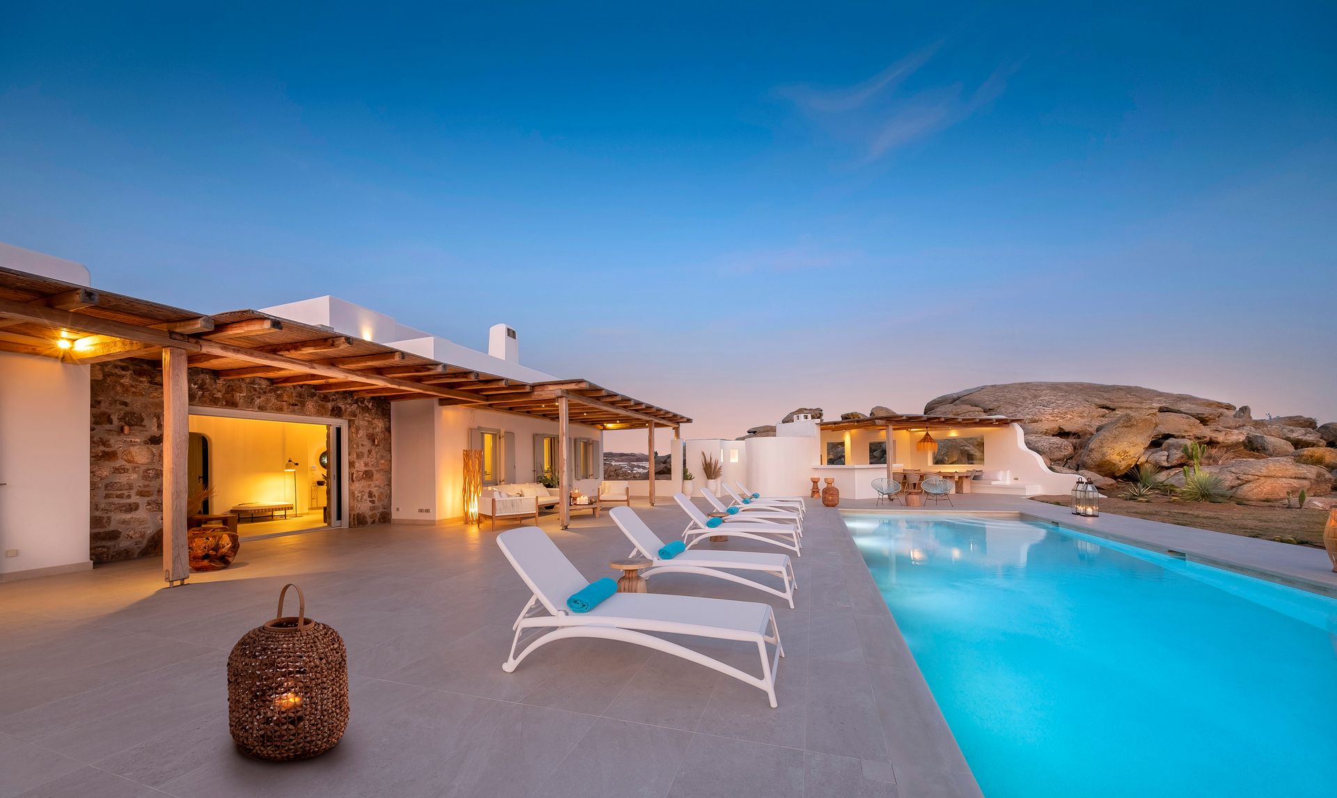 The spacious, outdoor lounge and dining areas by the pool and the sheltered open-air Jacuzzi, embraced by the spectacular scenery of the huge Cycladic rock, compose a magnificent environment providing high privacy and tranquility. Here you will enjoy your stay sunbathing all day long under the endless blue of the sunny sky while feeling the meltemi breeze on your face.