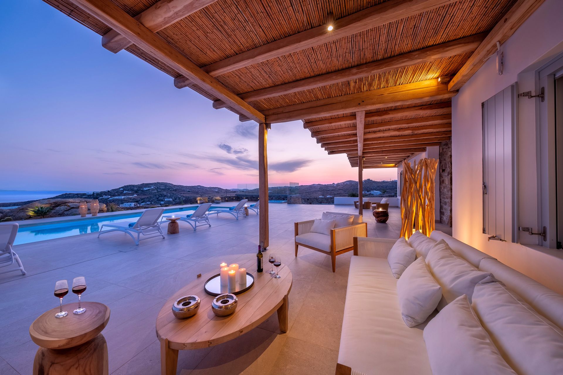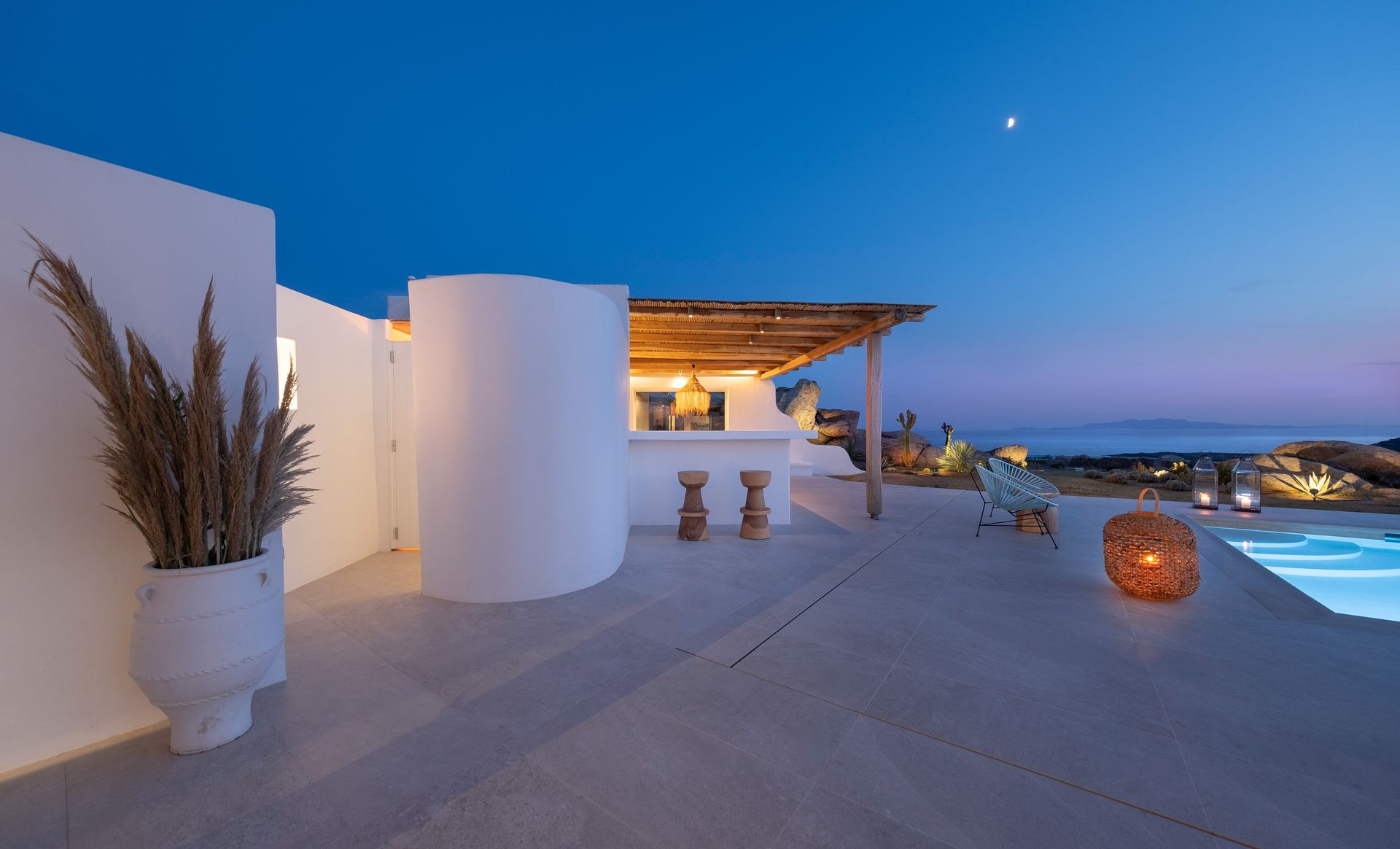 The luxury newly built Villa Esthisis stands out perfectly very close to the golden sandy beaches of Super Paradise and Agrari and the cosmopolitan beach club-restaurant Jackie’O. Being nicely hidden on a quiet flat hill, it is conveniently located just a few minutes’ drive from the airport, the new port and the Chora, town of Mykonos, making it a very rare and exclusive island retreat.