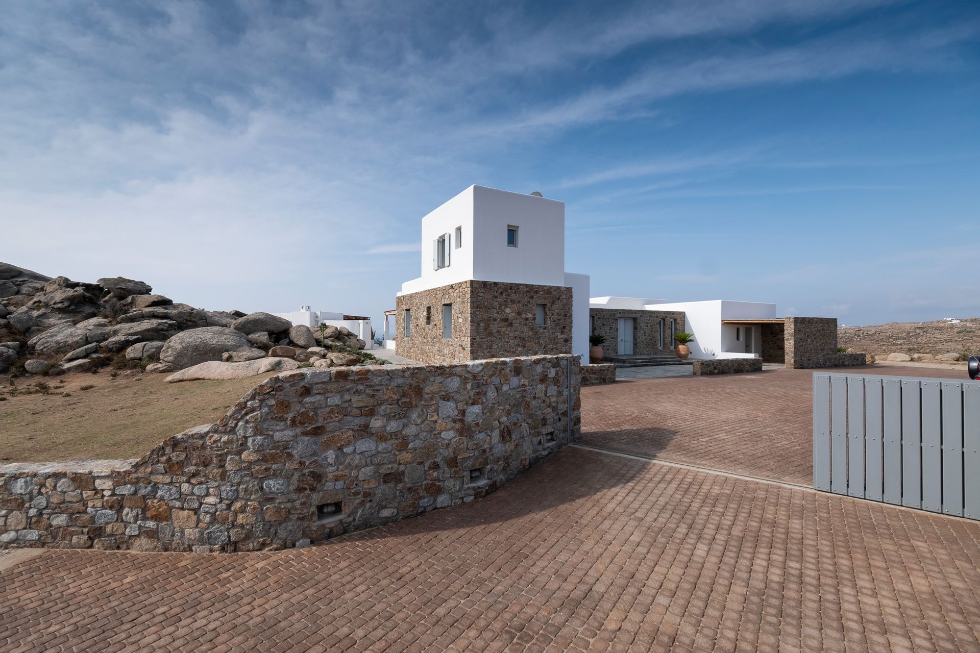 The villa 300 sq m together with the outdoor living areas more than 800 sq m, are part of a plot of land of 4050 sq m. Facing south it offers a unique view to the famous Aegean Sea and the neighbouring islands Paros and Naxos.