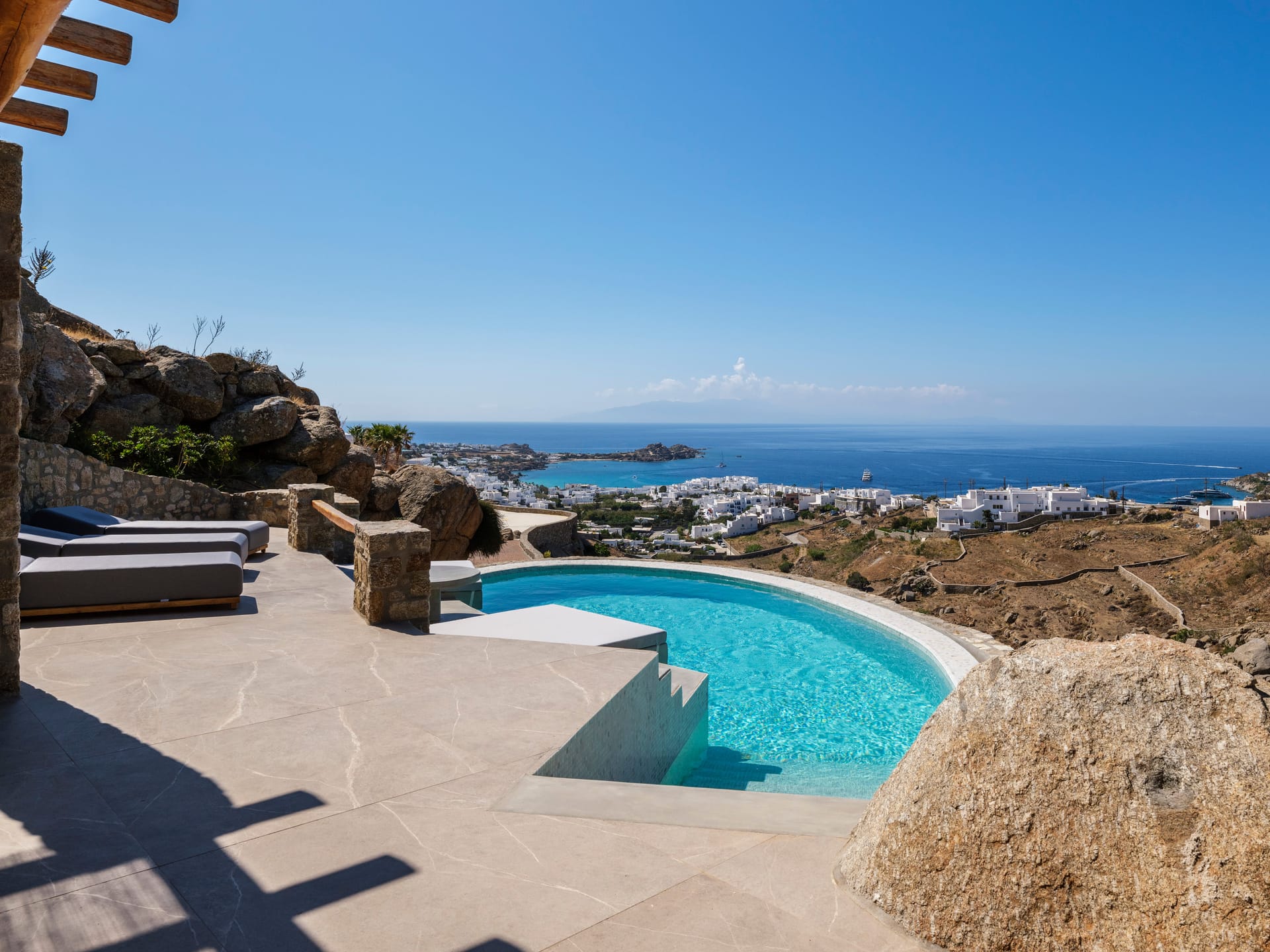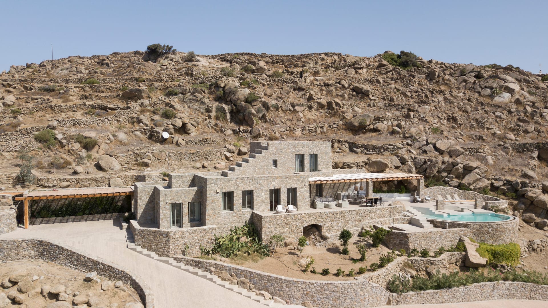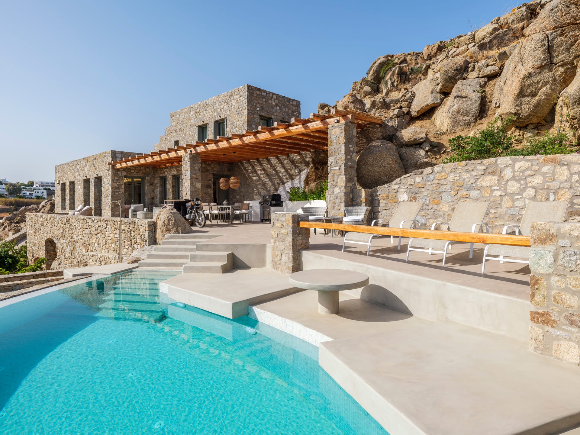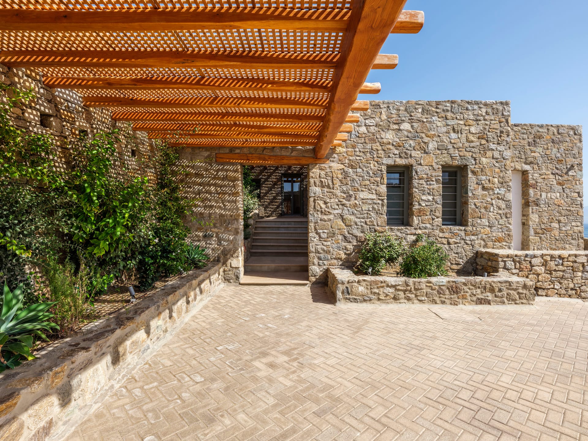 Hand-built stone walls convey an air of confidence, while traditionally rendered, round-edged volumes are flawlessly flat and smooth, adding to the property's sleek and contemporary aesthetic. Customary chestnut pergolas, a staple of Cycladic architecture, have been reimagined for enhanced structural integrity, forming a glue-lam beam lattice that elegantly shades and protects the extensive courtyard below.