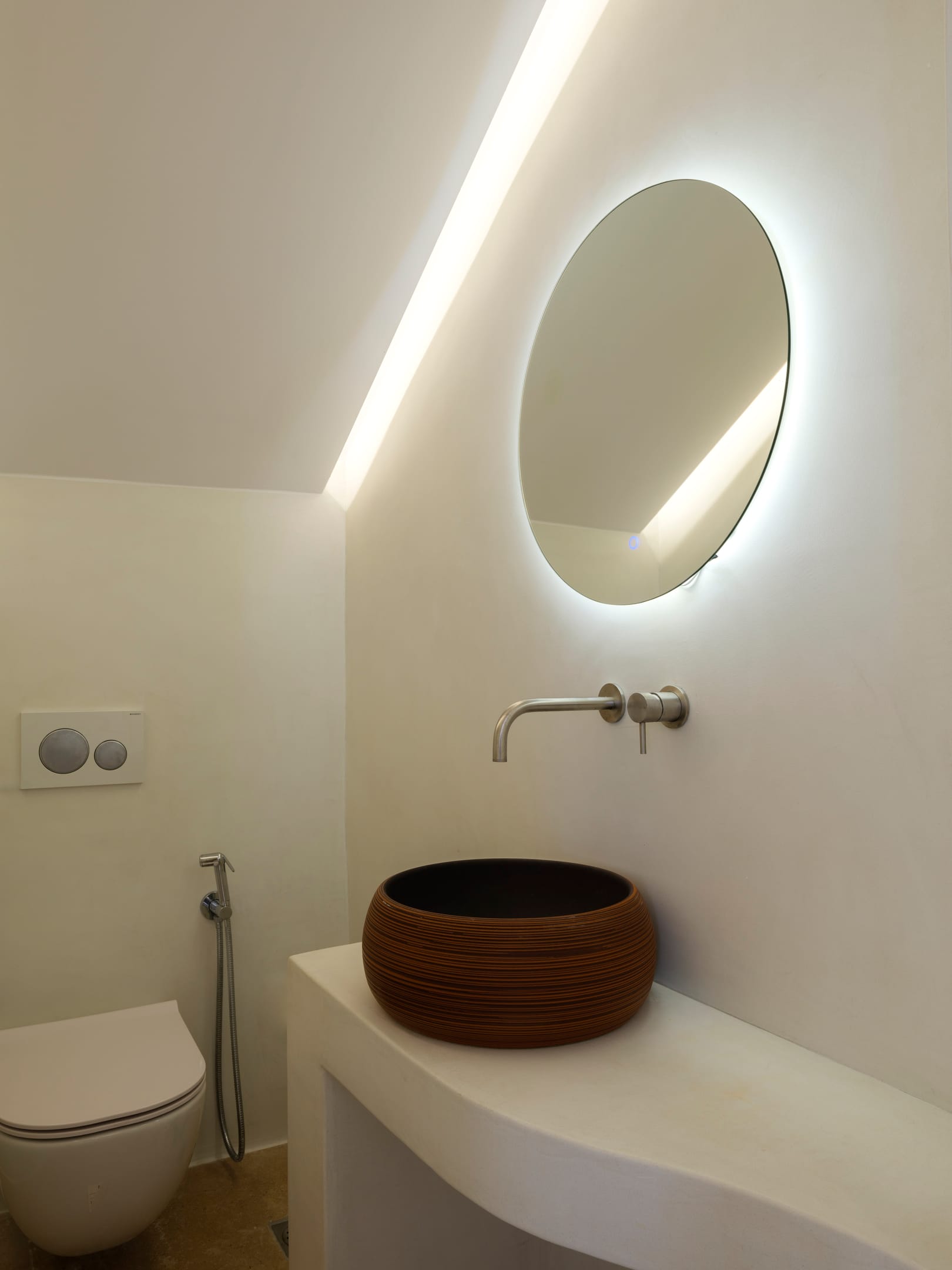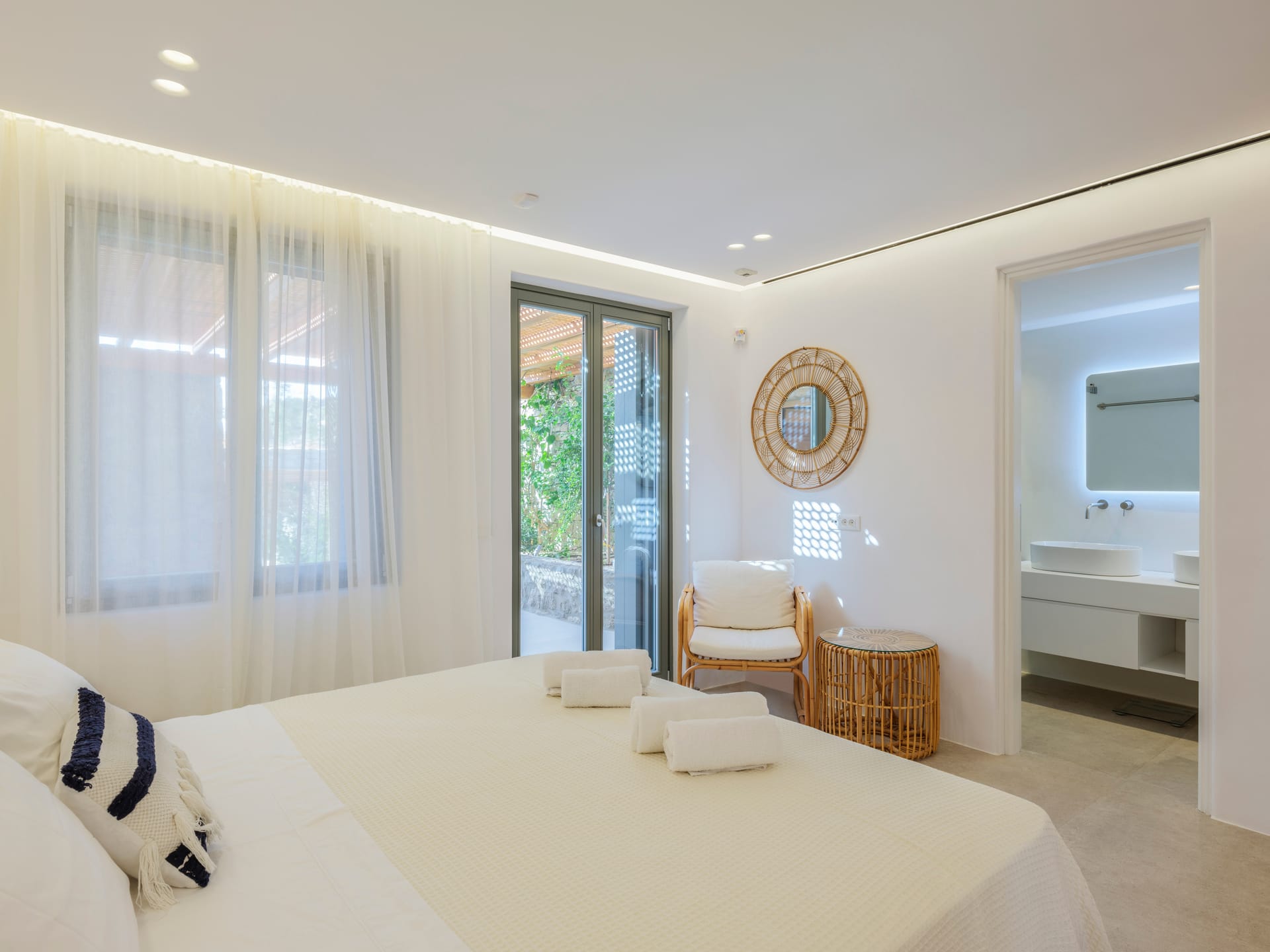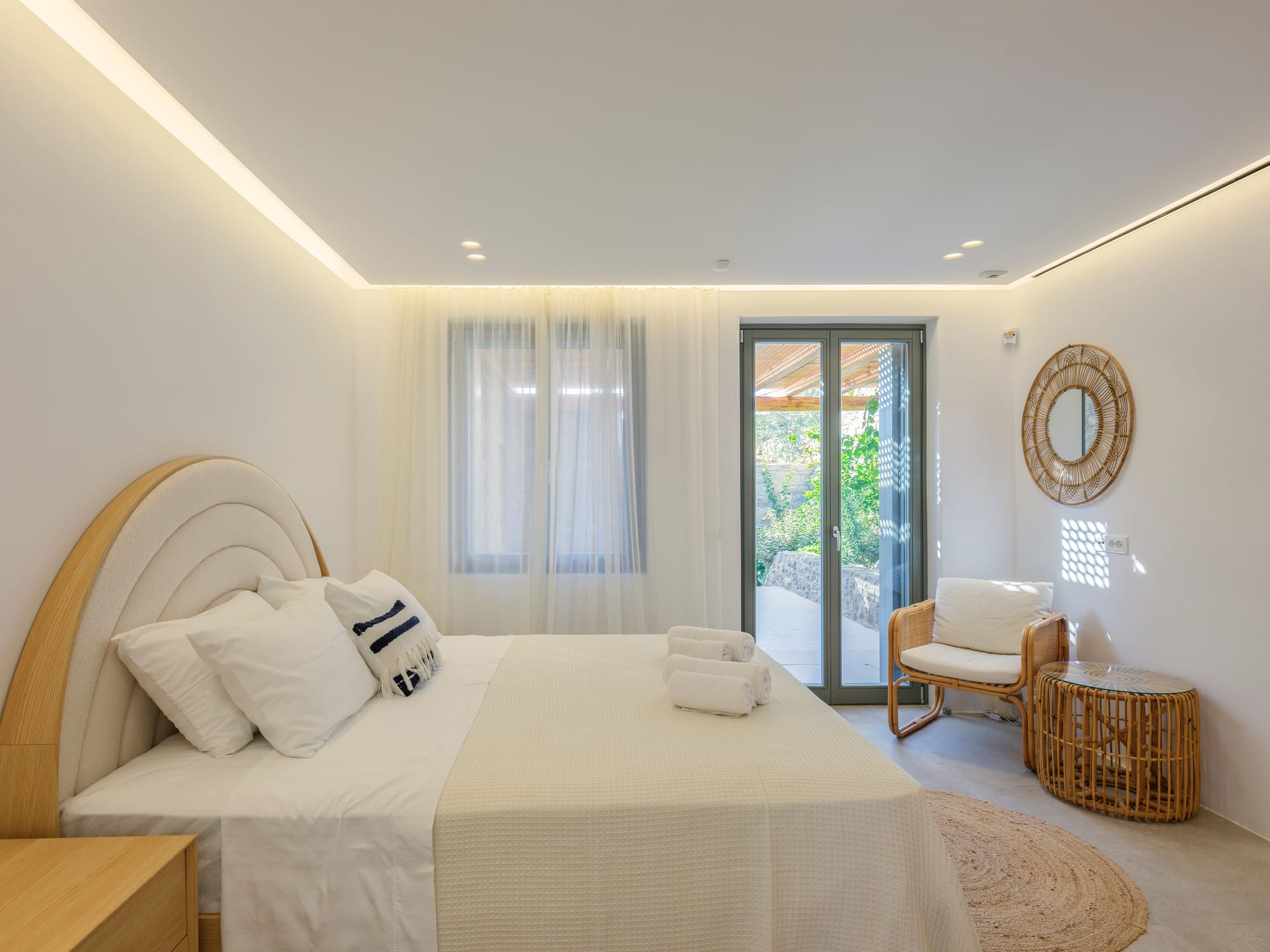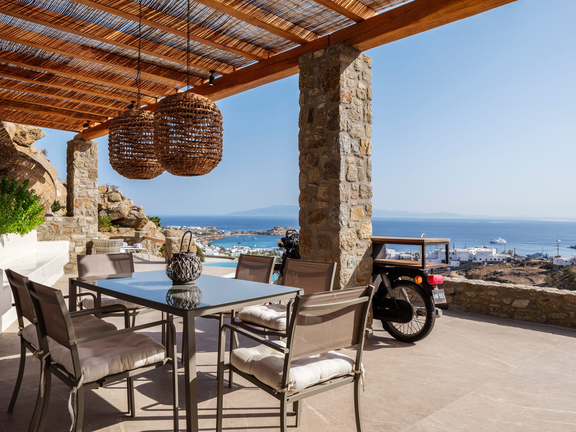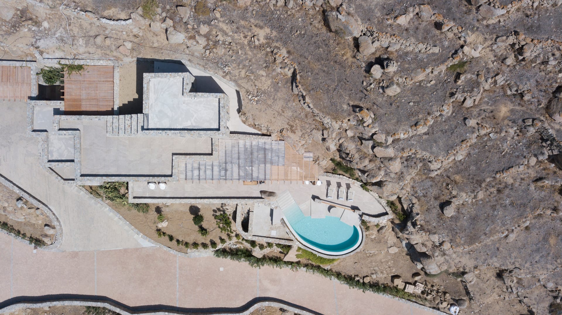 Hand-built stone walls convey an air of confidence, while traditionally rendered, round-edged volumes are flawlessly flat and smooth, adding to the property's sleek and contemporary aesthetic. Customary chestnut pergolas, a staple of Cycladic architecture, have been reimagined for enhanced structural integrity, forming a glue-lam beam lattice that elegantly shades and protects the extensive courtyard below.