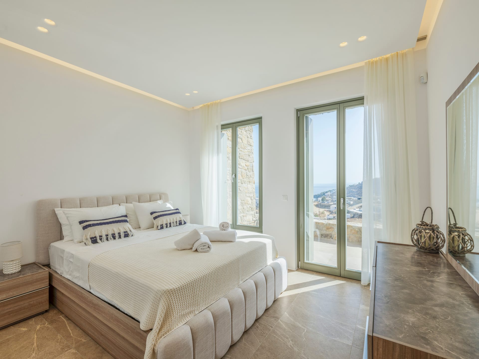 Positioned to perfection, the villa offers an unrivaled view that gazes directly onto the most sought-after bays of Platis Gialos, Paraga, and Psarou. This breathtaking vista is the backdrop to an exquisite property that seamlessly merges the past with the present.