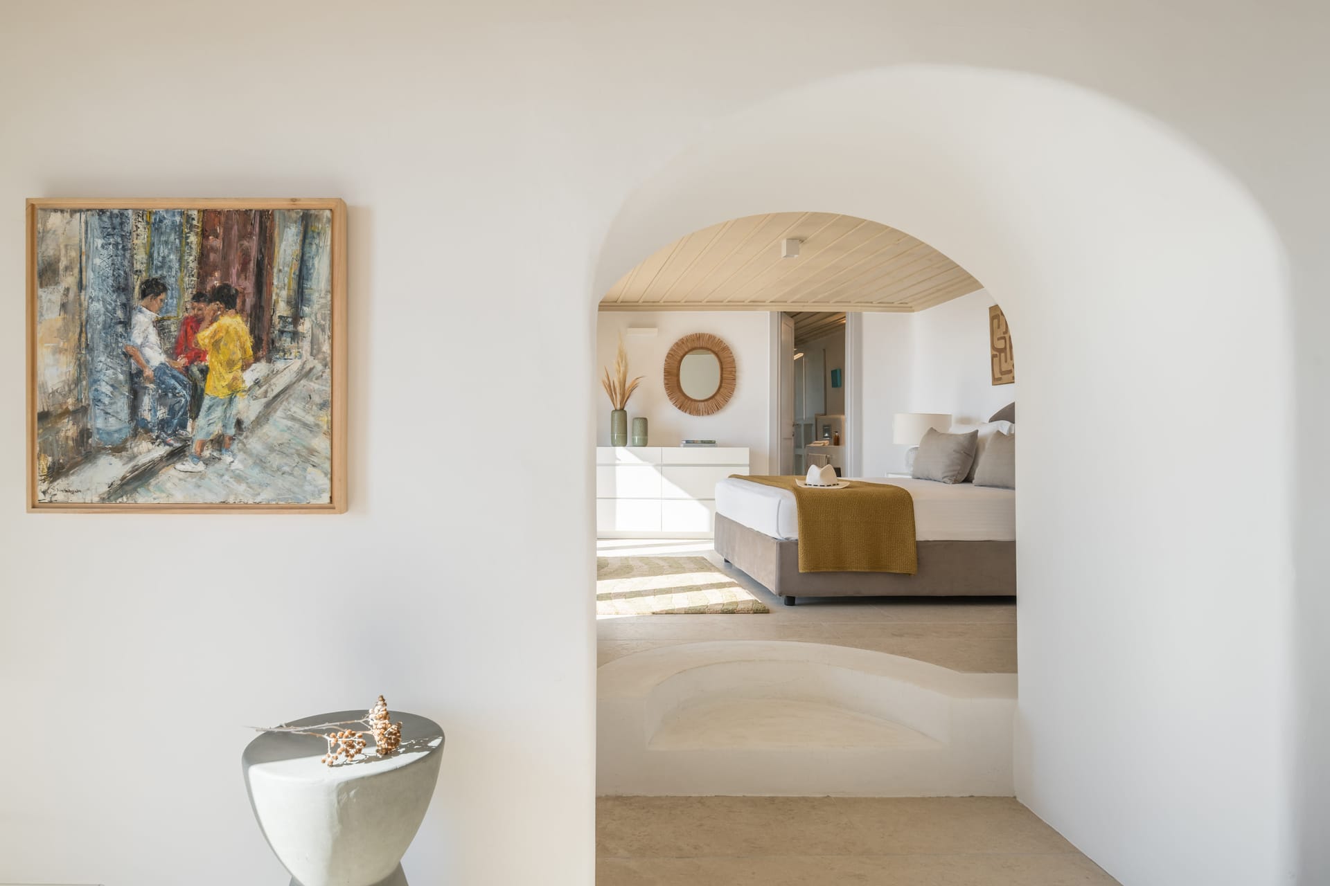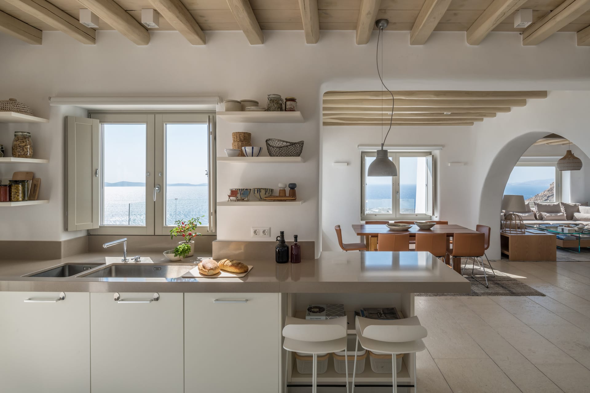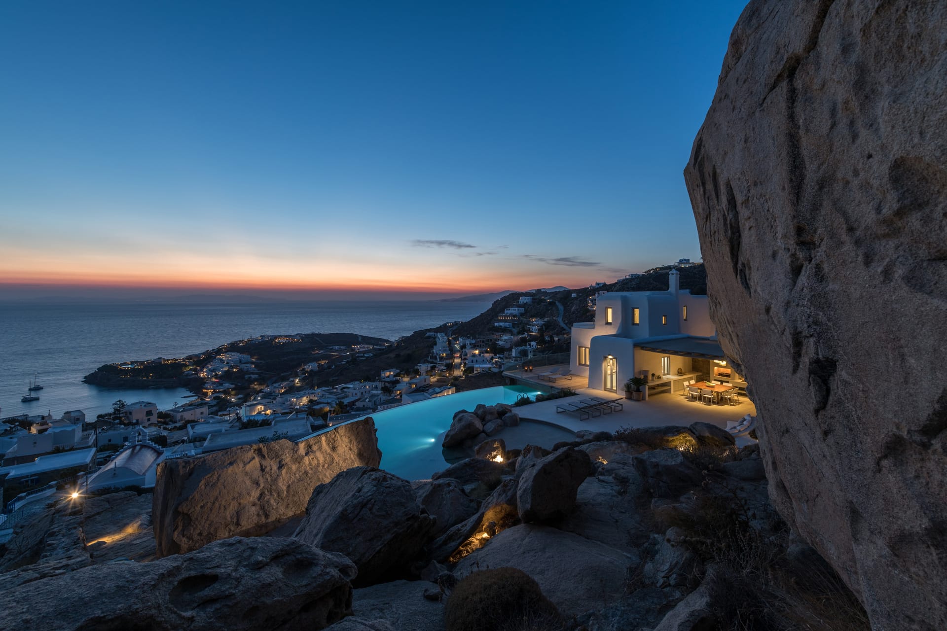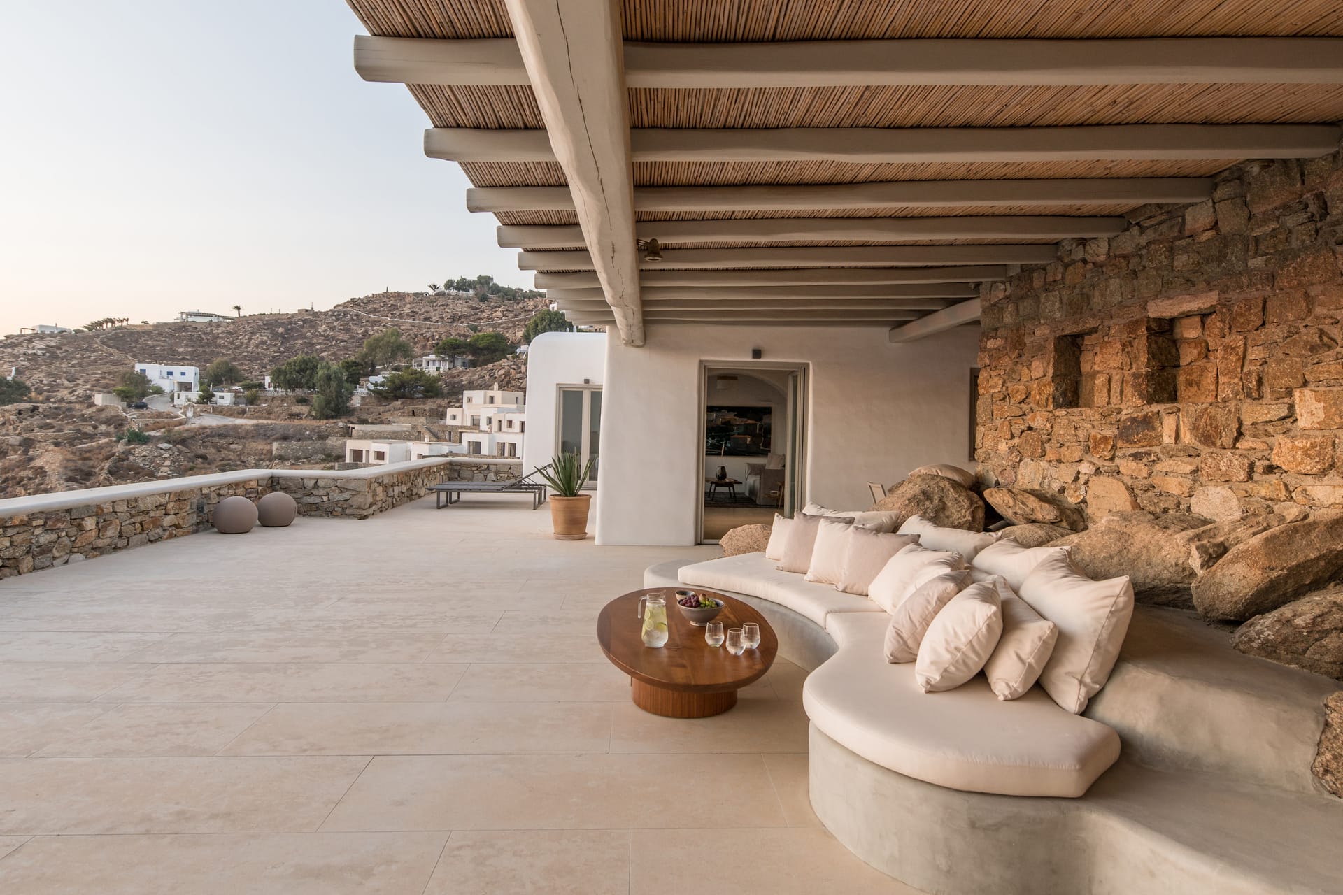 The villa's outdoor spaces epitomize Mykonian luxury: