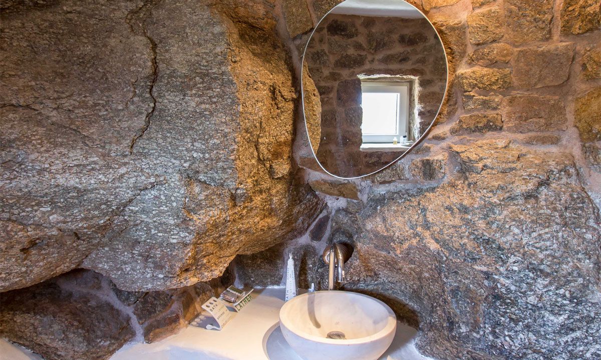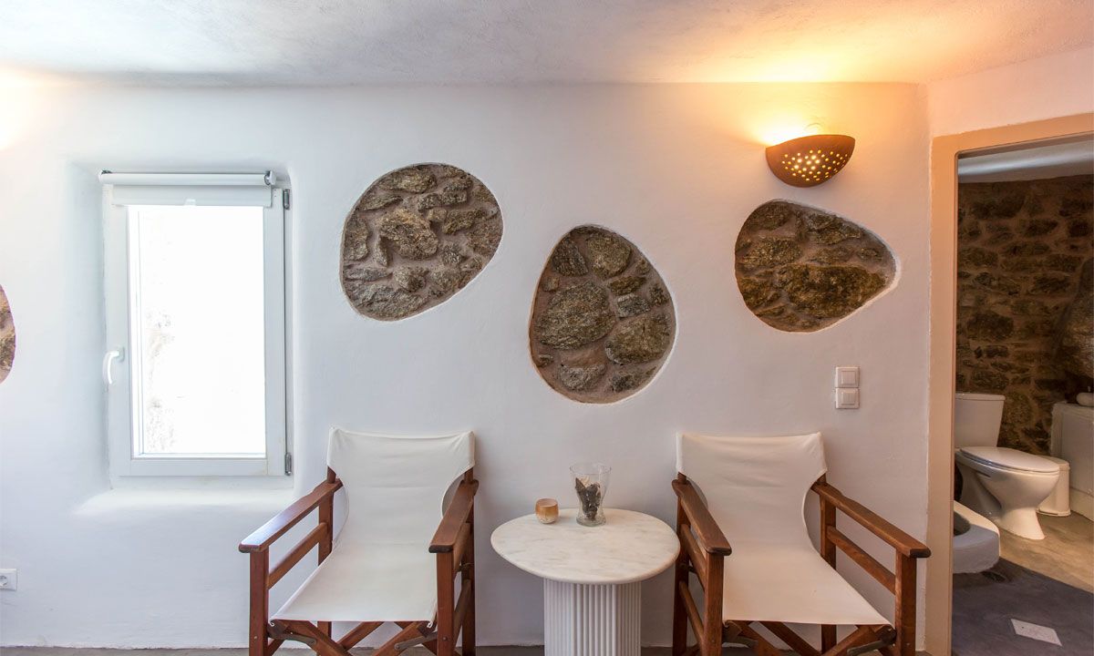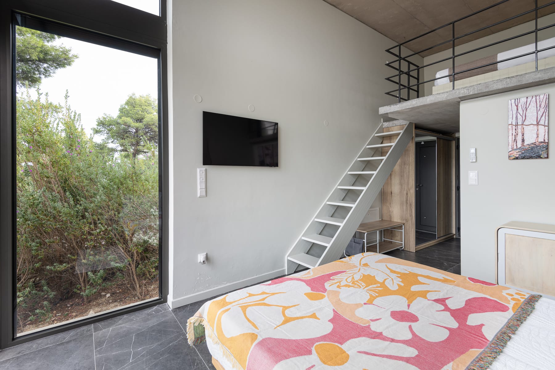 For those who prefer privacy, the detached guest house serves as a tranquil hideaway. It features a double bed on the ground floor, a lofted space with an extra double bed, and its own ensuite bathroom. The guesthouse is also equipped with a compact kitchenette, an espresso machine, a flat-screen TV, and an artistic air conditioning unit. Guests can step outside to their private patio and soak in the surrounding beauty.