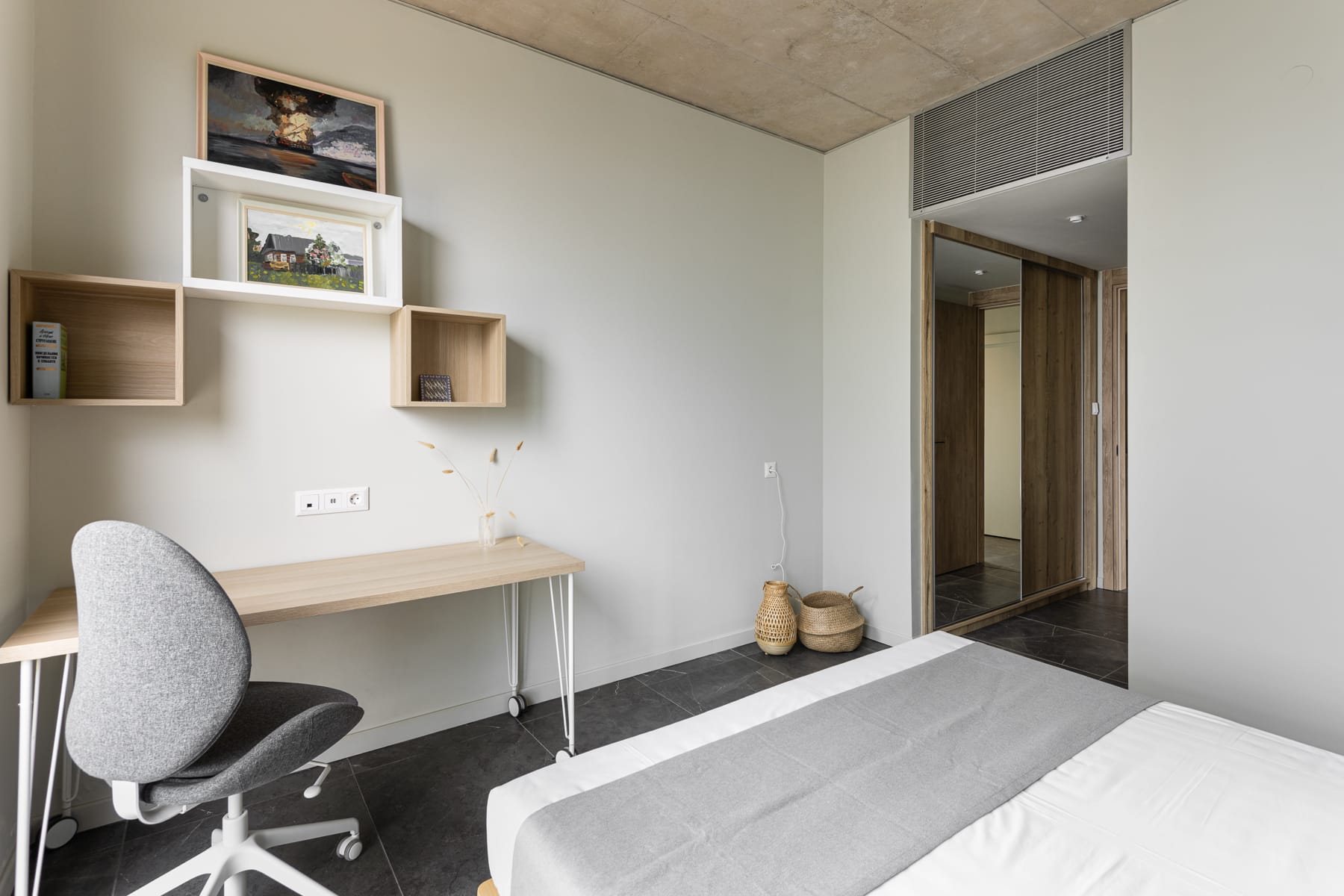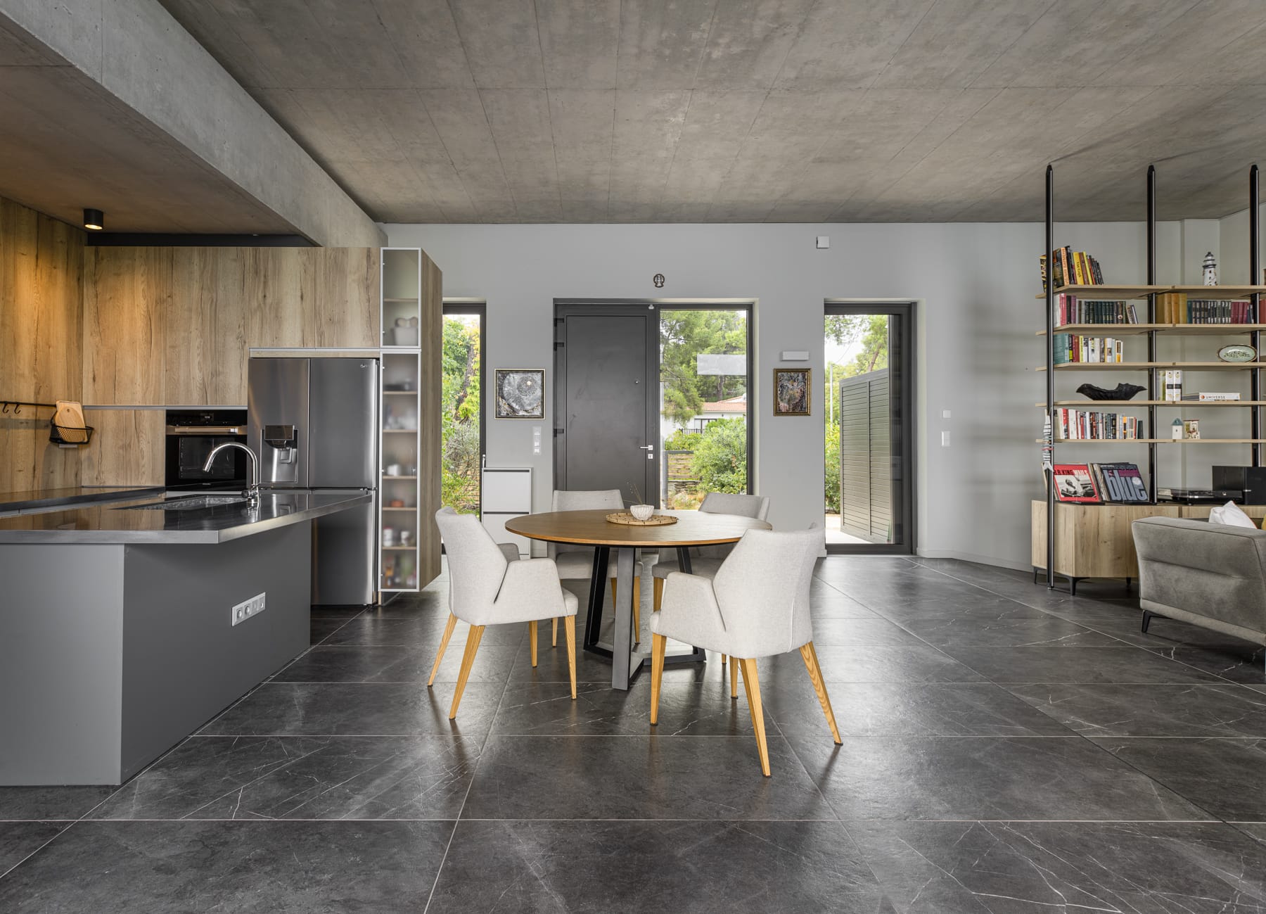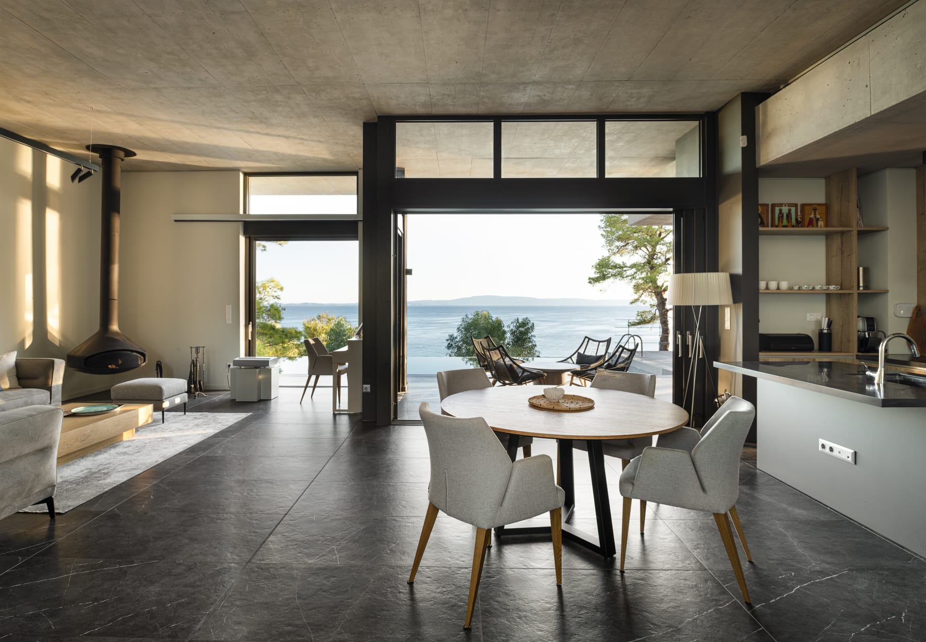 The villa invites you into a bright, open-concept living area, where a cozy fireplace and a state-of-the-art projector set the perfect atmosphere for relaxation and entertainment. The spacious dining area seamlessly connects to a contemporary, fully equipped kitchen, complete with high-end appliances such as a wine fridge, dishwasher, and espresso machine, providing a refined and effortless experience.