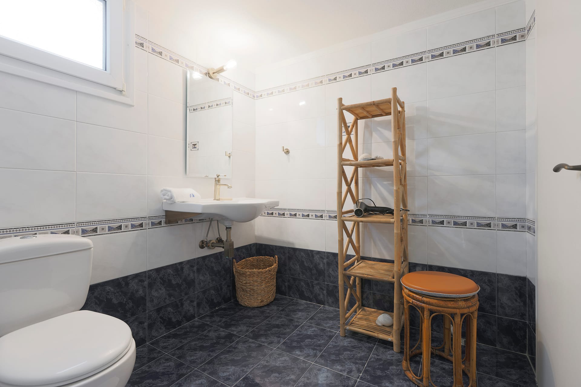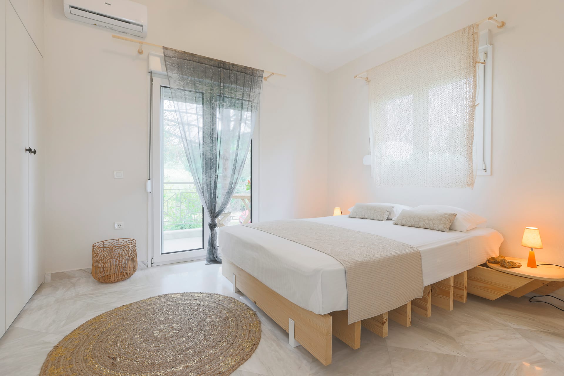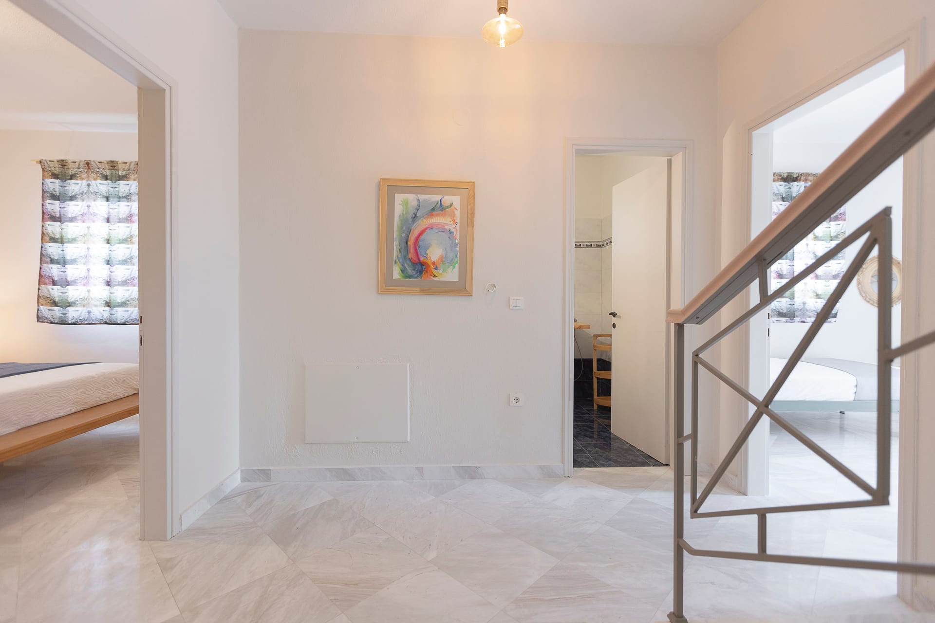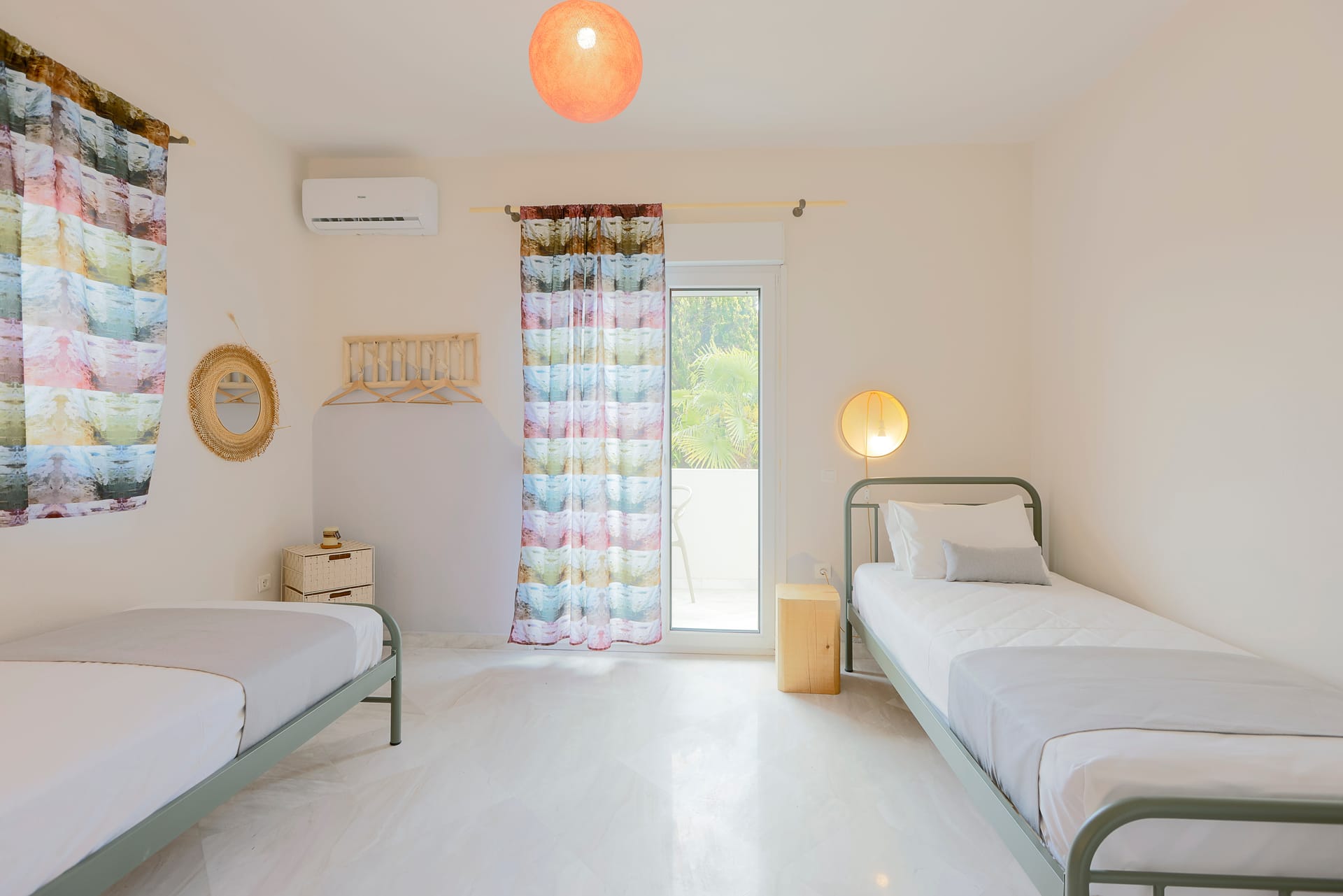 Partly underground, there are two more bedrooms, one with a double bed and one with two single beds and anA/C unit in each and one more bathroom with a bathtub is found here!
