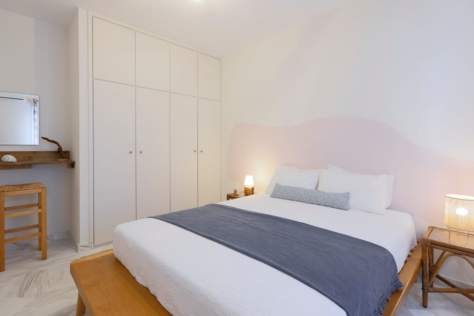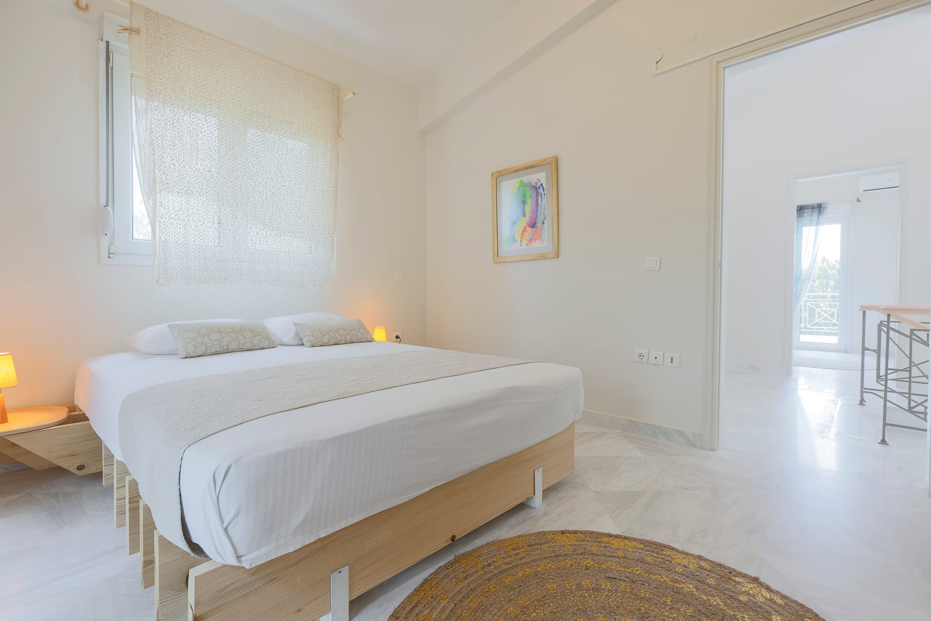 By entering the villa,guests benefit from the spacious living room with a flat screen tv and an A/C unit.There is also a fully equipped kitchen, with all the essential appliances such as Nespresso machine, dishwasher, oven, stove top and a microwave.