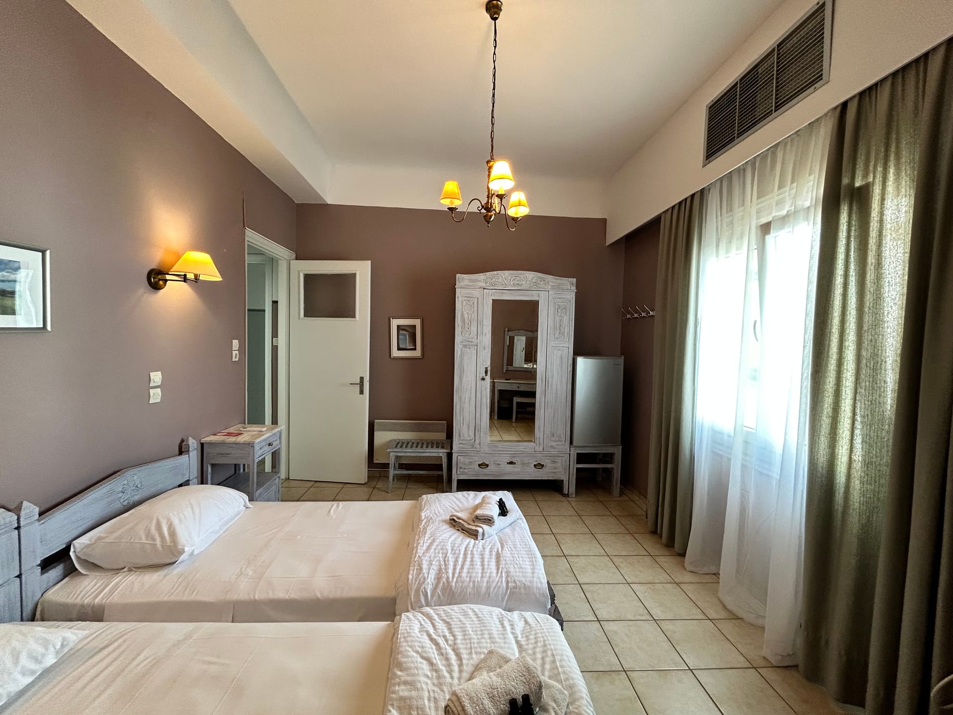 The bedheads of our cozy beds are hand painted; they symbolically depict the famous ships of Zagora, which used to sail off our beach and reached all big ports of the East and the West, during the 16th and the 19th century. Our bed mattresses are all luxurious and comfortable and offer you unique moments of relaxation.