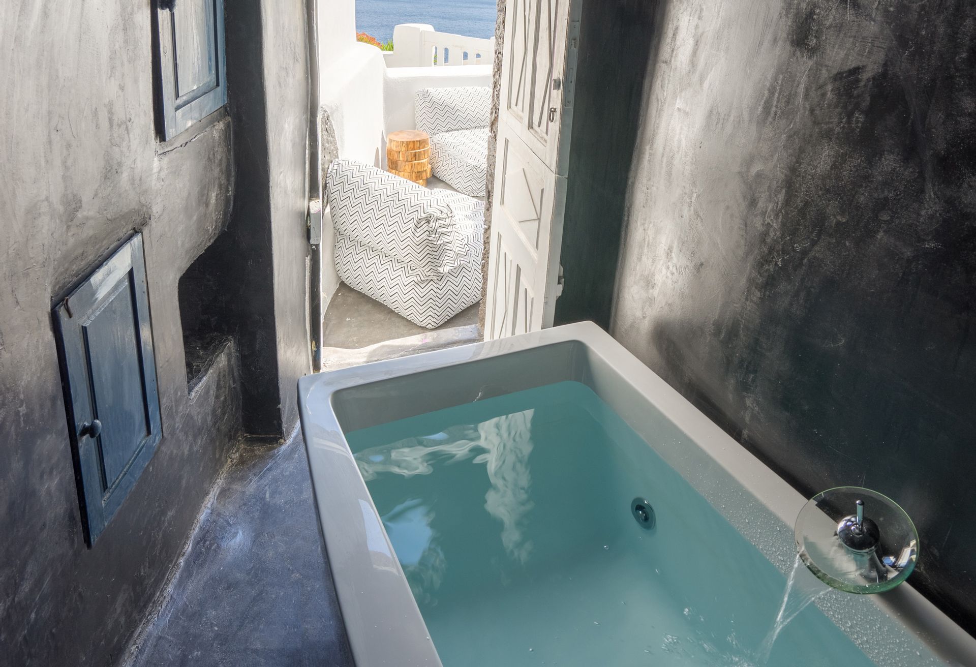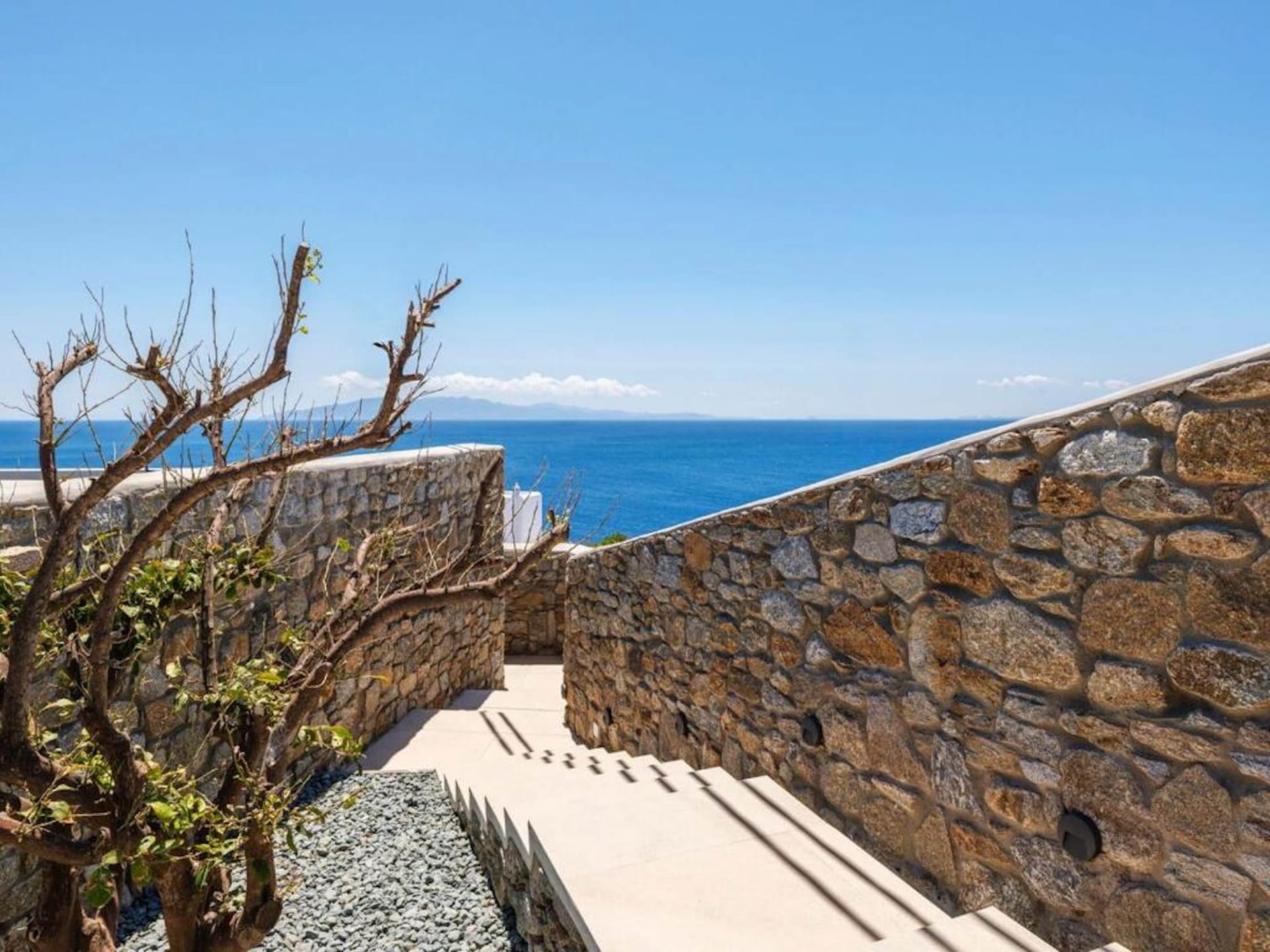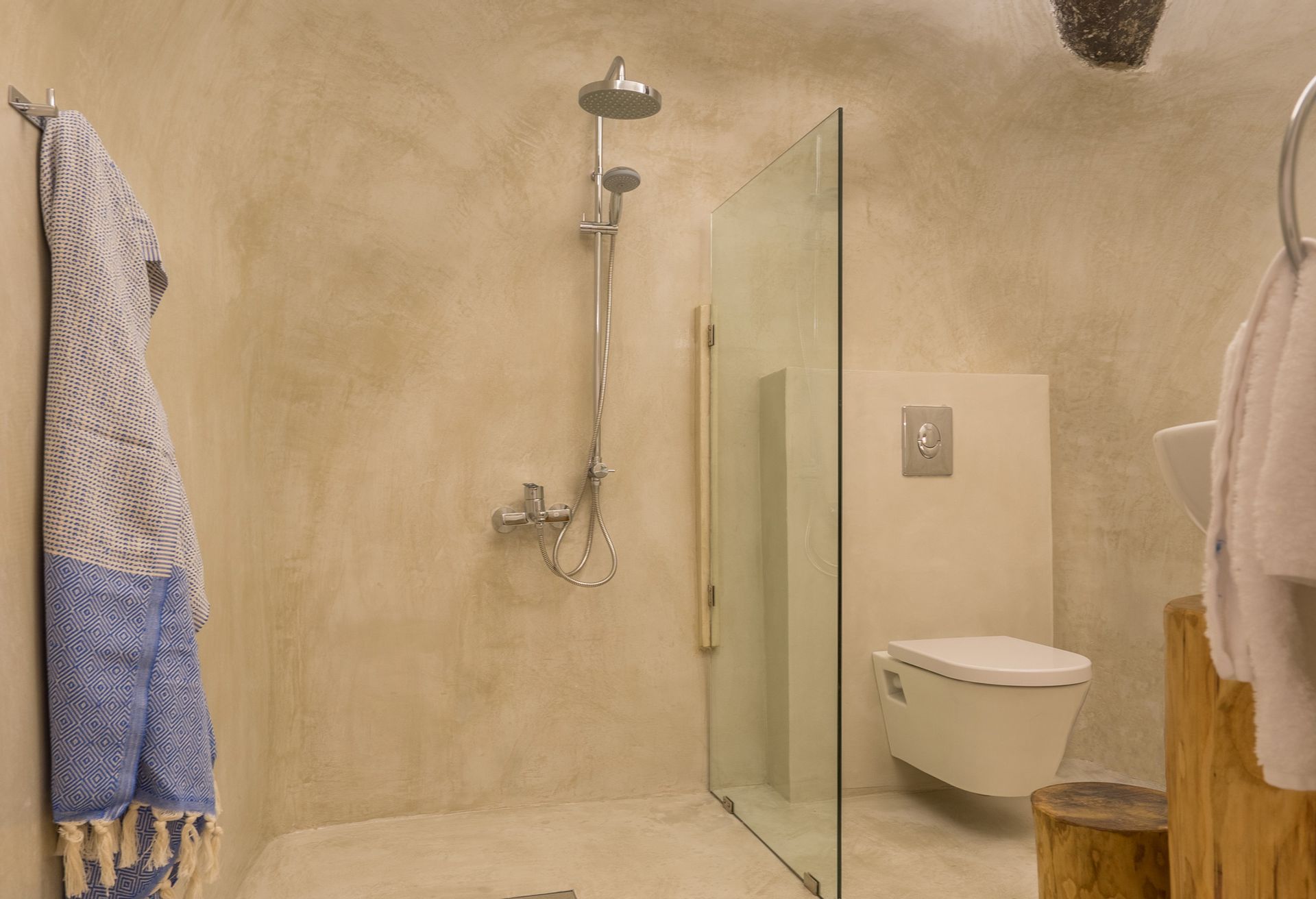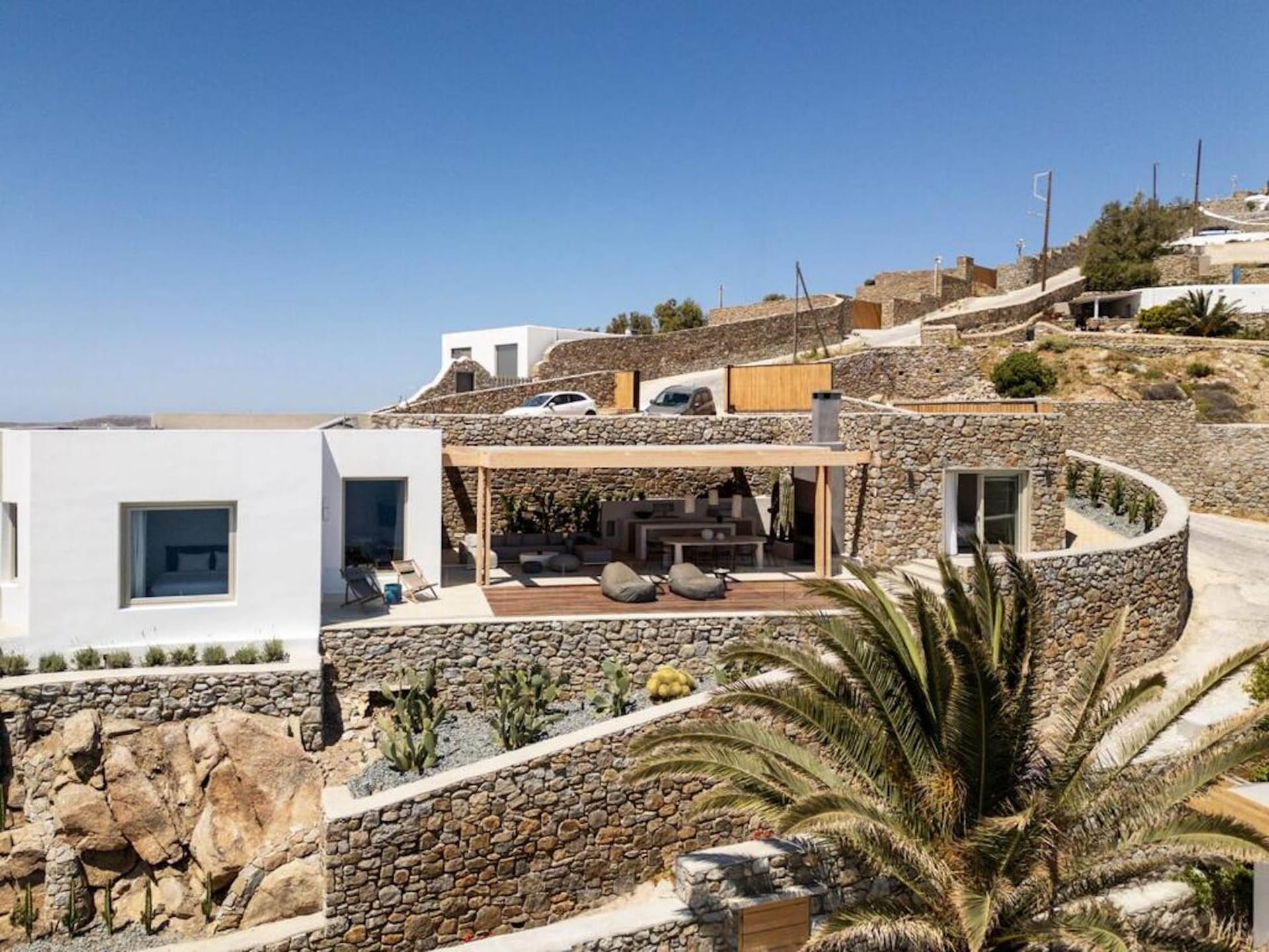 An outdoor stone-built staircase by the pool takes you to a small balcony and a detached classic-styled bedroom with a double bed, a sofa bed, a flat screen TV and an en suite bathroom.
