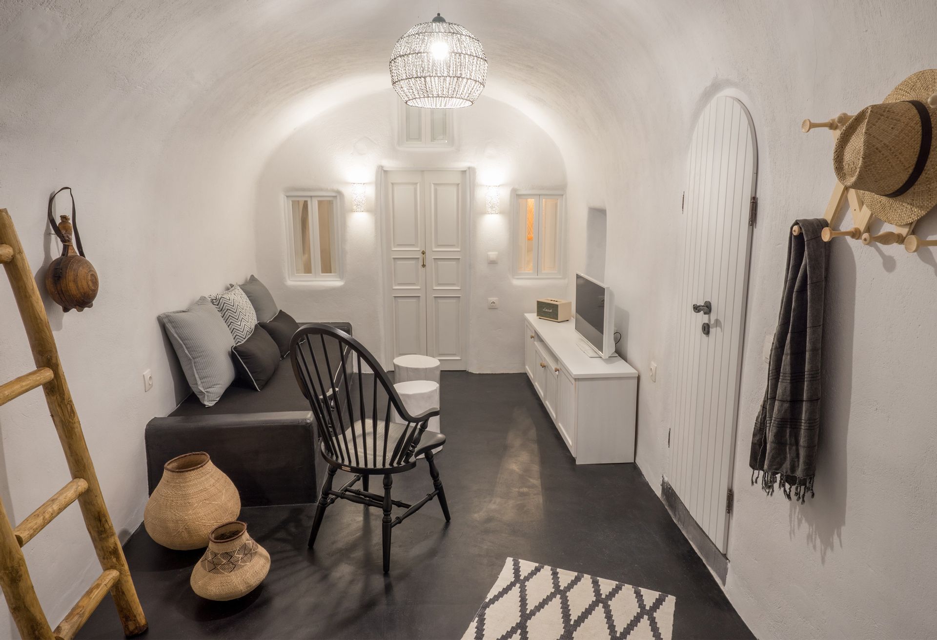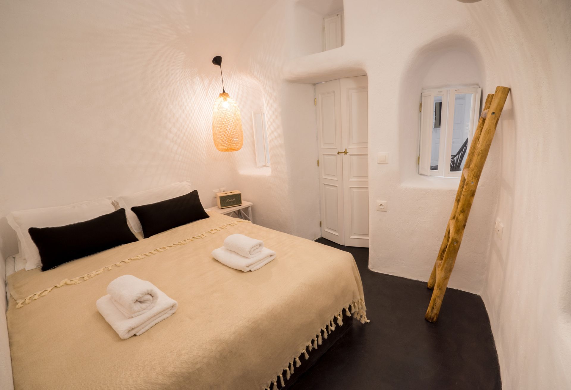 On the left side of the kitchen, a small staircase takes you downstairs to a bedroom with a double bed, a sofa bed and an en suite bathroom. This room can also be accessed from the outside, as it has its own individual entrance.