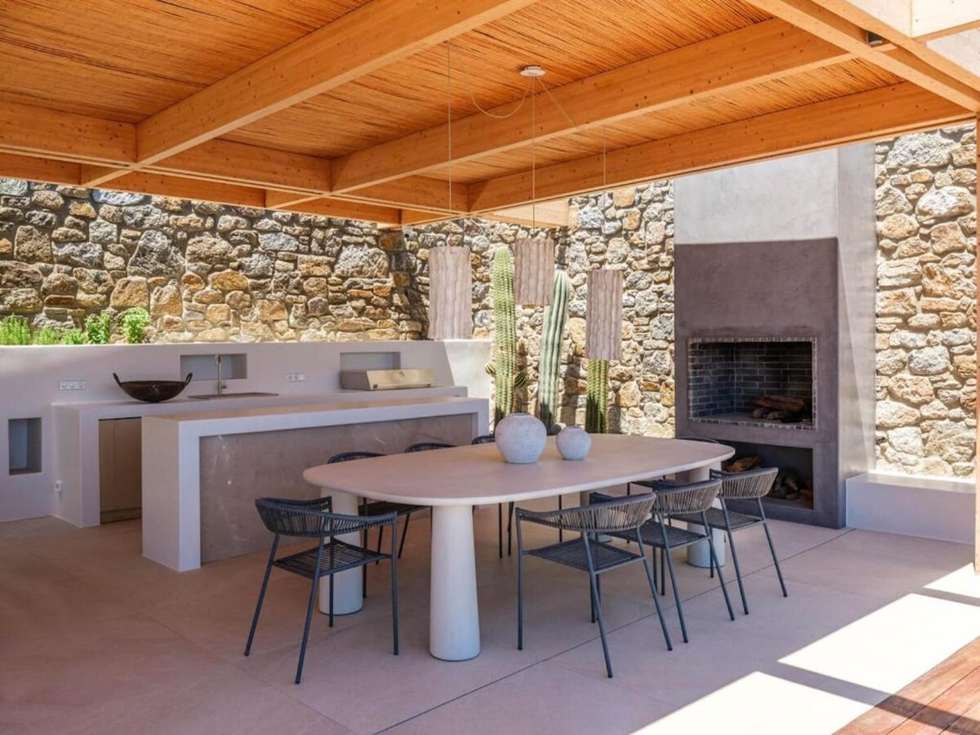The living room area has direct access to the private swimming pool, which is surrounded by olive trees and colourful flowers. There are sunbeds around to relax by the pool, an outdoor dining area, a barbecue to prepare meals and a ping pong table for fun!