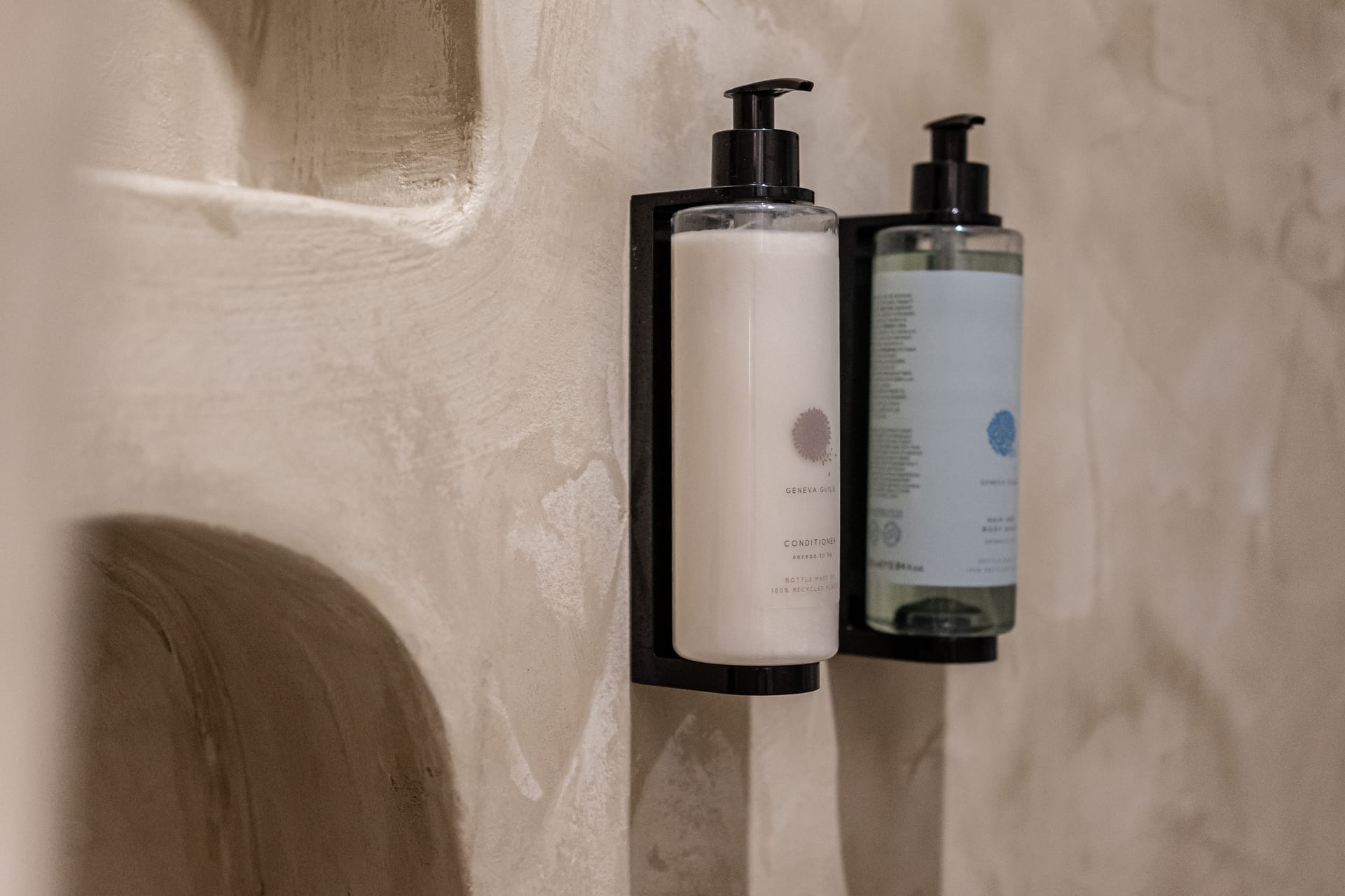 The bathroom complements the overall accommodation experience with refined details and a spacious walk-in shower featuring a rain shower, offering soothing moments reminiscent of a private spa.
