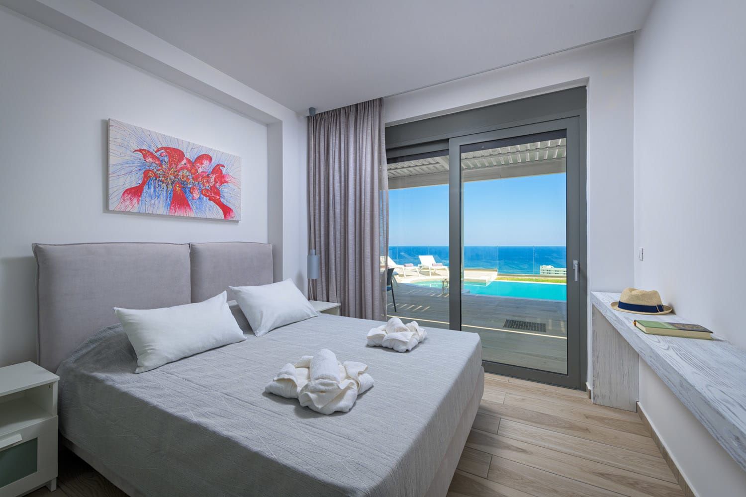 The one-bedroom suite is deployed in a total area of 67 sq.m on one level, comprising of a fully equipped kitchen and a living room with an expandable sofa bed that can easily accommodate up to 3 persons. Charlotte suite features full air conditioning, WIFI, TV and alarm system. The Charlotte Suite comes complete with a sun-kissed outdoor area with breathtaking sea-views and a dazzling shared pool with its sister Charlene Suite in Tourlos.