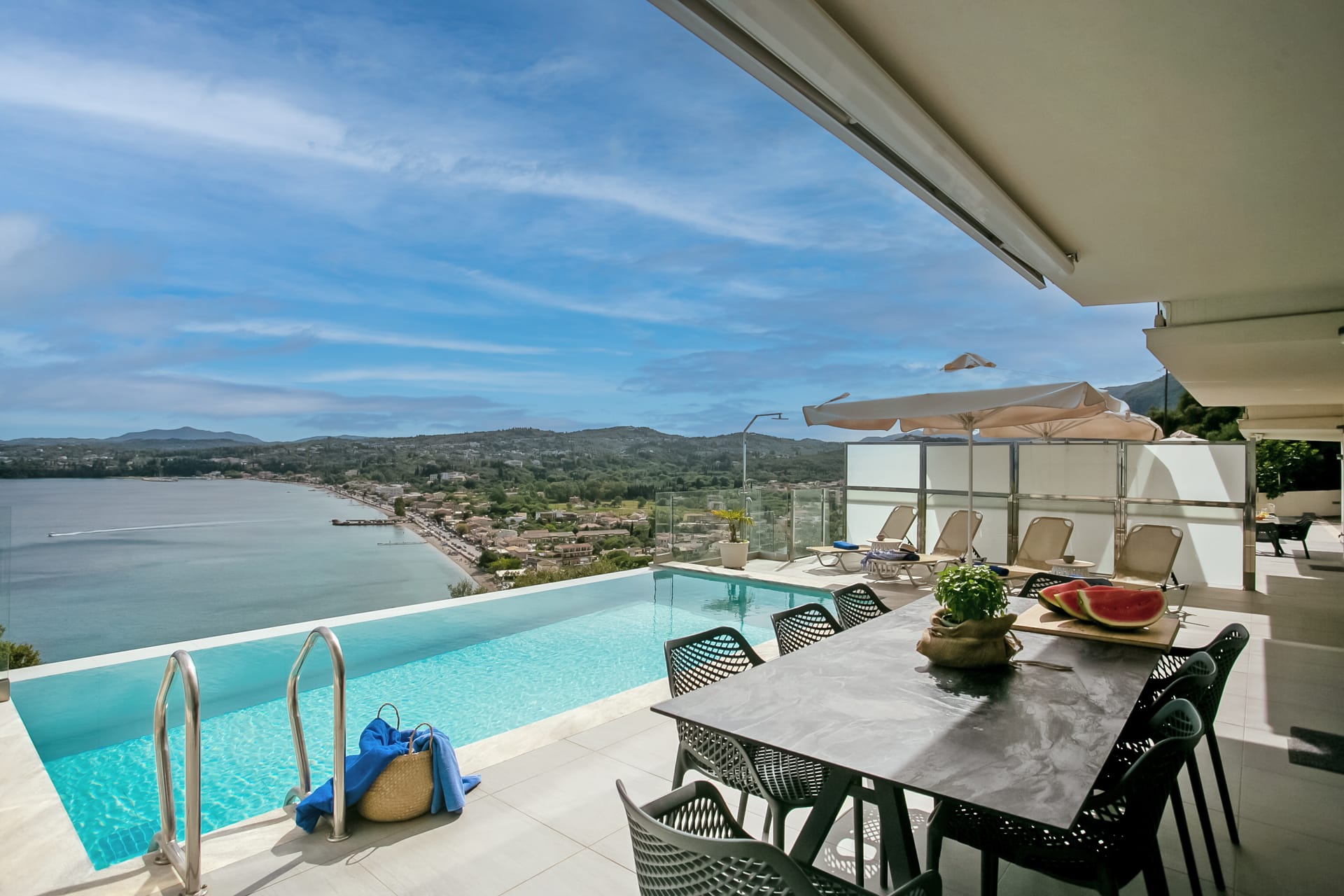 The Villa is split in two levels. The Pool level where the shared pool is, along with two outdoor dining areas and barbeque. As you enter inside the villa, you can find a beautiful spacious living room where you can enjoy unforgettable relaxation moments. Next to the living area is the dining table where comfortably sits 6 people. In this level there is also a fully equipped kitchen with all modern appliances as well as a guest WC.