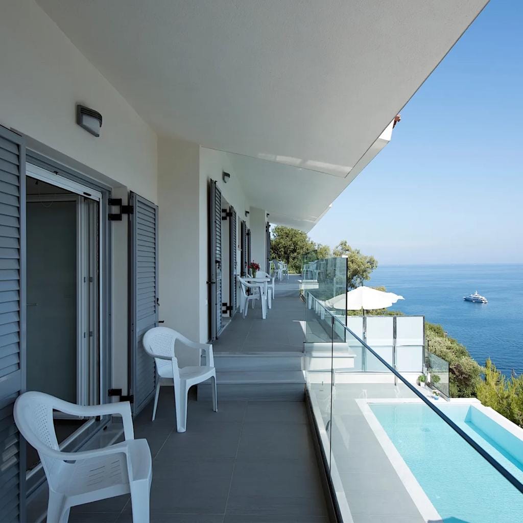 - Two-level guest house: Master bedroom, en-suite bathroom, air-conditioning, living area with double sofa bed, fully equipped kitchen, sea view