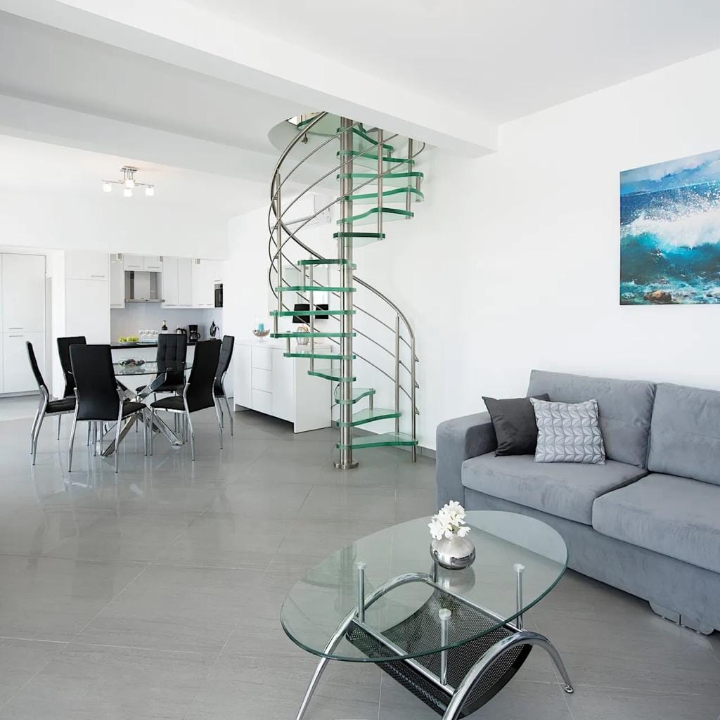 - Lower level guest house: Master bedroom, en-suite bathroom, air-conditioning, living area with sofa, kitchenette, a WC, sea view