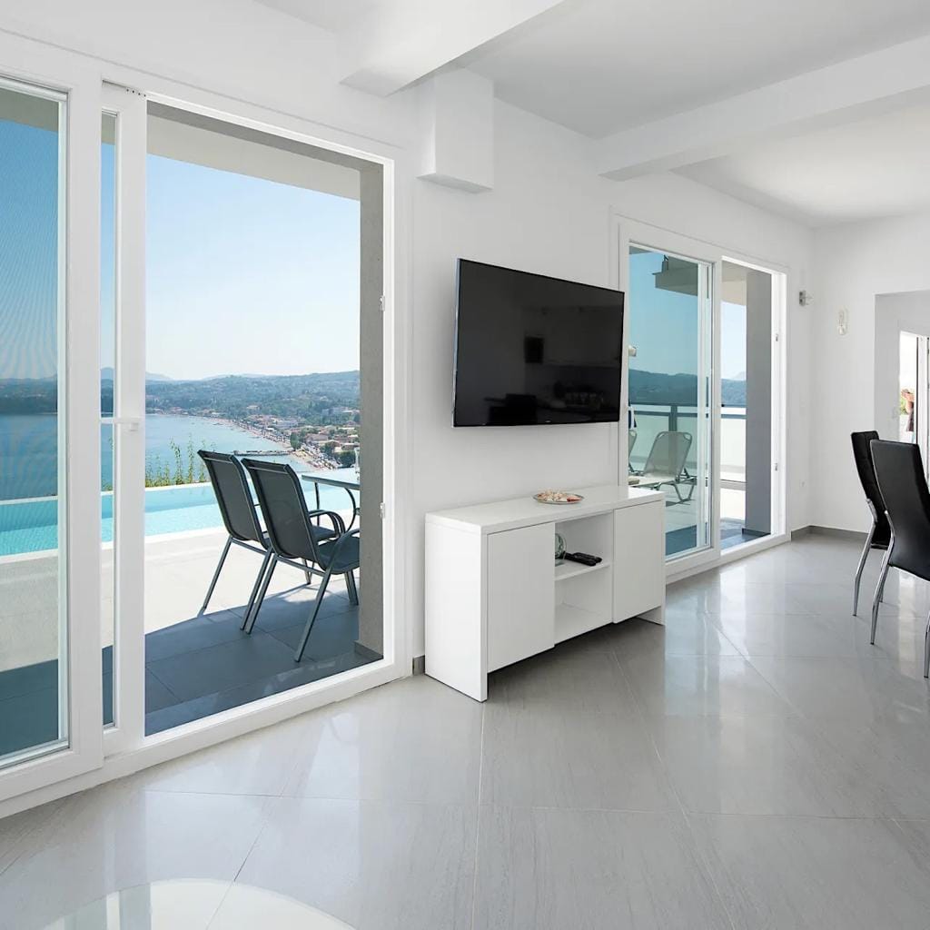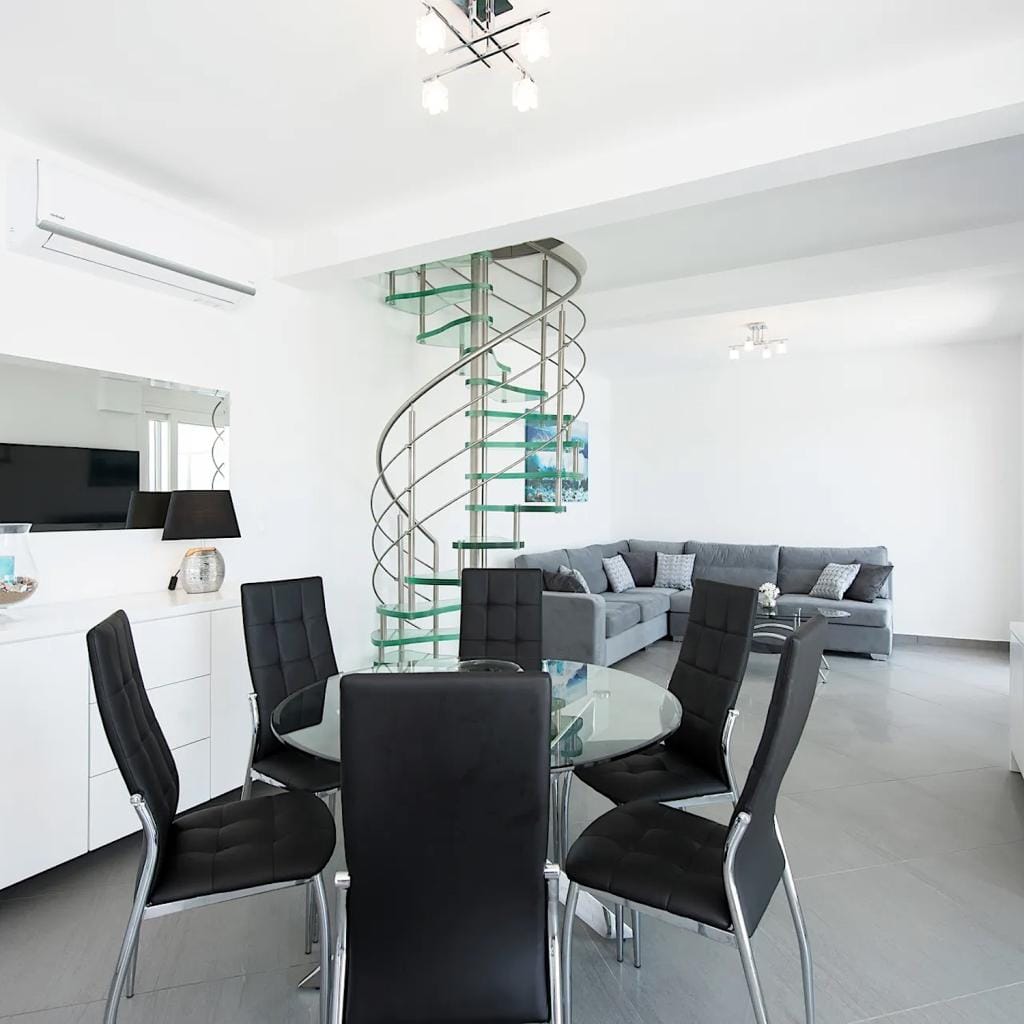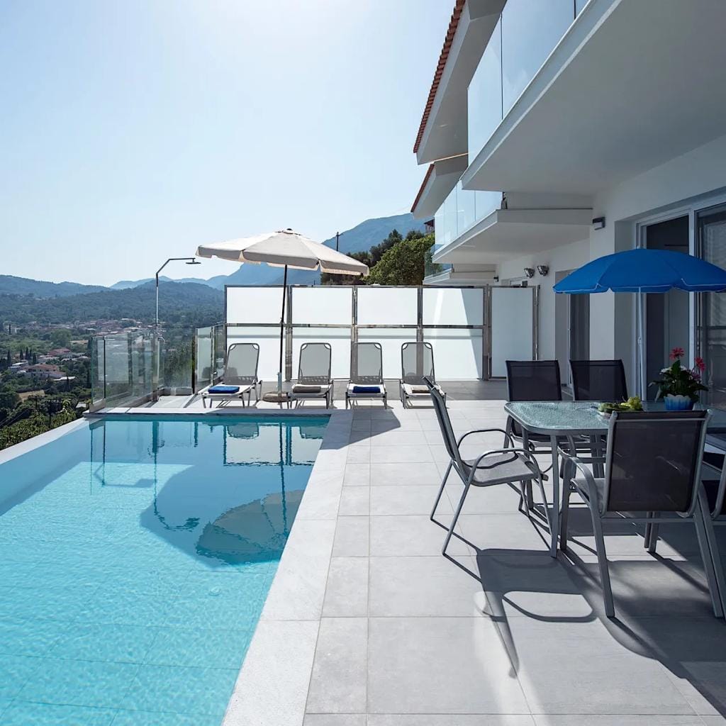 A total of 5 bedrooms and 5 bathrooms, 3 of which are en-suite, will accommodate up to 14 people. The layout of Gialos Mansion consists of a main house with 2 double bedrooms which share 1 bathroom, a spacious living room and dining room and a fully equipped kitchen. The attic suite above consists of 1 bedroom with an en-suite bathroom and a sitting area which features a double sofa bed. All bathrooms are newly renovated and the deluxe eco-friendly Cocomat mattresses through and through will ensure a restful night’s sleep. Sweet dreams are complimentary!