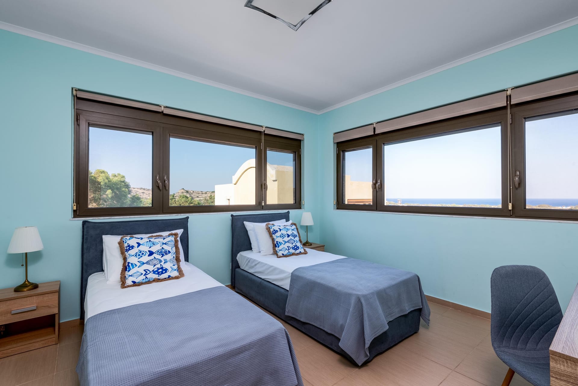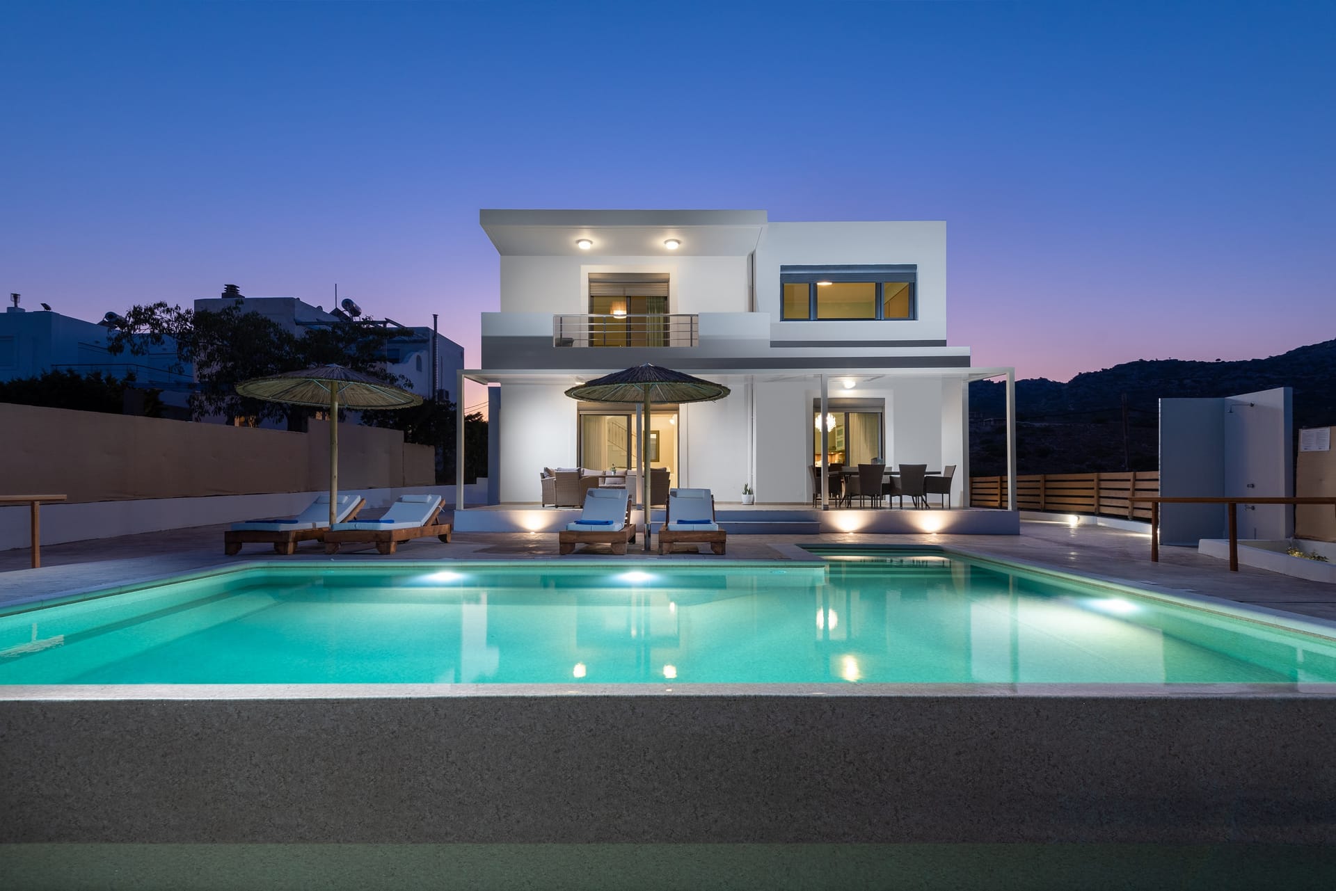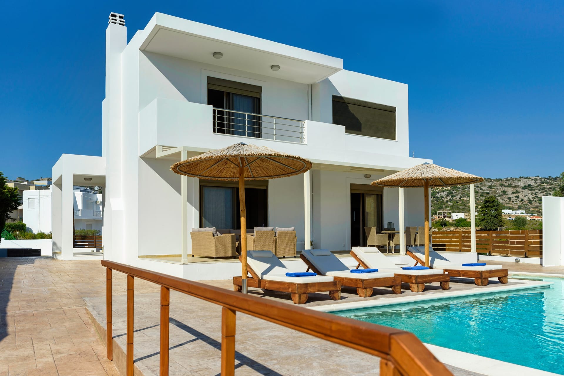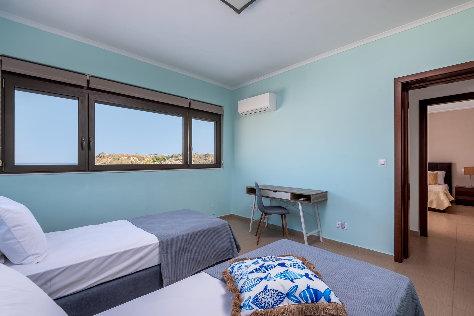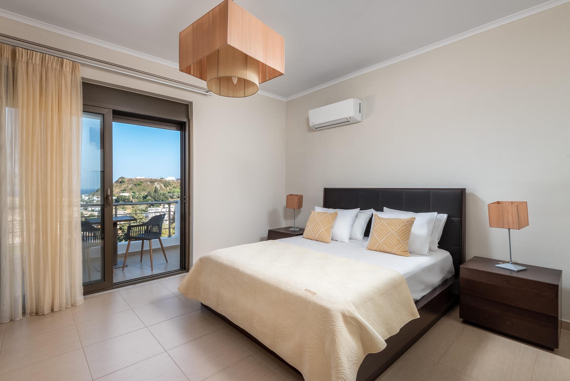 Acro Villa hosts up to 7 guests with 3 modern fully air-conditioned bedrooms. On the first floor, there are 2 bedrooms with double beds, and on the ground floor, a bedroom features 2 single beds and a comfy single sofa bed in the living room. There are 2 stylish bathrooms, one with a shower and one with a bathtub.
