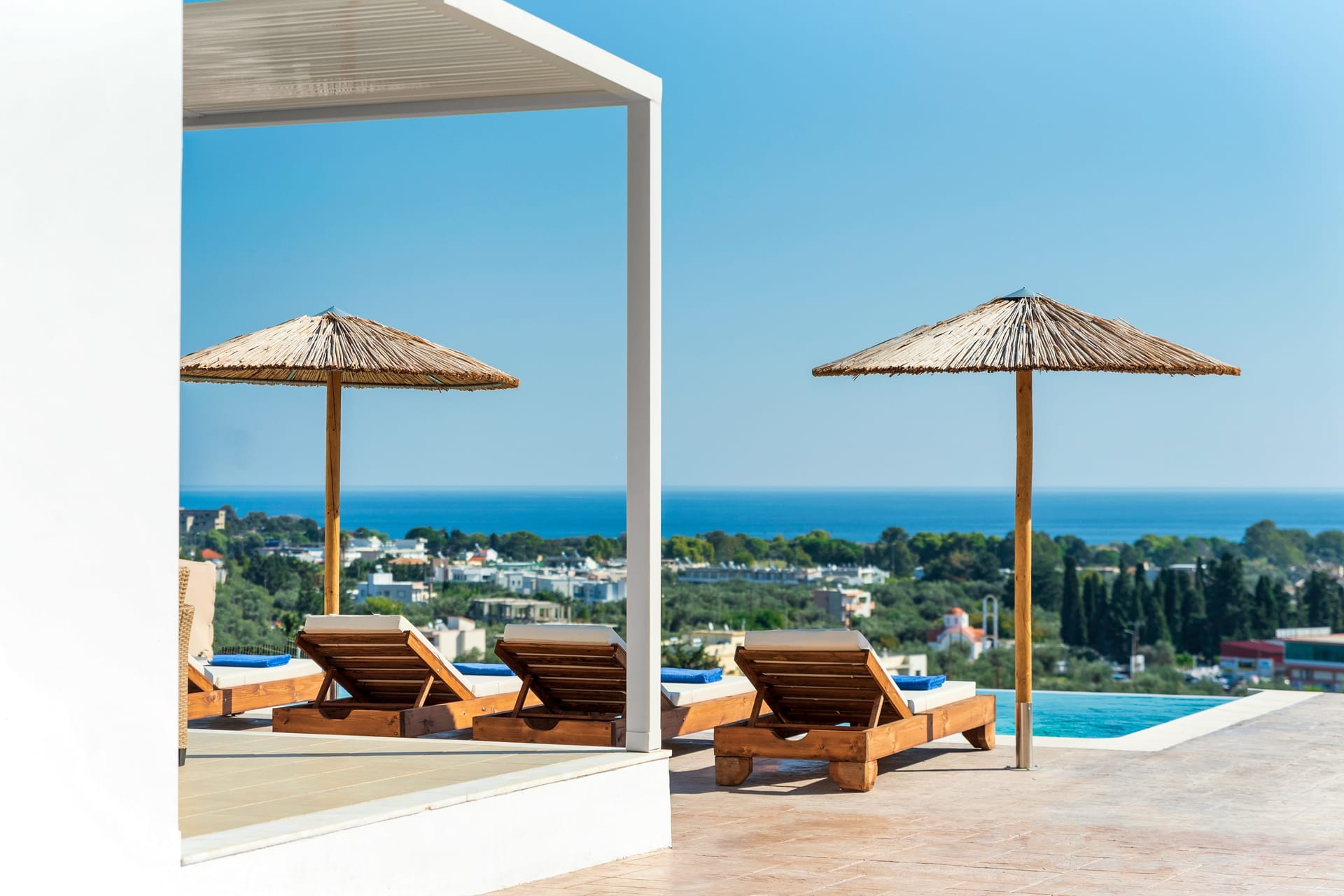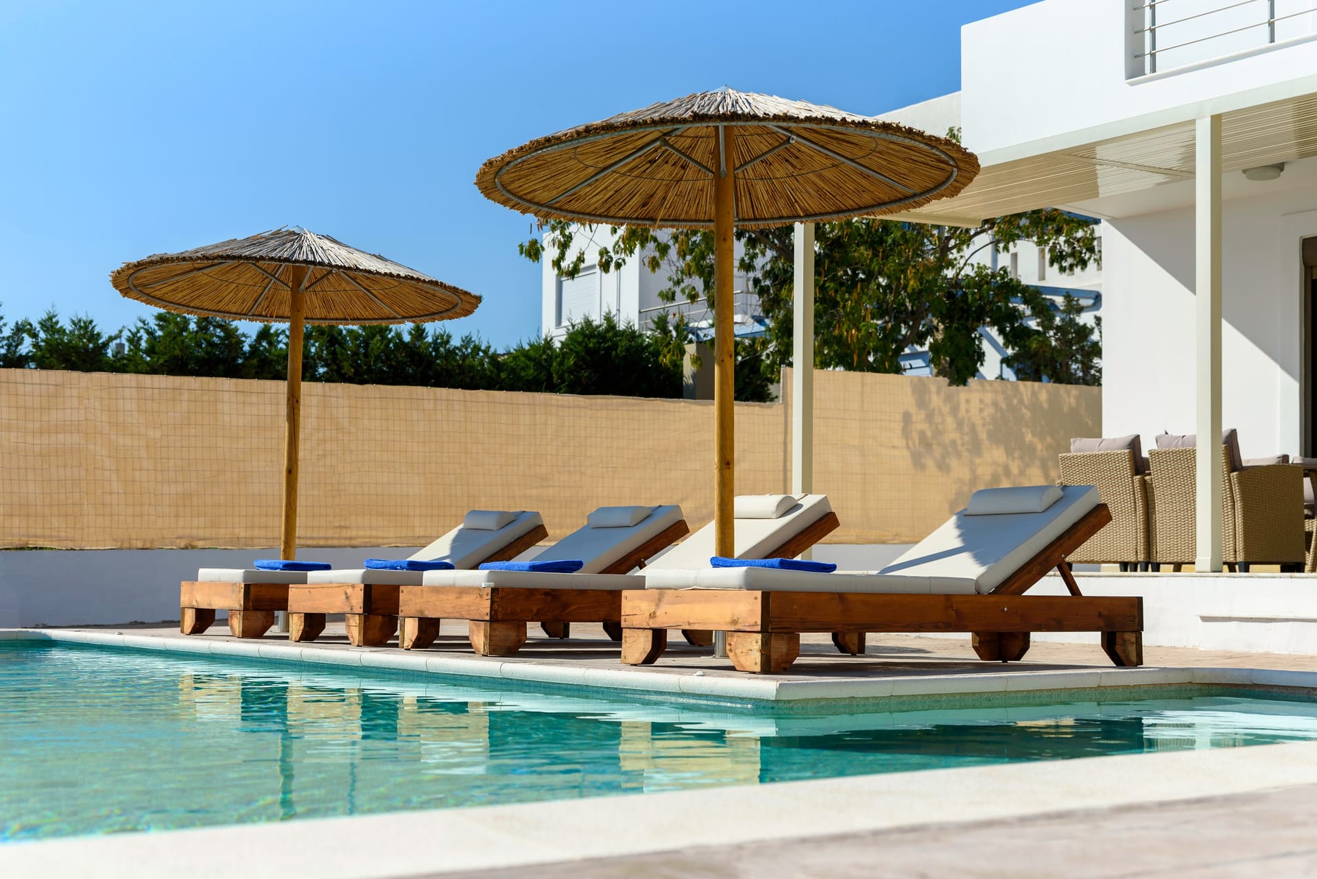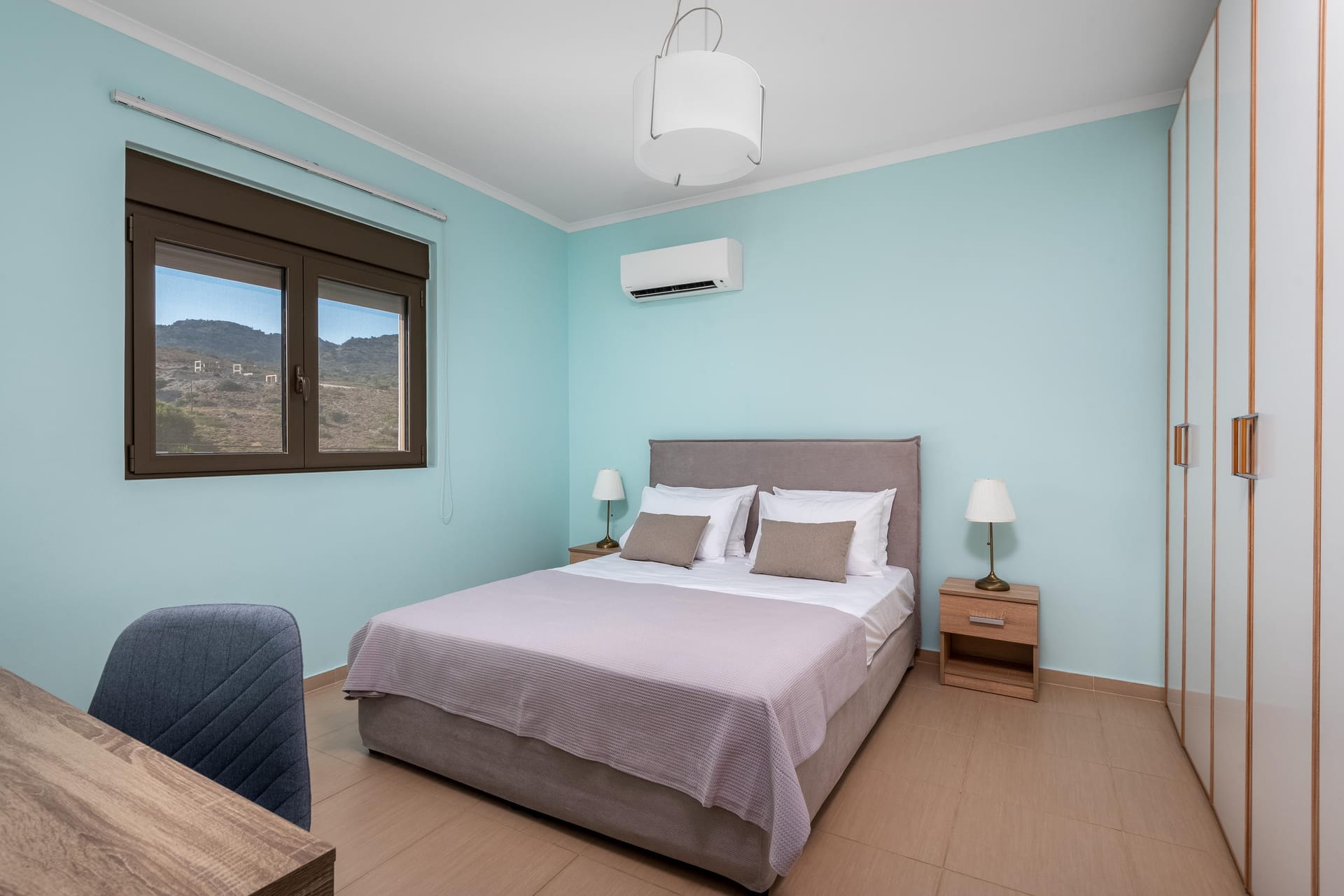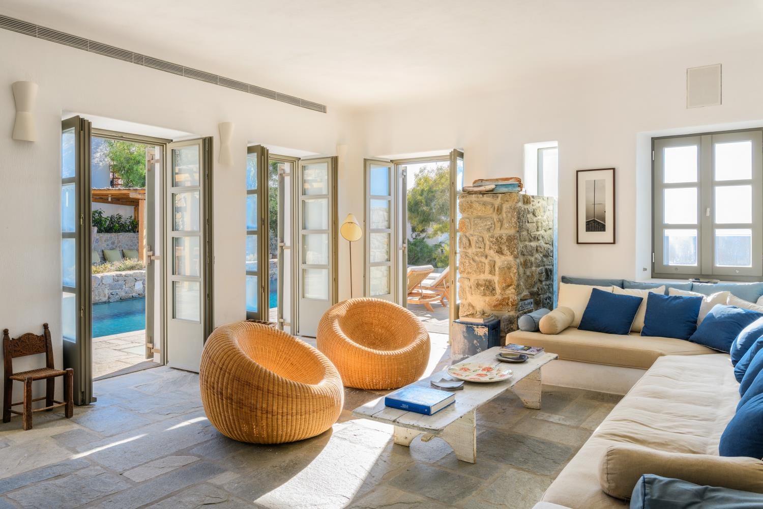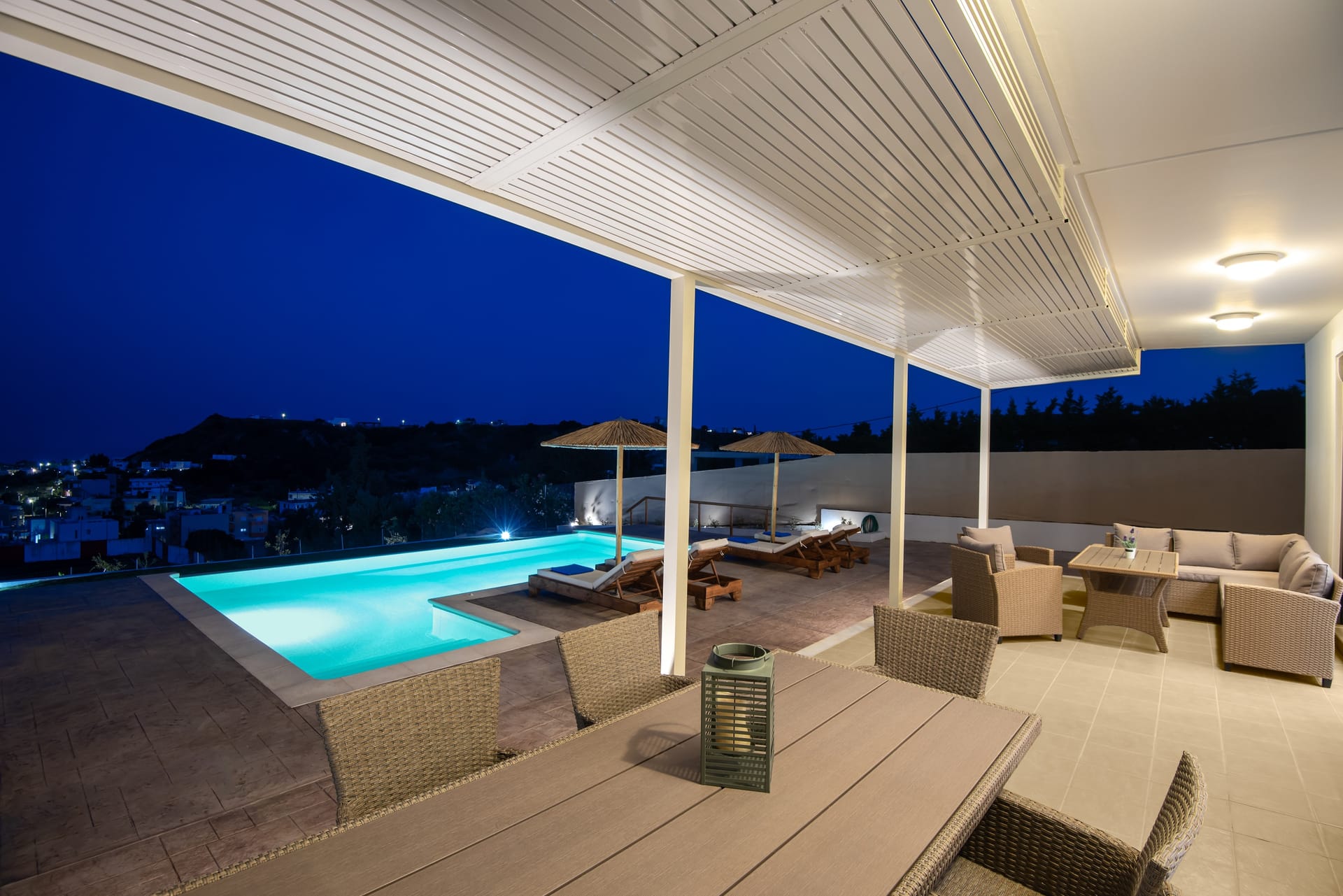 Acro Villa hosts up to 7 guests with 3 modern fully air-conditioned bedrooms. On the first floor, there are 2 bedrooms with double beds, and on the ground floor, a bedroom features 2 single beds and a comfy single sofa bed in the living room. There are 2 stylish bathrooms, one with a shower and one with a bathtub.