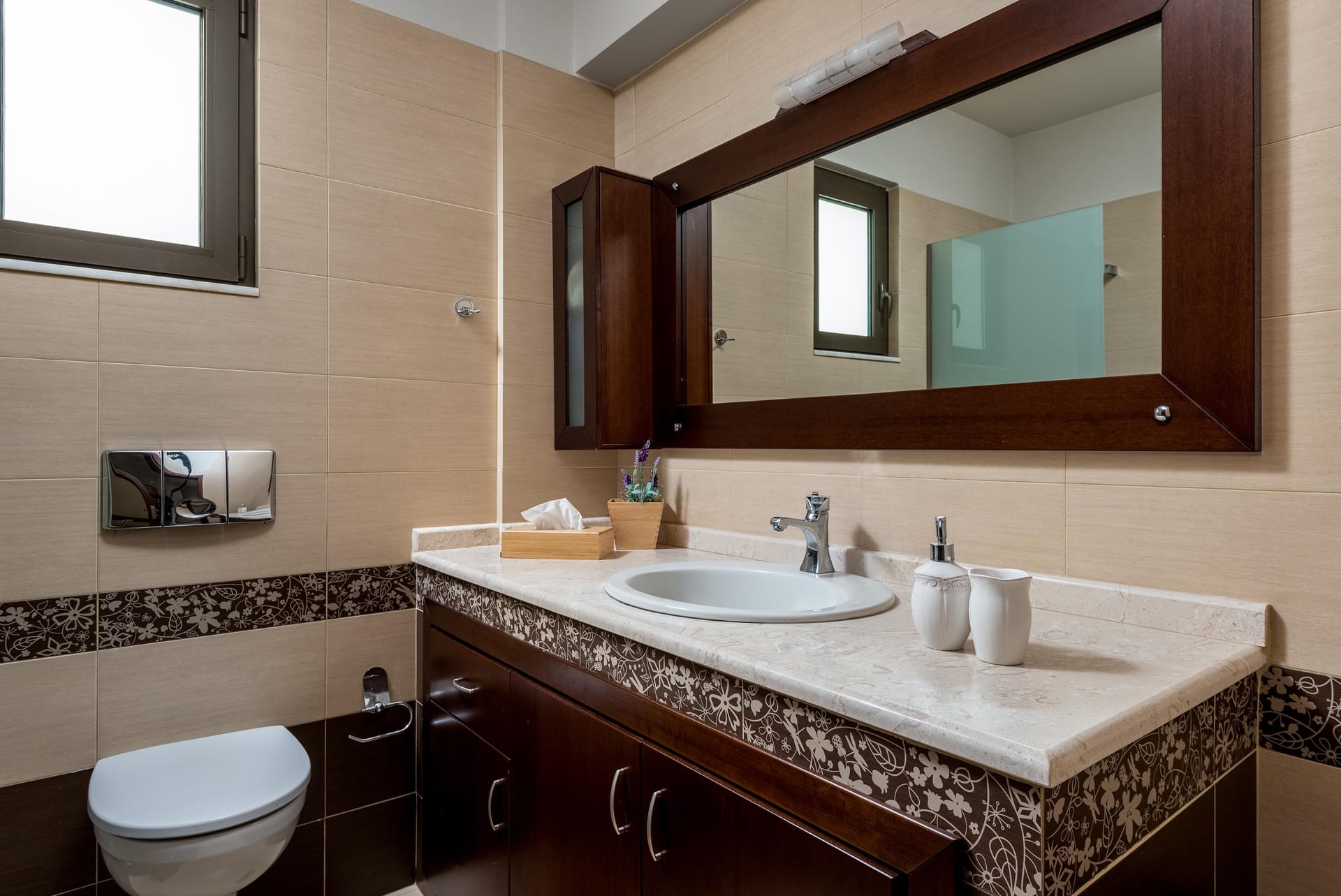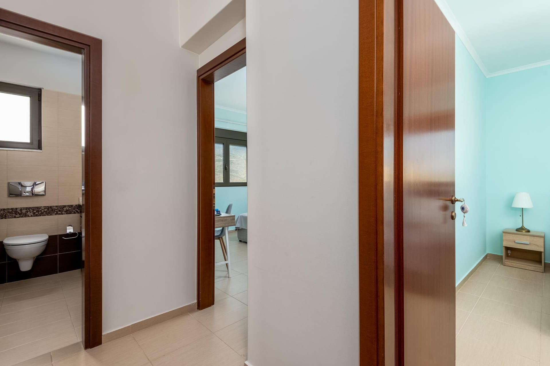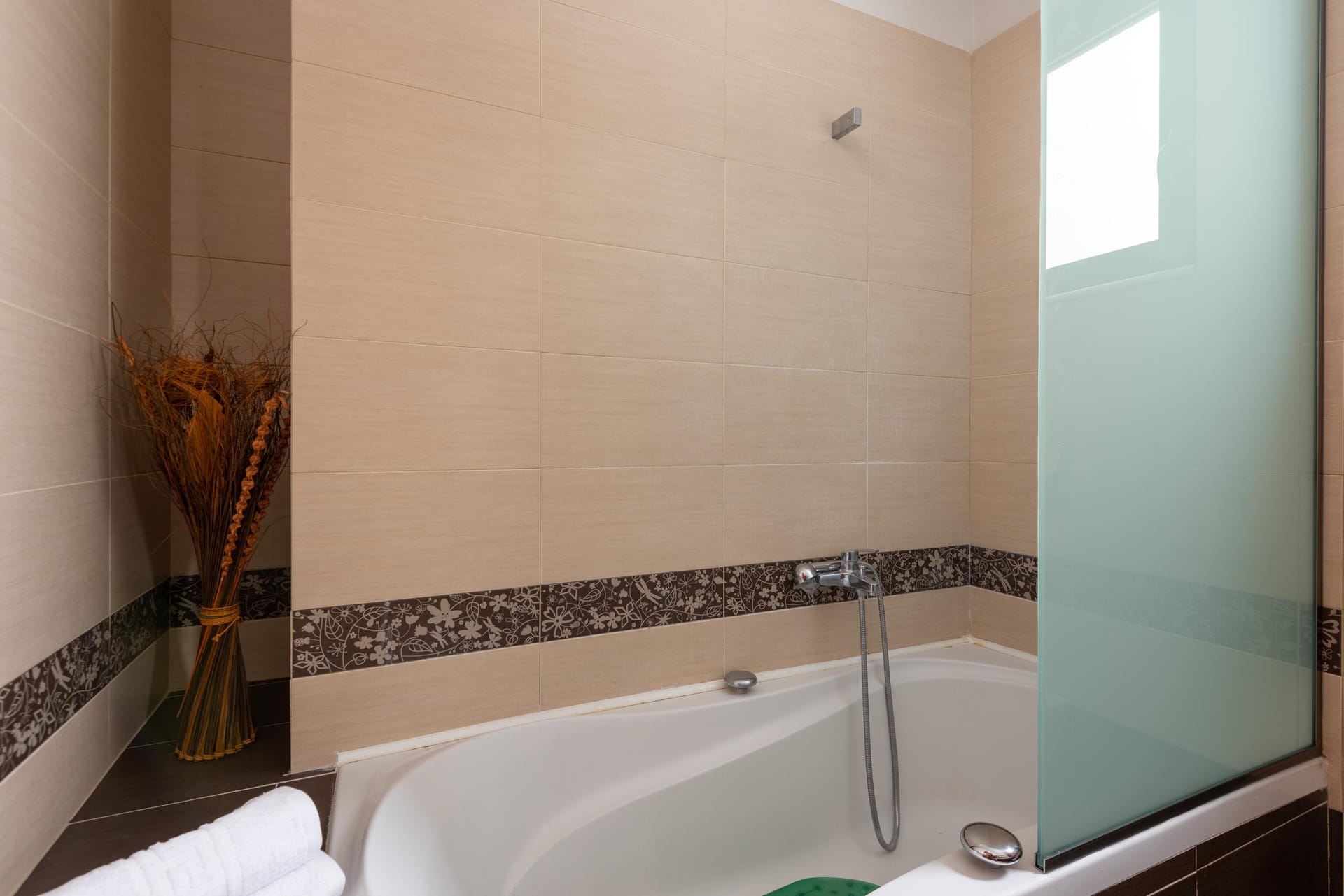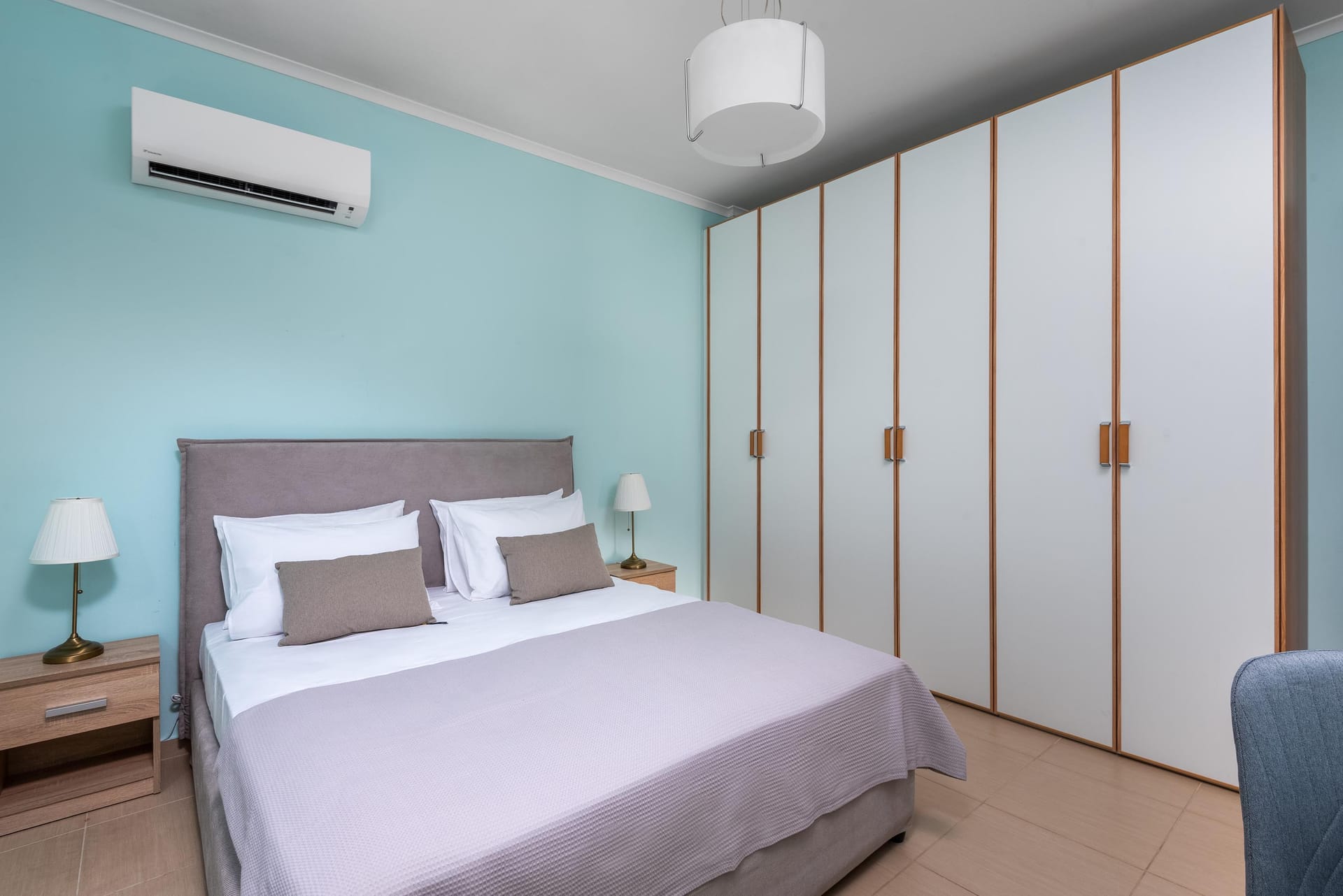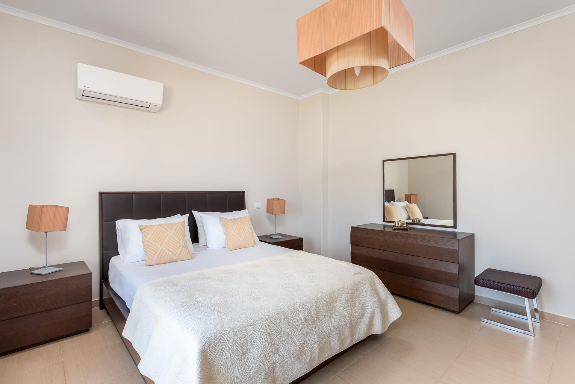 Acro Villa hosts up to 7 guests with 3 modern fully air-conditioned bedrooms. On the first floor, there are 2 bedrooms with double beds, and on the ground floor, a bedroom features 2 single beds and a comfy single sofa bed in the living room. There are 2 stylish bathrooms, one with a shower and one with a bathtub.