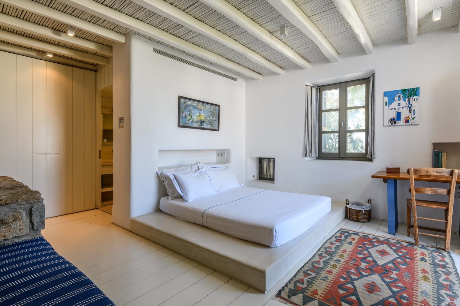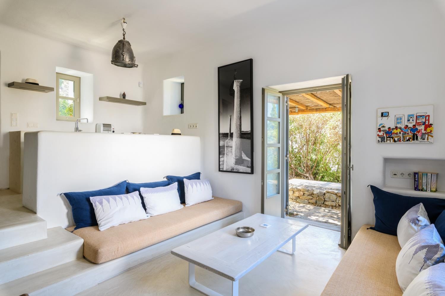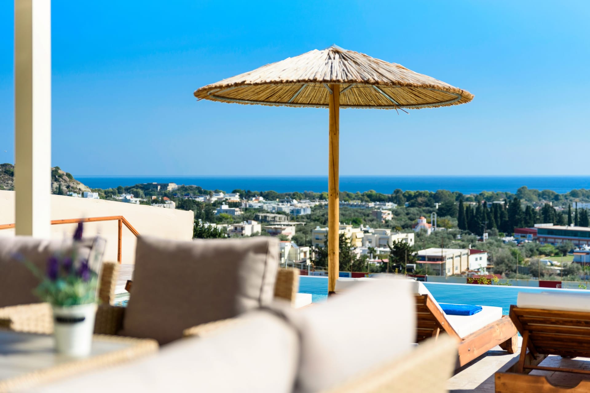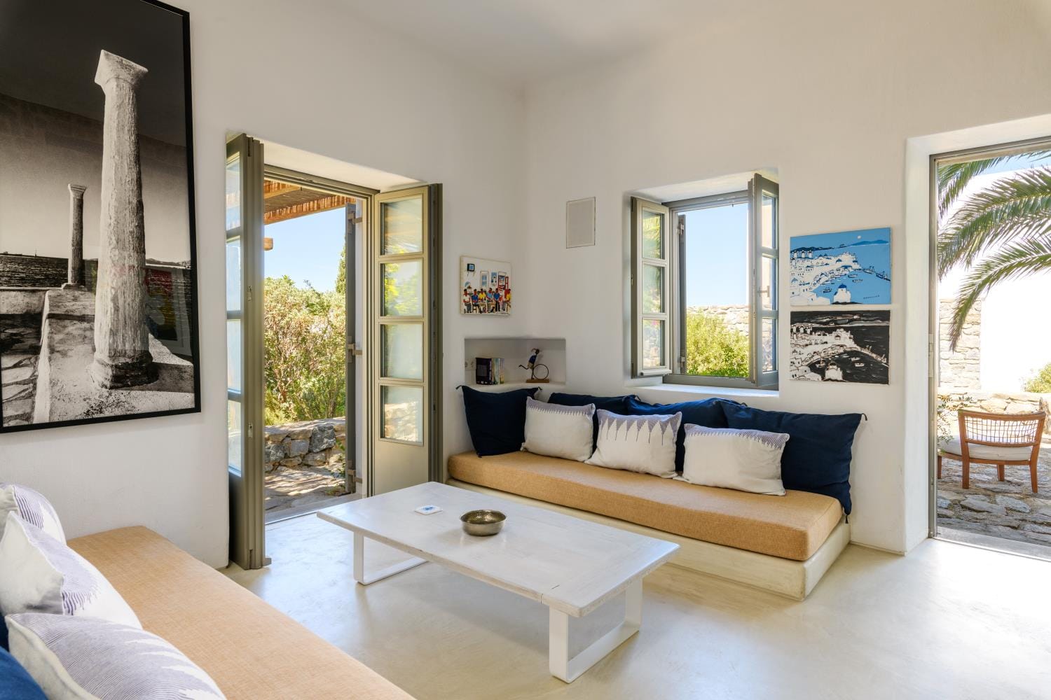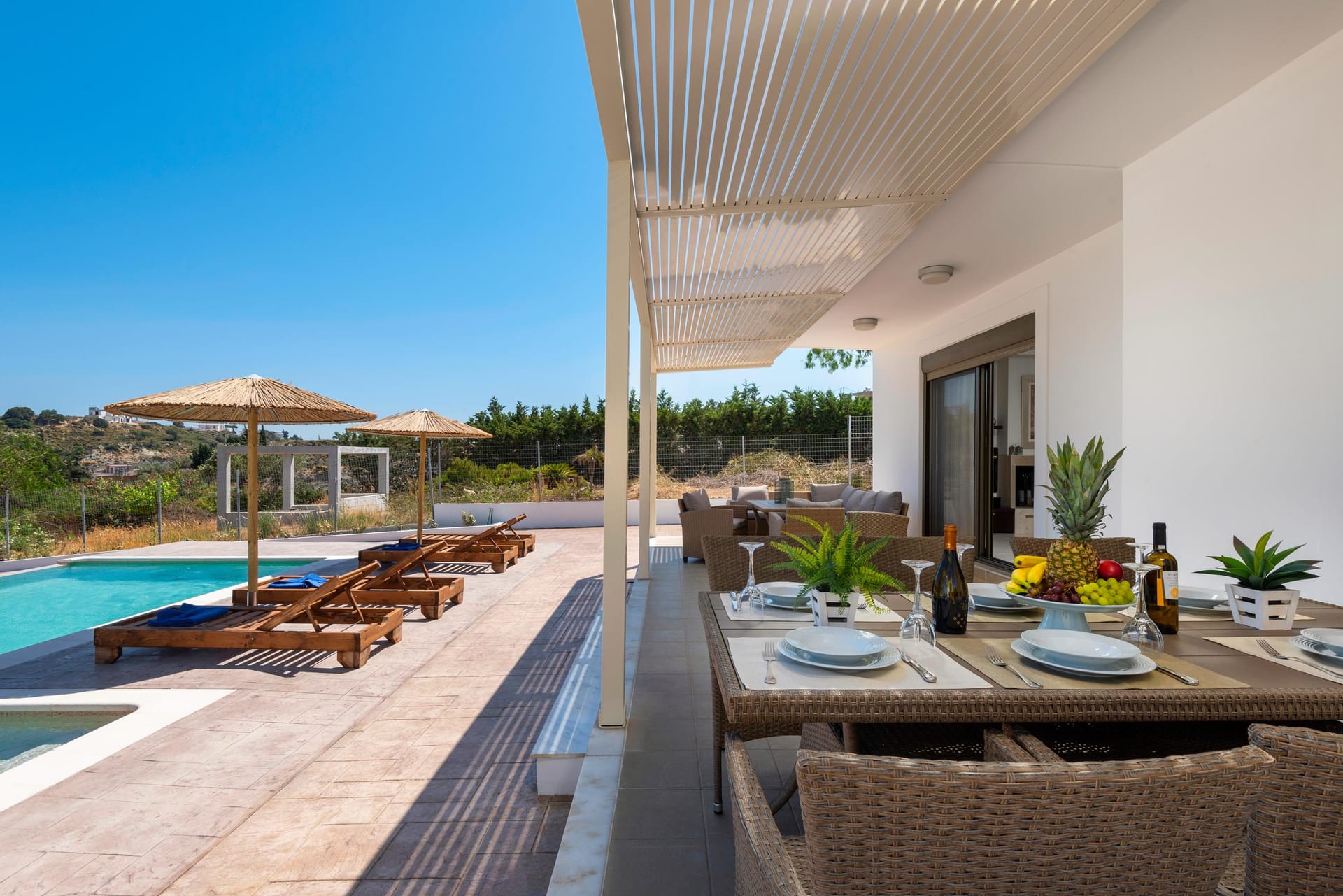 The villa offers a fully equipped kitchen beautifully decorated, accompanied by a dining area. There’s a smart TV and free Wi-Fi access throughout the property. Outdoors, guests can enjoy a fantastic private swimming pool with sunbeds to relax under the Aegean sun, along with a BBQ facility for al fresco meals and an outdoor dining area.