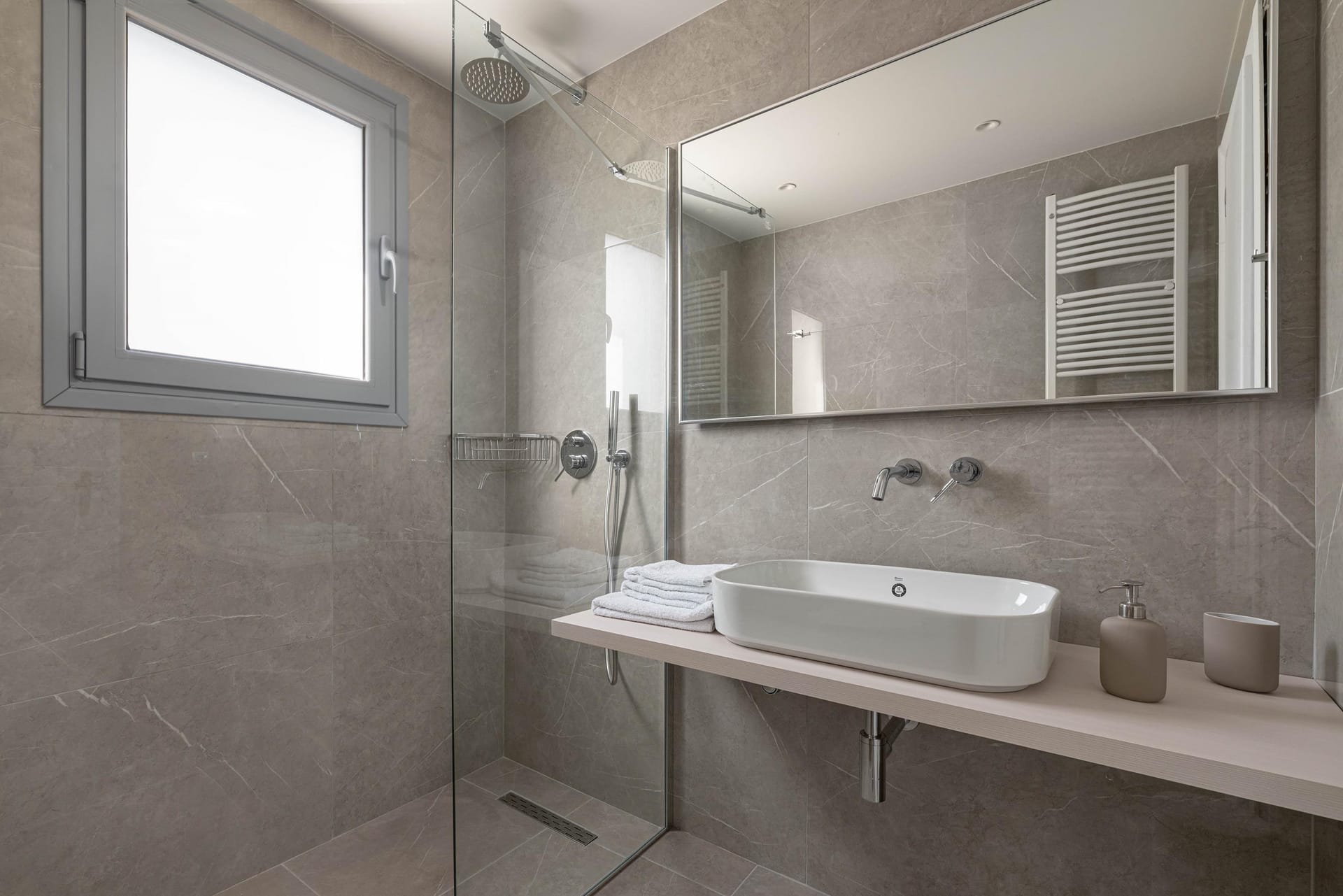 The interior décor offers a cozy atmosphere of elegant simplicity. Outside, guests can enjoy the shared swimming pool with sunbeds, perfect for relaxation and play. The pool is deep enough for swimming but shallow near one end to safely accommodate toddlers.