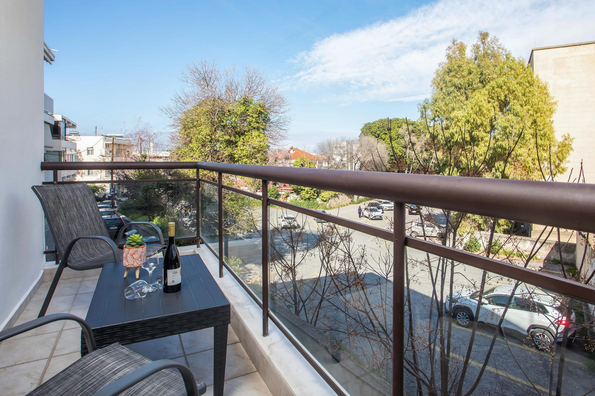 The apartment includes a modern bathroom with a bathtub, a fully equipped kitchen suitable for meal preparation, and a dining area. Guests can enjoy a beautiful living room with a large smart TV, and free Wi-Fi access throughout the apartment. The balcony features a sitting area overlooking the town of Rhodes and Central Park.
