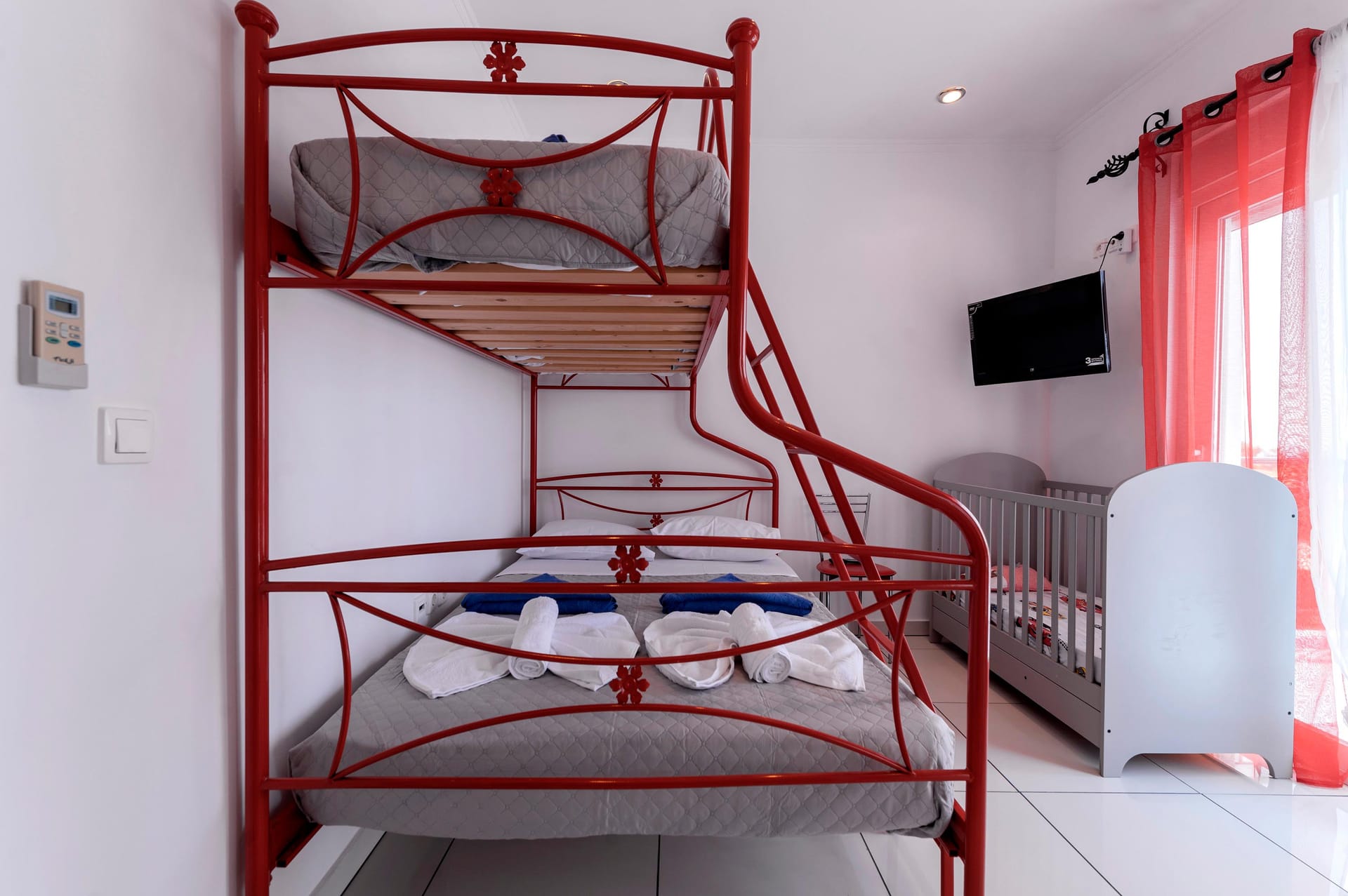 Two of the bedrooms have double beds. One of the bedrooms offers bunk beds and the other bedroom has twin beds. Additionally, there is a single sofa bed located in the living room.