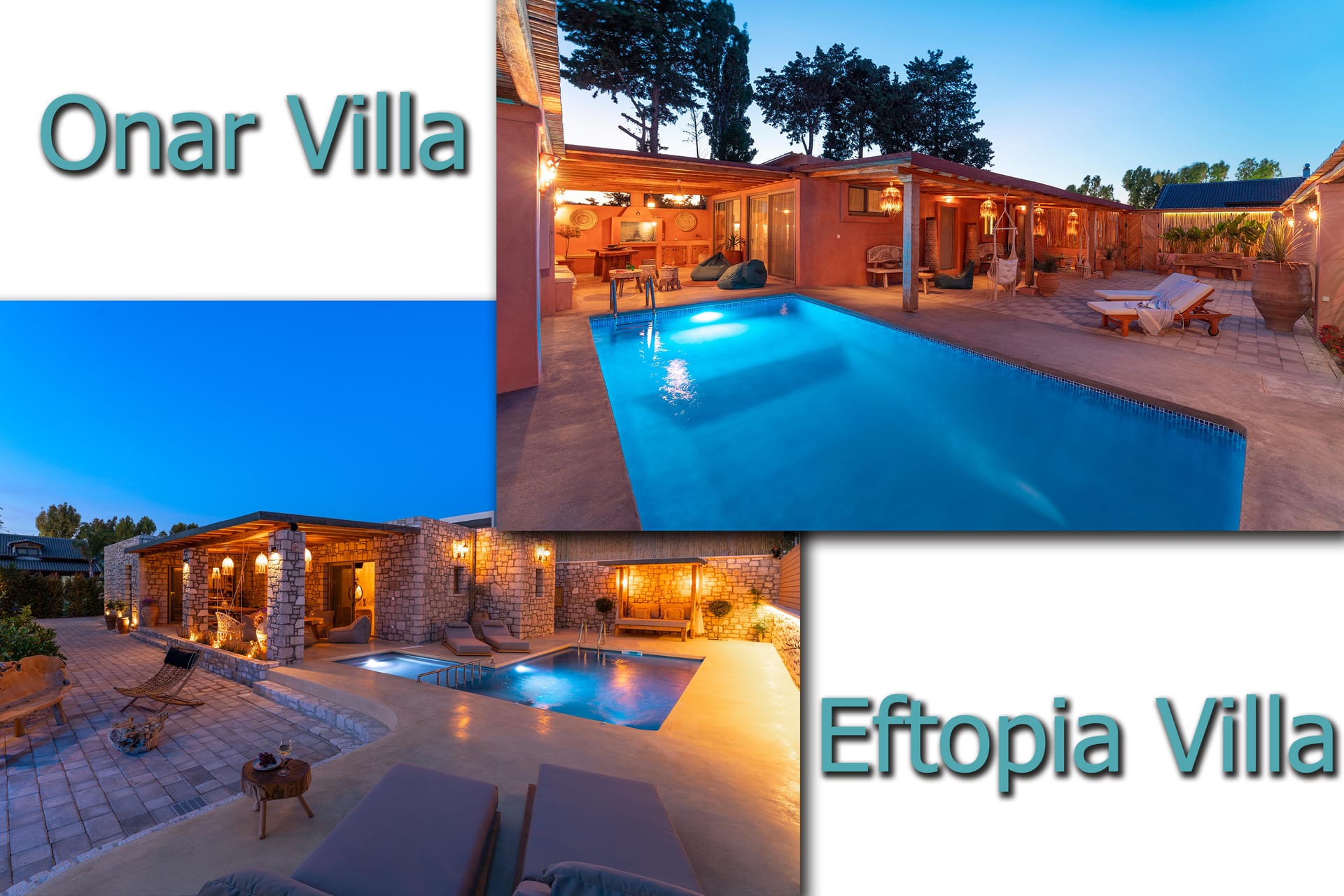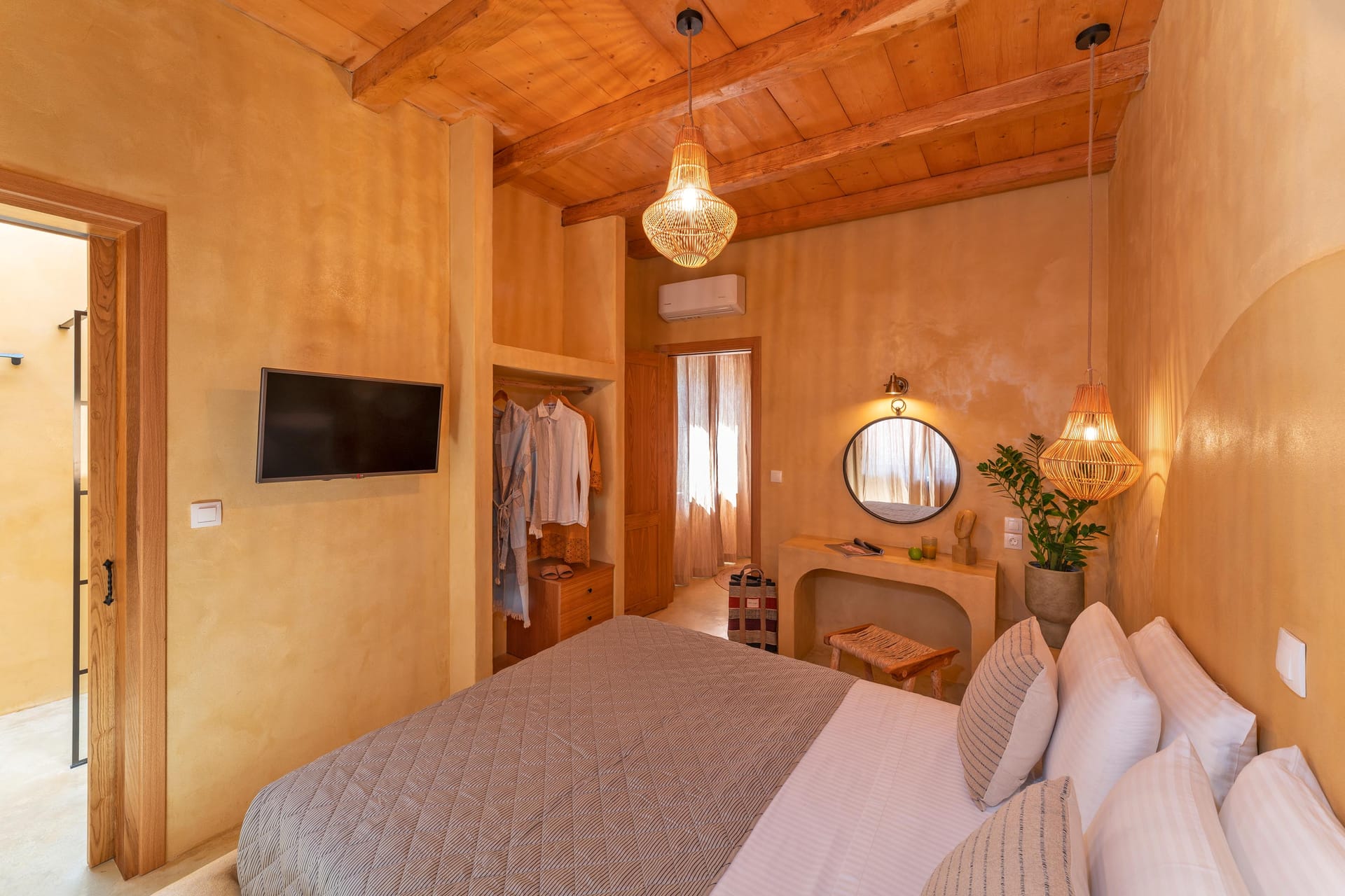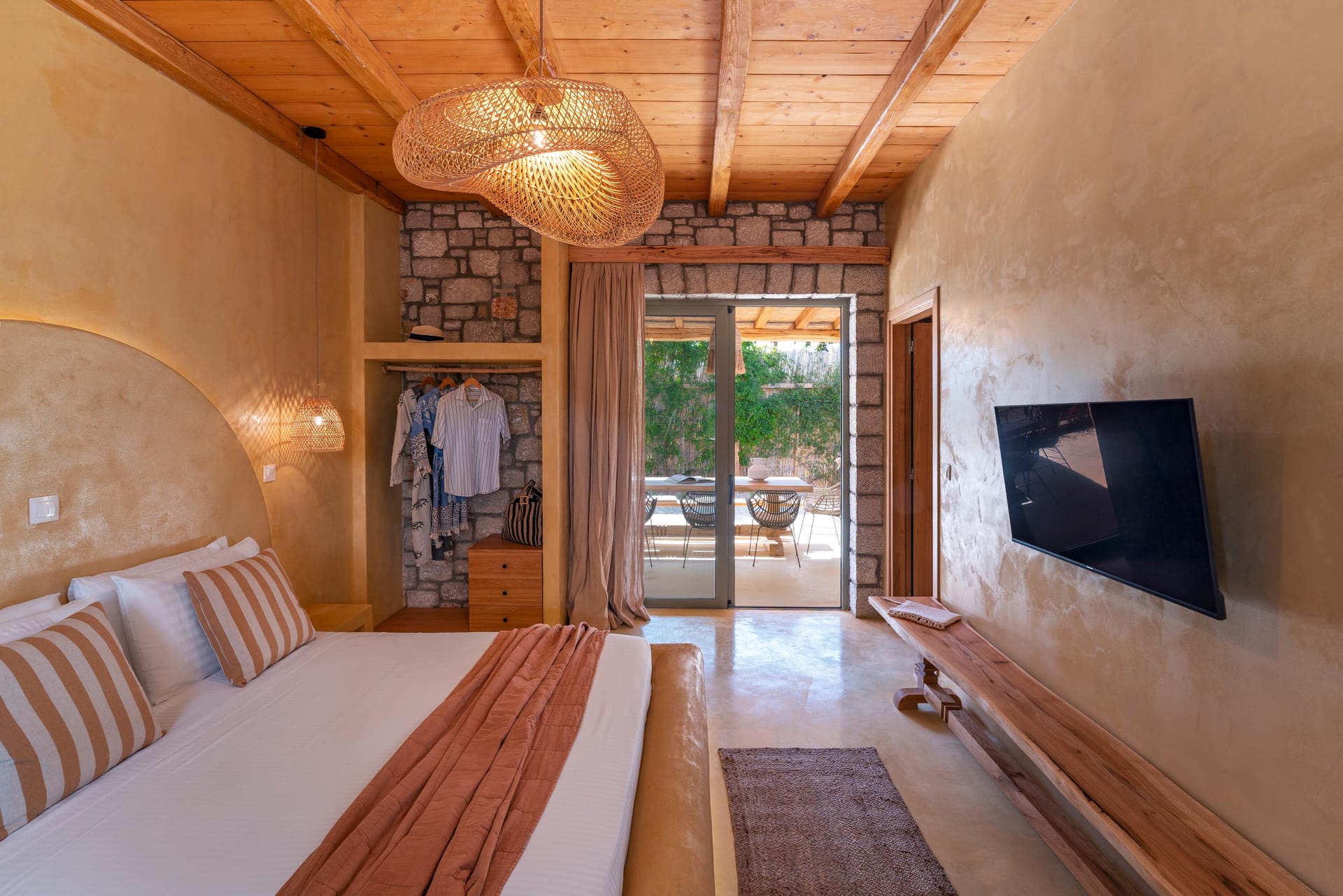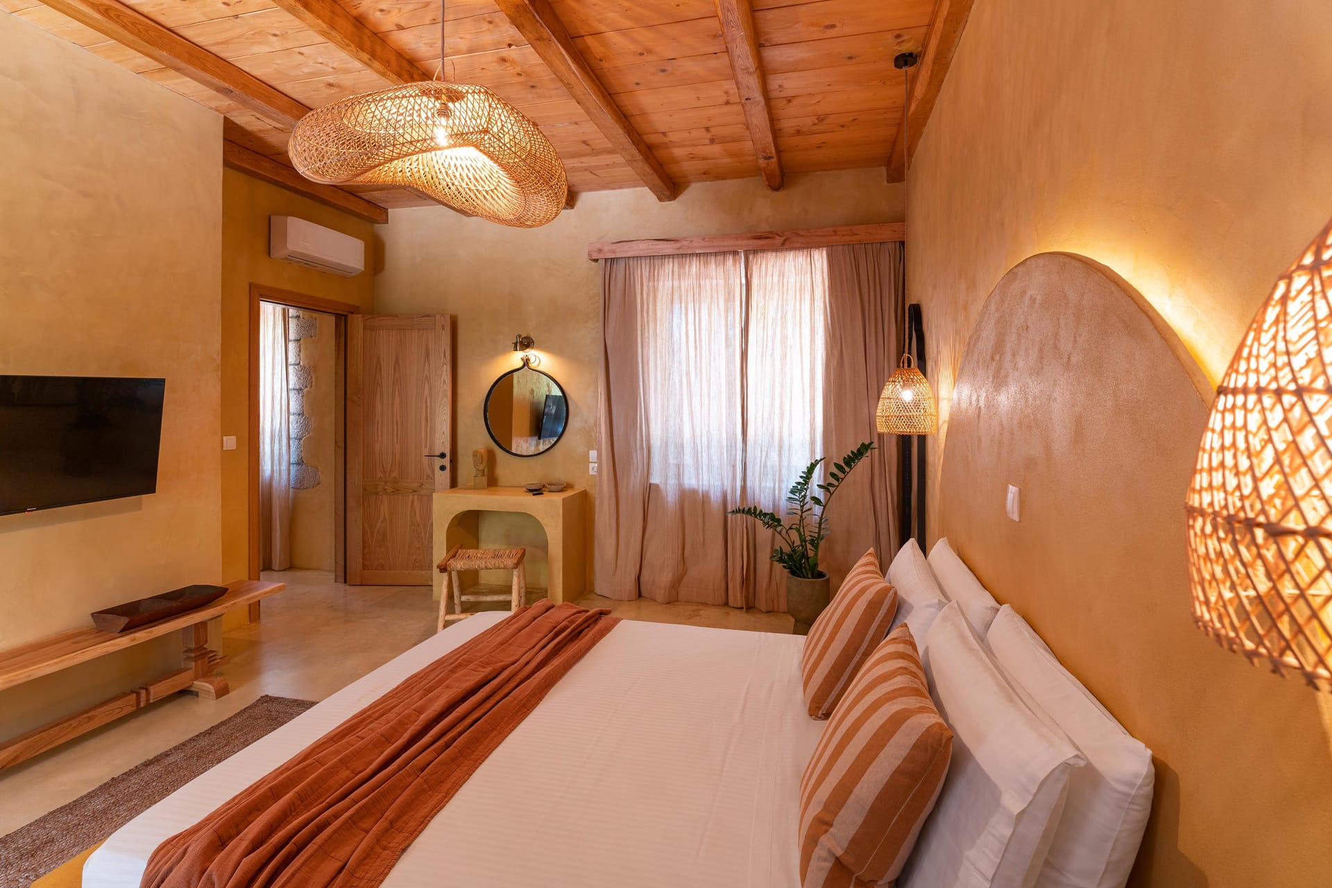 Onar Villas are located in the famous area of Kolympia village, just a short walk from Kolympia beach. Eftopia Villa accommodates up to 8 guests and features 3 fully air-conditioned bedrooms, each with double beds in warm tones and a unique bohemian design. One of the bedrooms is outdoors and has its own entrance and bathroom, and all bedrooms include ensuite bathrooms with showers. The living room also has a double sofa bed for additional guests.