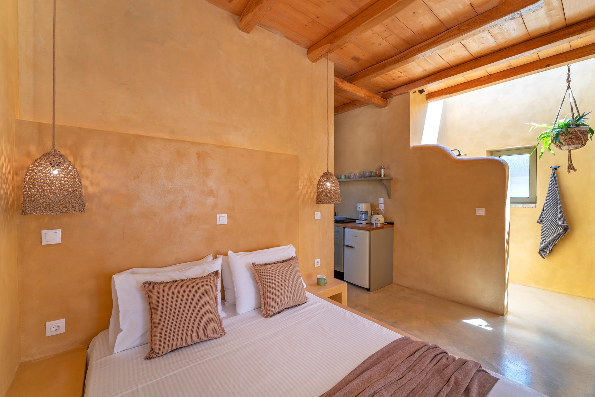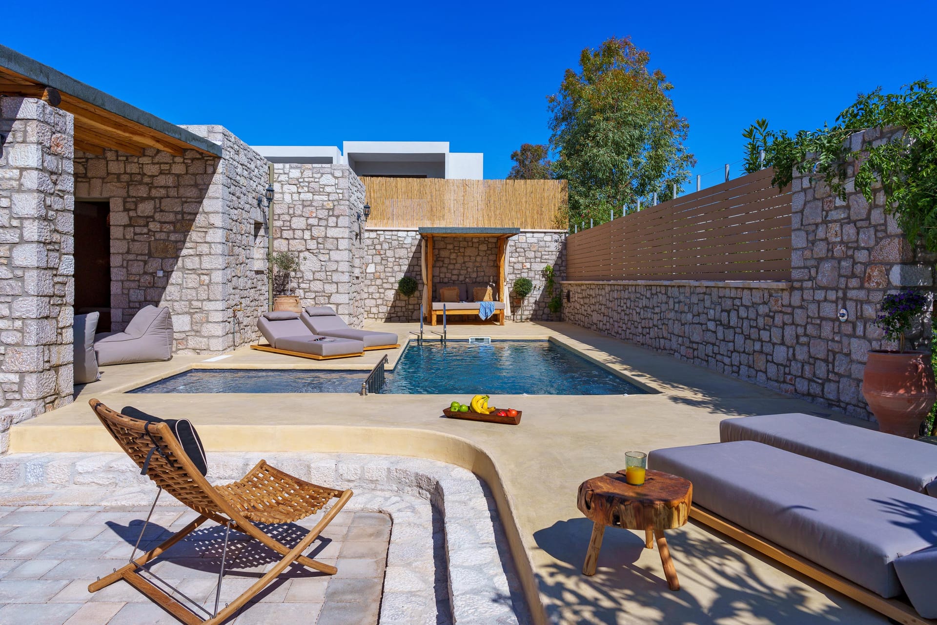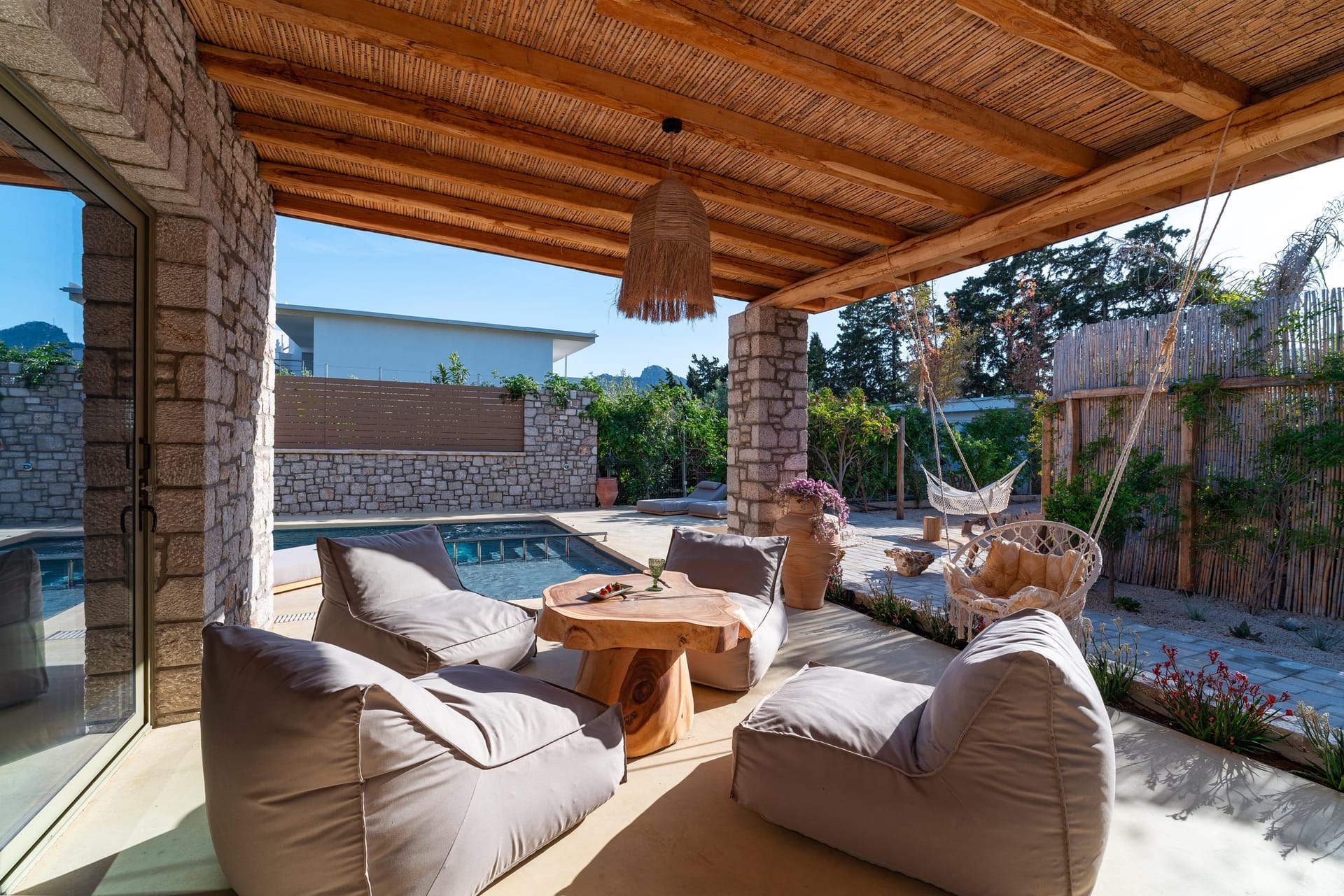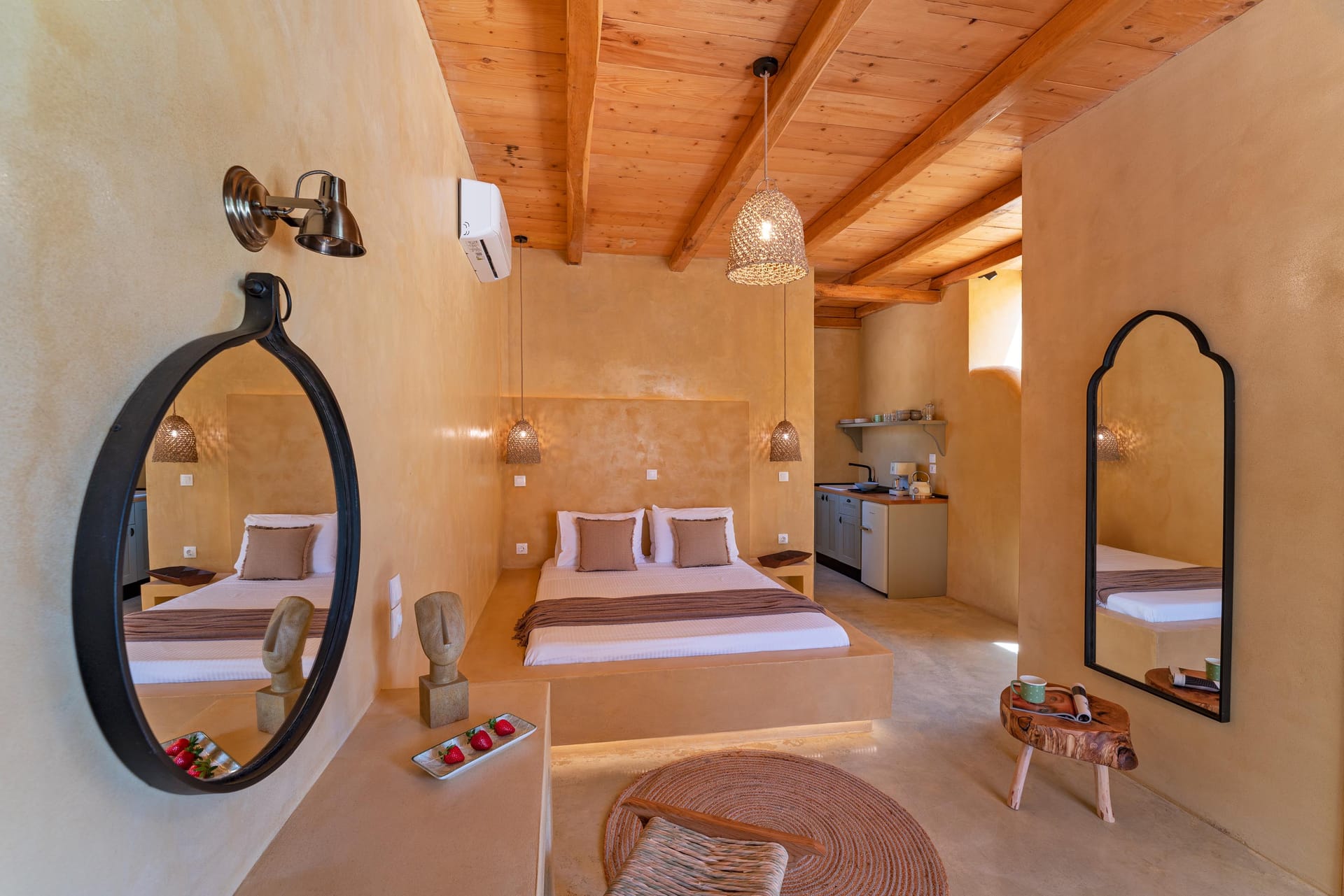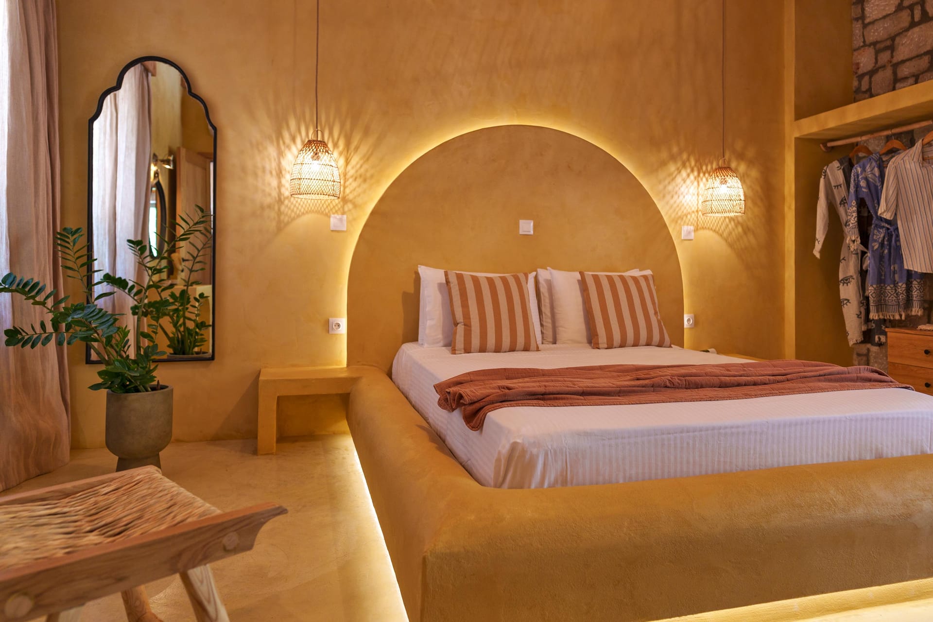 Onar Villas are located in the famous area of Kolympia village, just a short walk from Kolympia beach. Eftopia Villa accommodates up to 8 guests and features 3 fully air-conditioned bedrooms, each with double beds in warm tones and a unique bohemian design. One of the bedrooms is outdoors and has its own entrance and bathroom, and all bedrooms include ensuite bathrooms with showers. The living room also has a double sofa bed for additional guests.