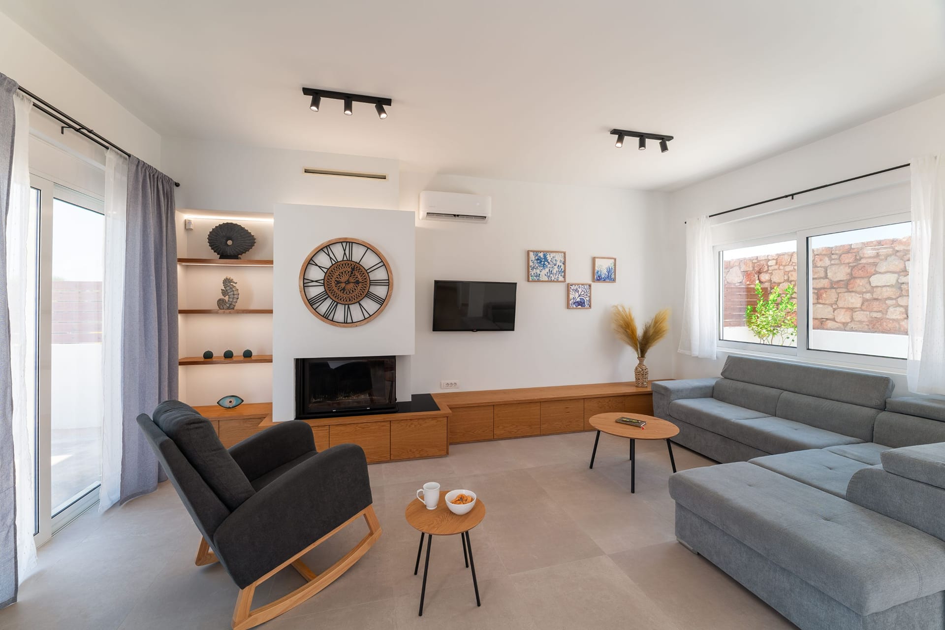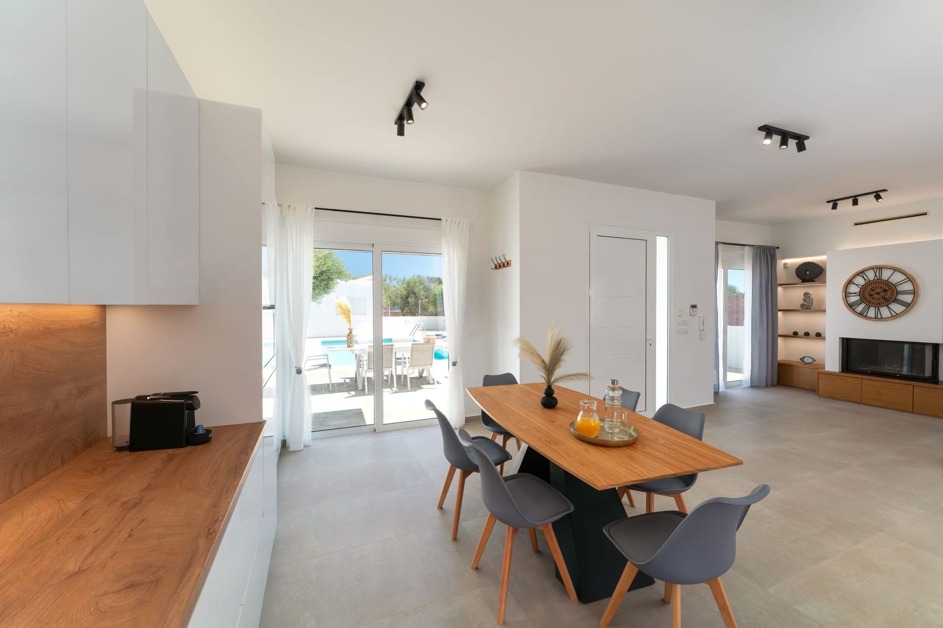 The villa’s fully equipped kitchen allows for effortless cooking and dining, complemented by a stylish indoor living space. Outdoors, guests can enjoy a private garden furnished for relaxation, a coal BBQ for memorable meals, and a private pool with two whirlpool seats and jets for ultimate leisure. Sunbeds and parasols offer perfect spots to soak up the sun, and a ping pong table adds fun for all ages. For peace of mind, CCTV monitors the entrance for security, ensuring a safe and comfortable stay.