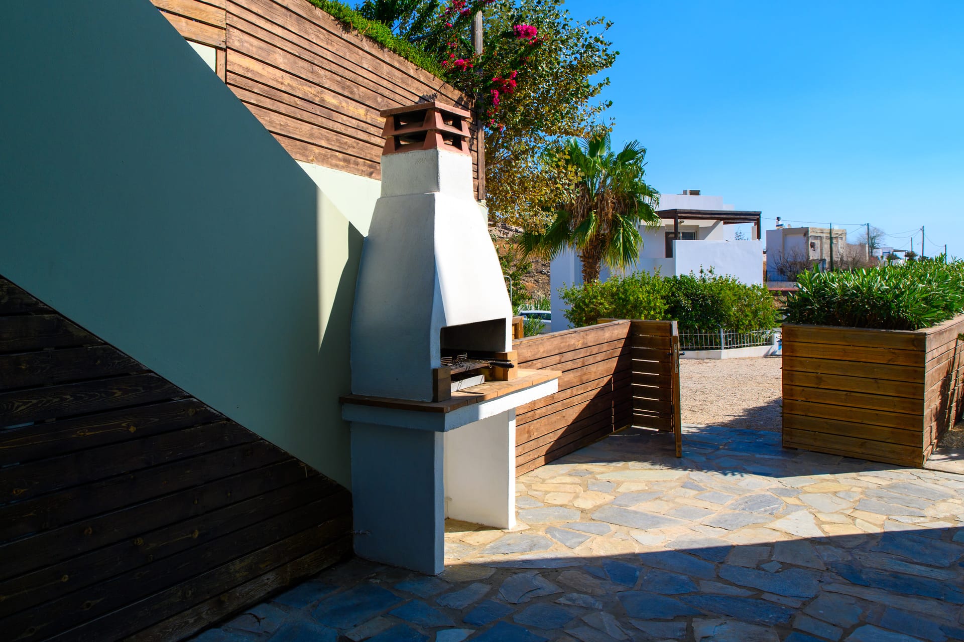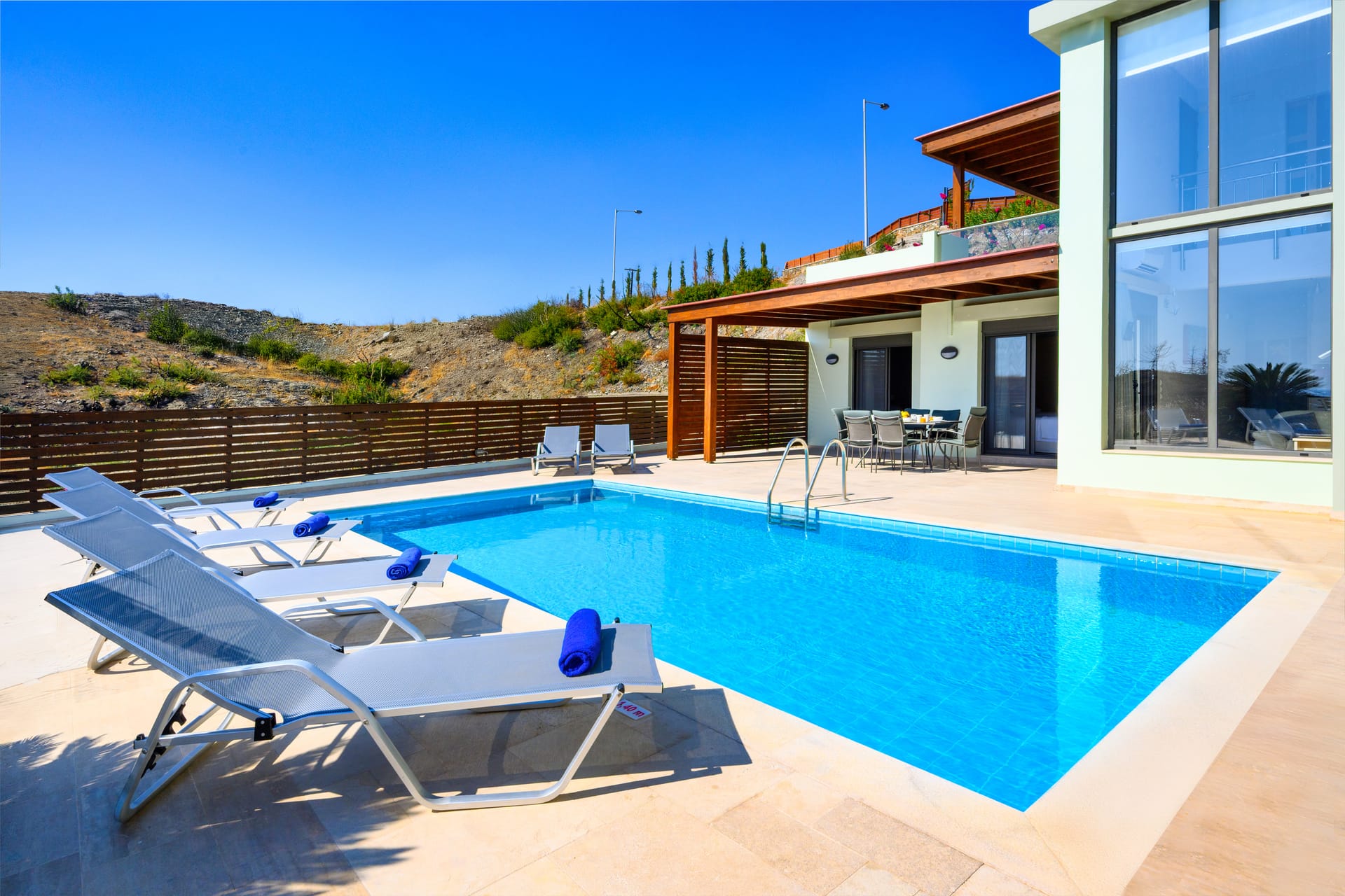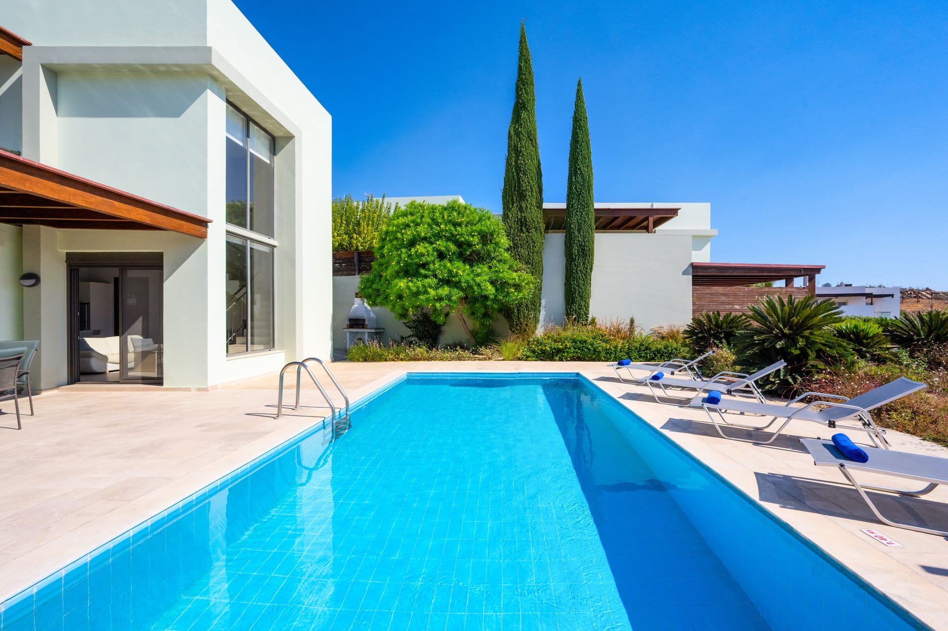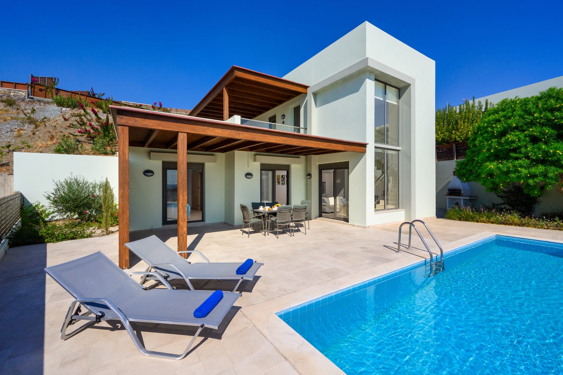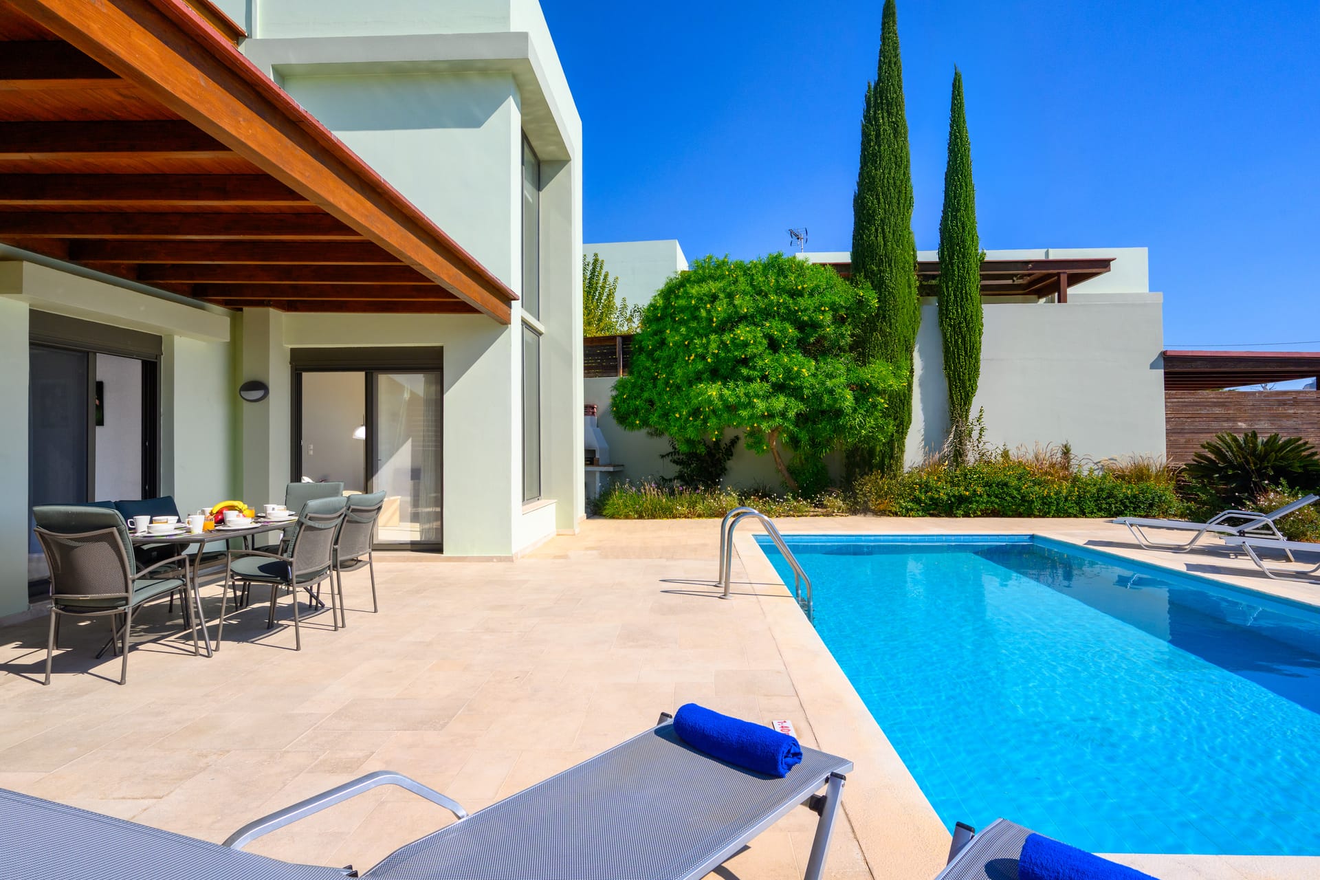 <p>Step outside to enjoy the private swimming pool and sunbathing area, complete with comfortable outdoor furniture. The villa also features a BBQ area, perfect for grilling and enjoying meals in the warm Rhodes weather. Relax on the patio with a stunning view of the sea, providing a tranquil environment for your holiday.</p>
