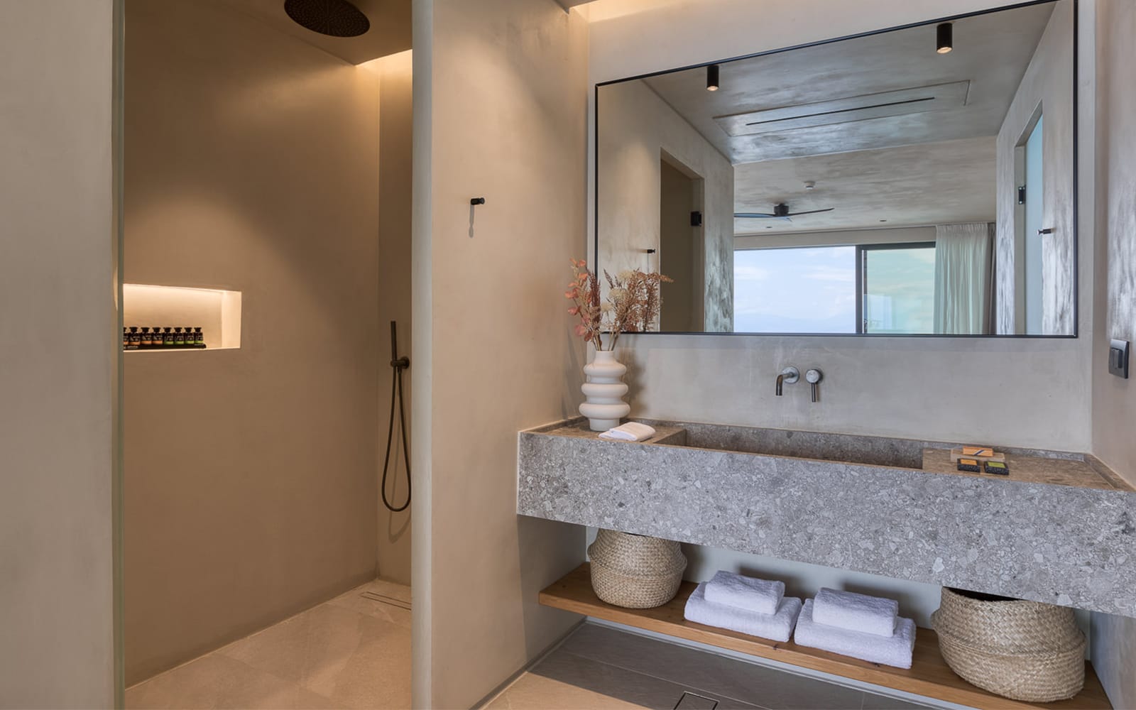 spacious living room. The modern bathroom is equipped with a sleek shower and essential