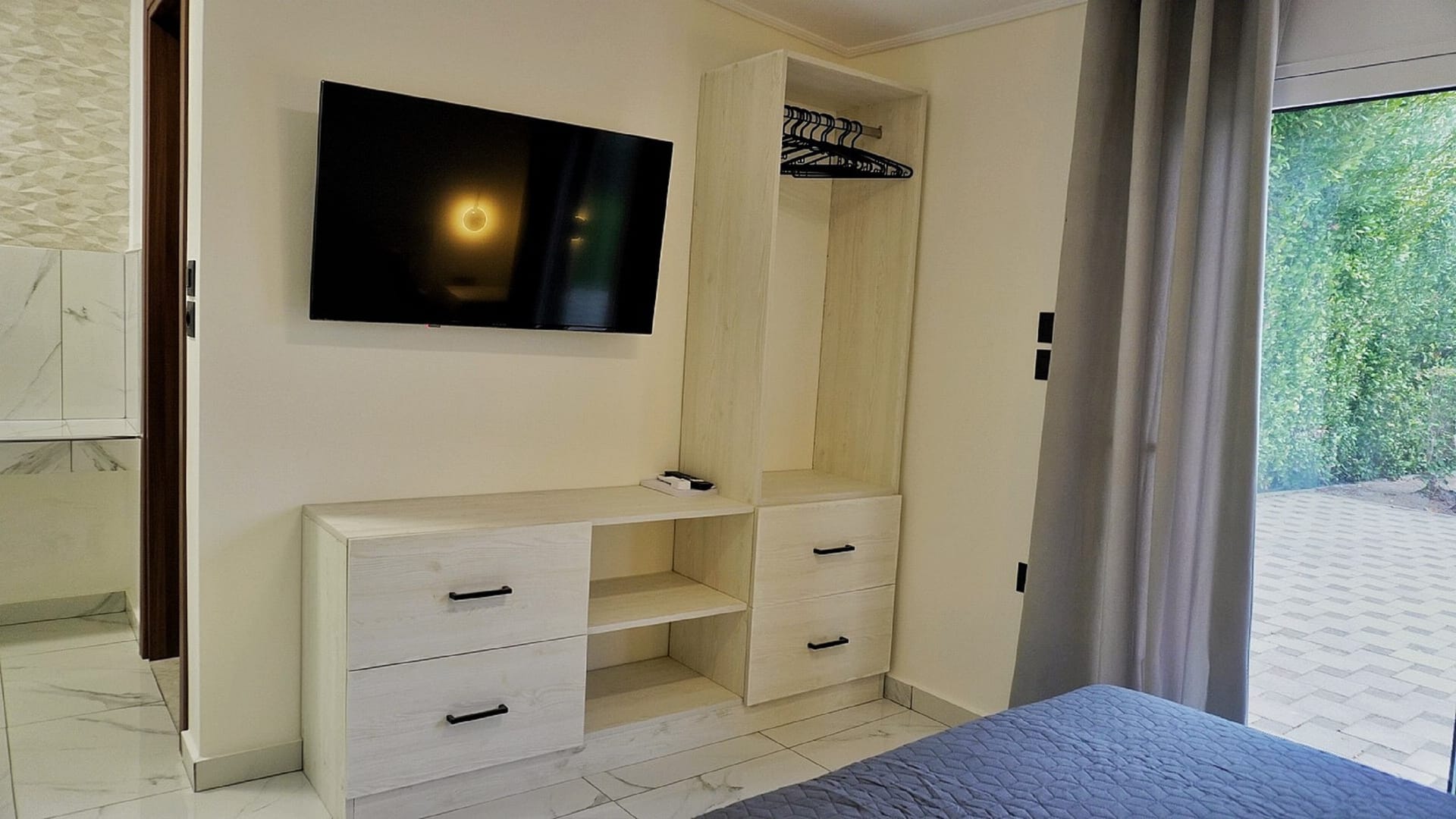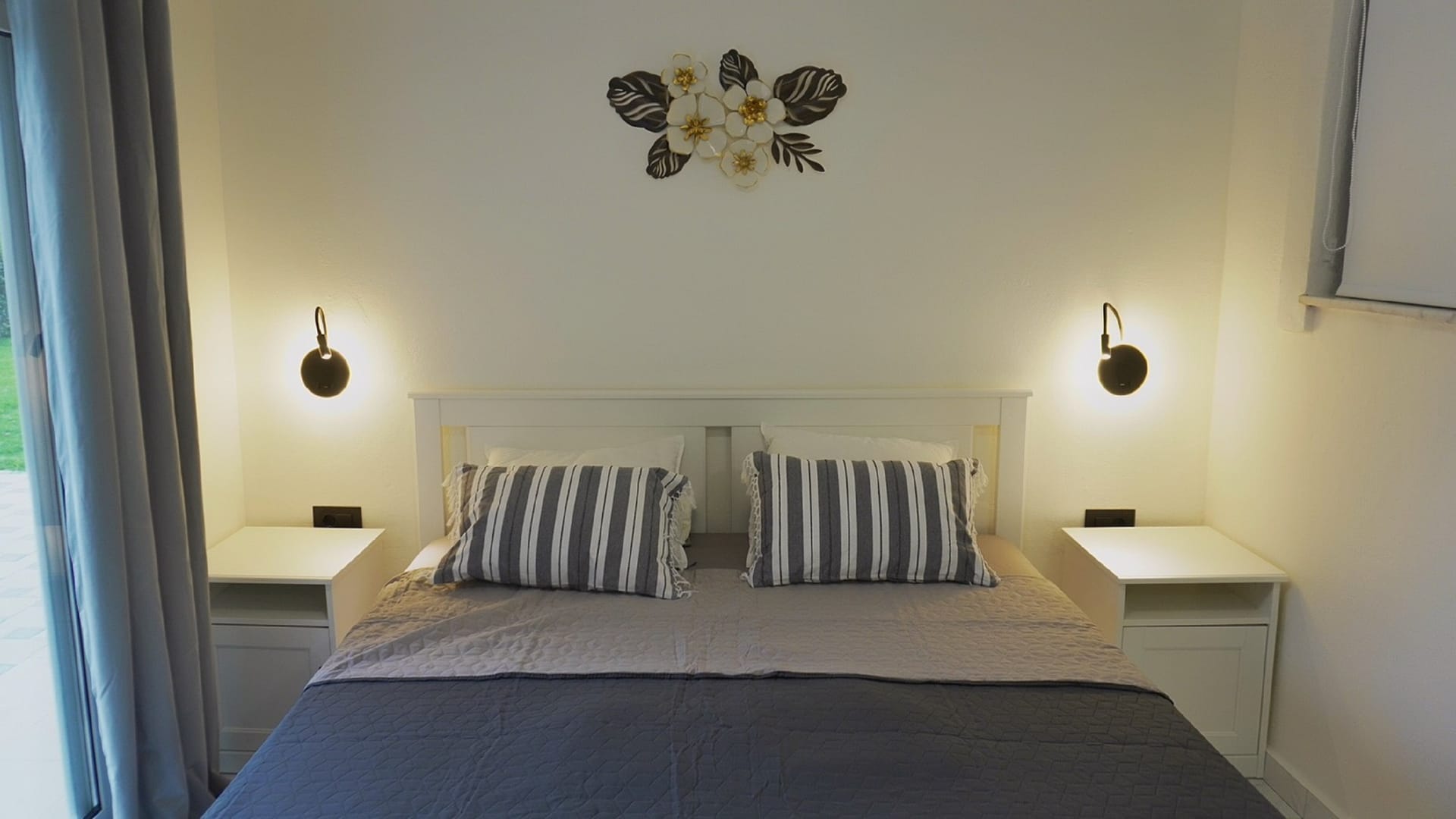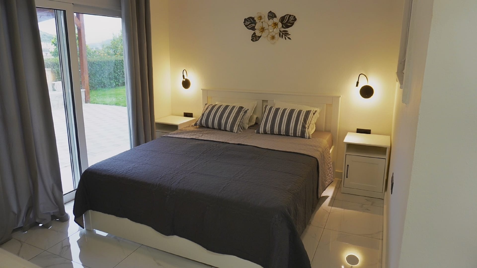 Sephora Villa accommodates up to six guests in three beautifully crafted bedrooms. The villa includes two double-bedded rooms, one of which features an en-suite bathroom with a relaxing bathtub, and a third room with two single beds. Additionally, there is a shared bathroom with a bathtub and a separate WC, ensuring comfort and convenience for all guests.