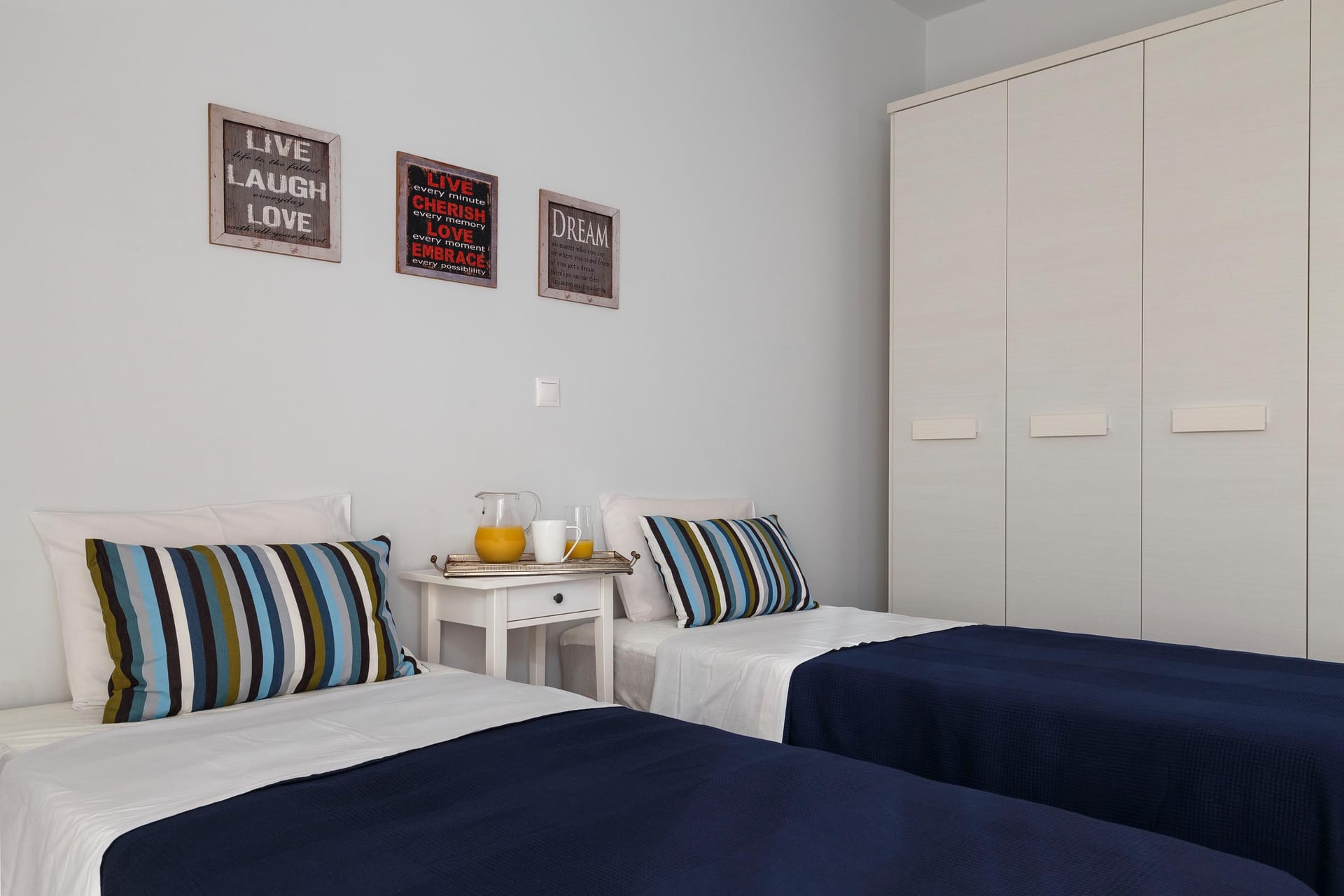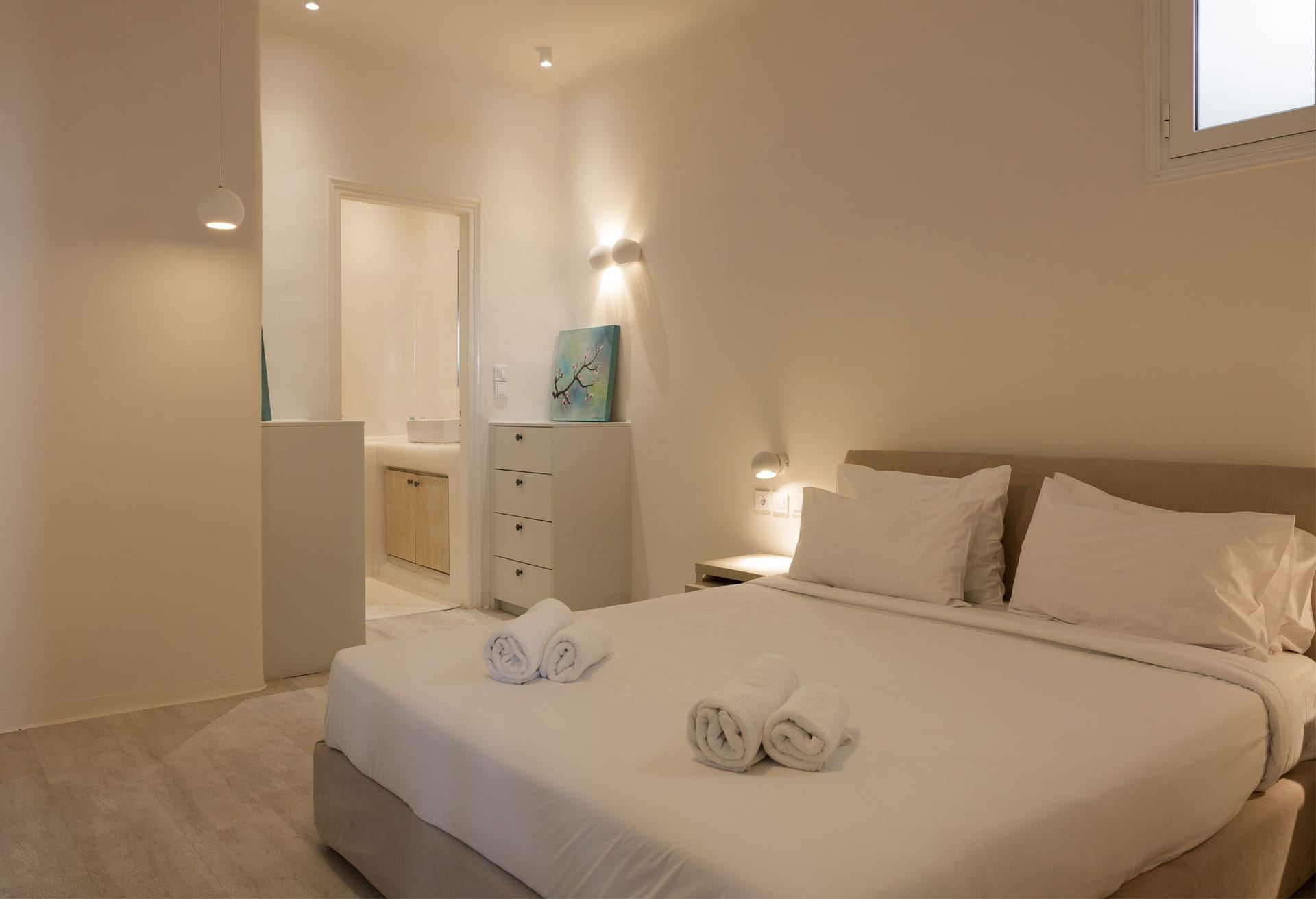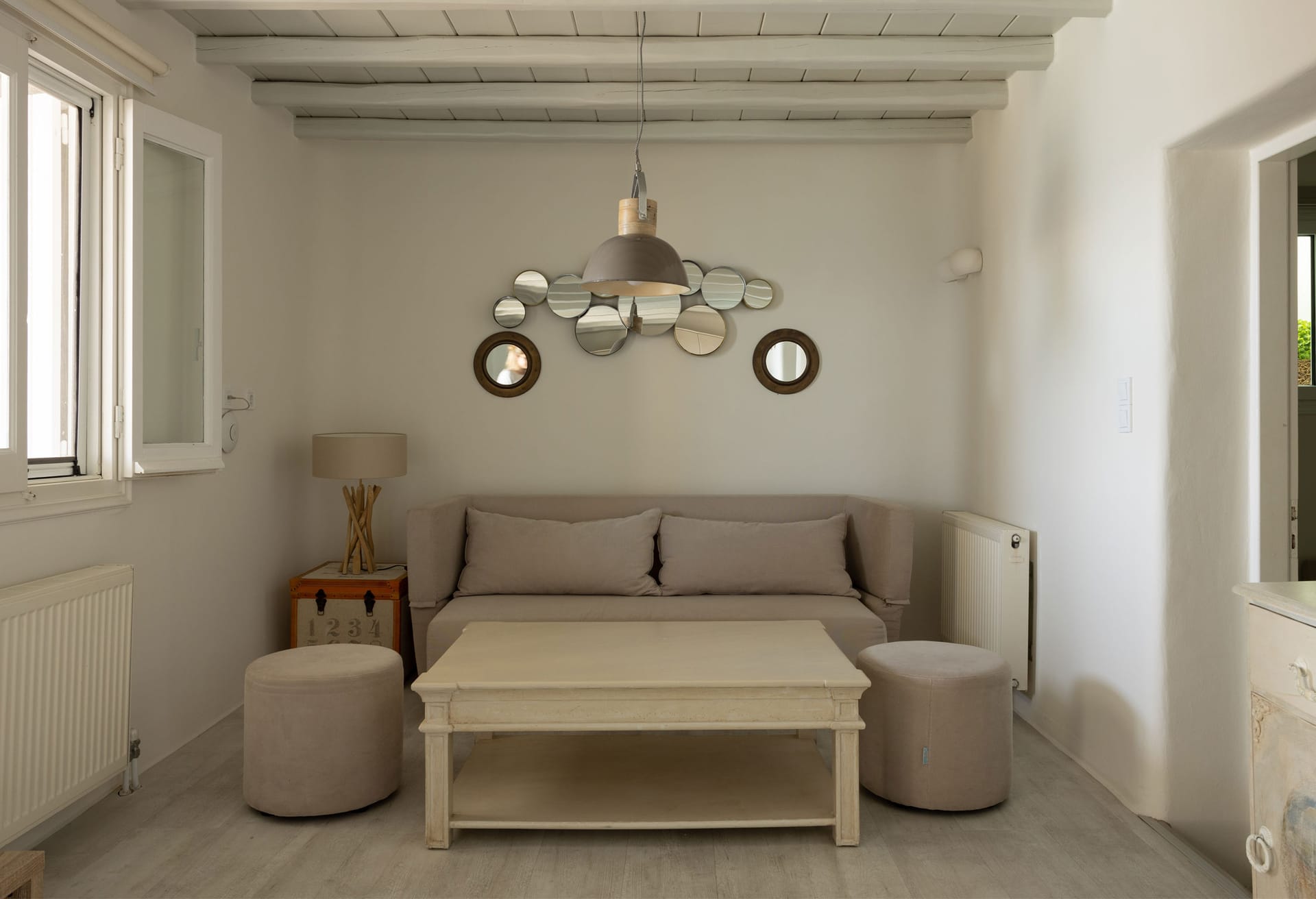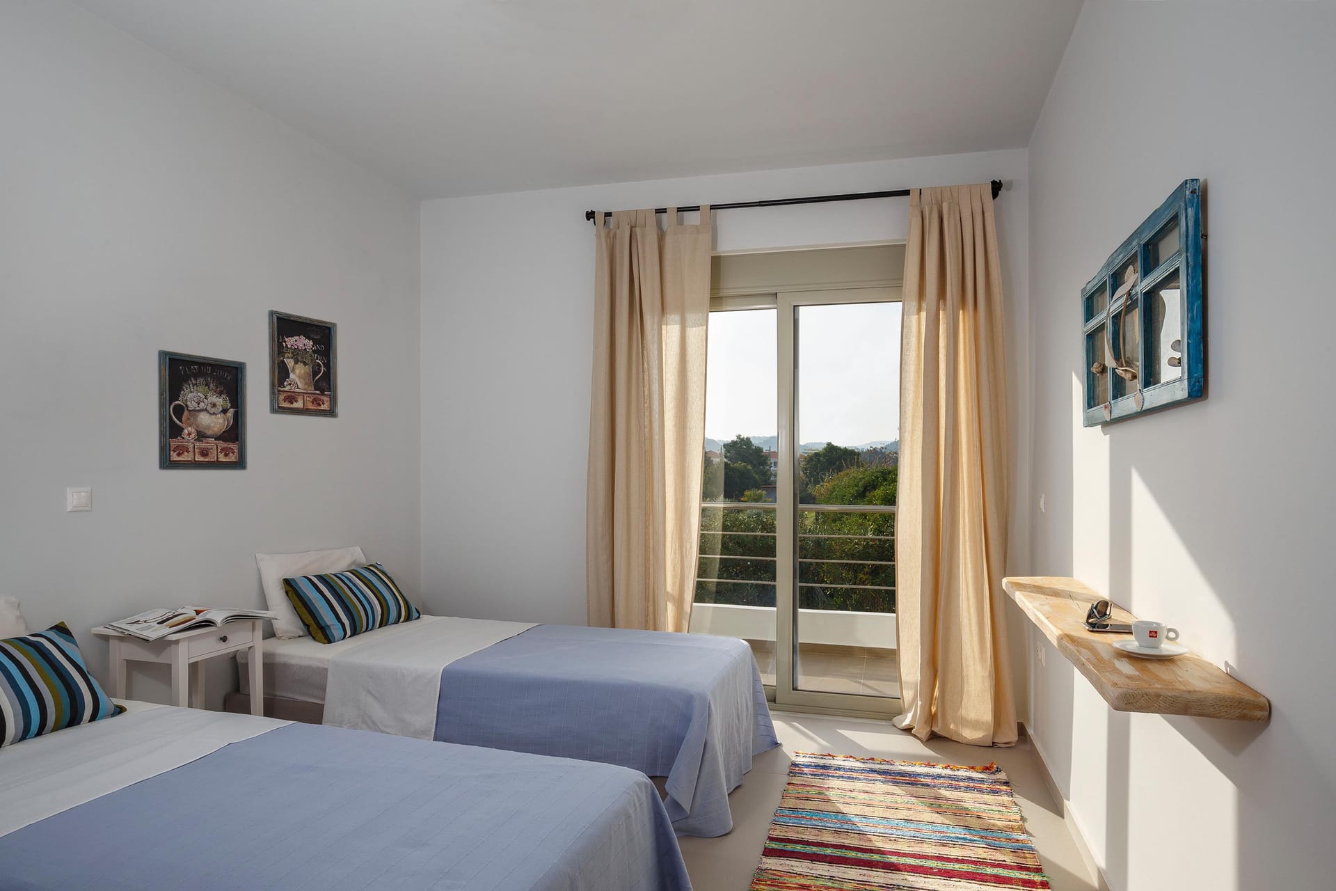 Thalassa Luxury Villa conveniently accommodates up to 8 guests. The villa features three fully air-conditioned bedrooms on the first floor: one double-bedded room and two bedrooms with twin beds (which can be converted into double beds upon request). Additionally, there is a bedroom on the second floor with a comfy double sofa bed. The double-bedded room includes an ensuite bathroom with a shower, while there are two more bathrooms available, one with a bathtub and the other with a shower.