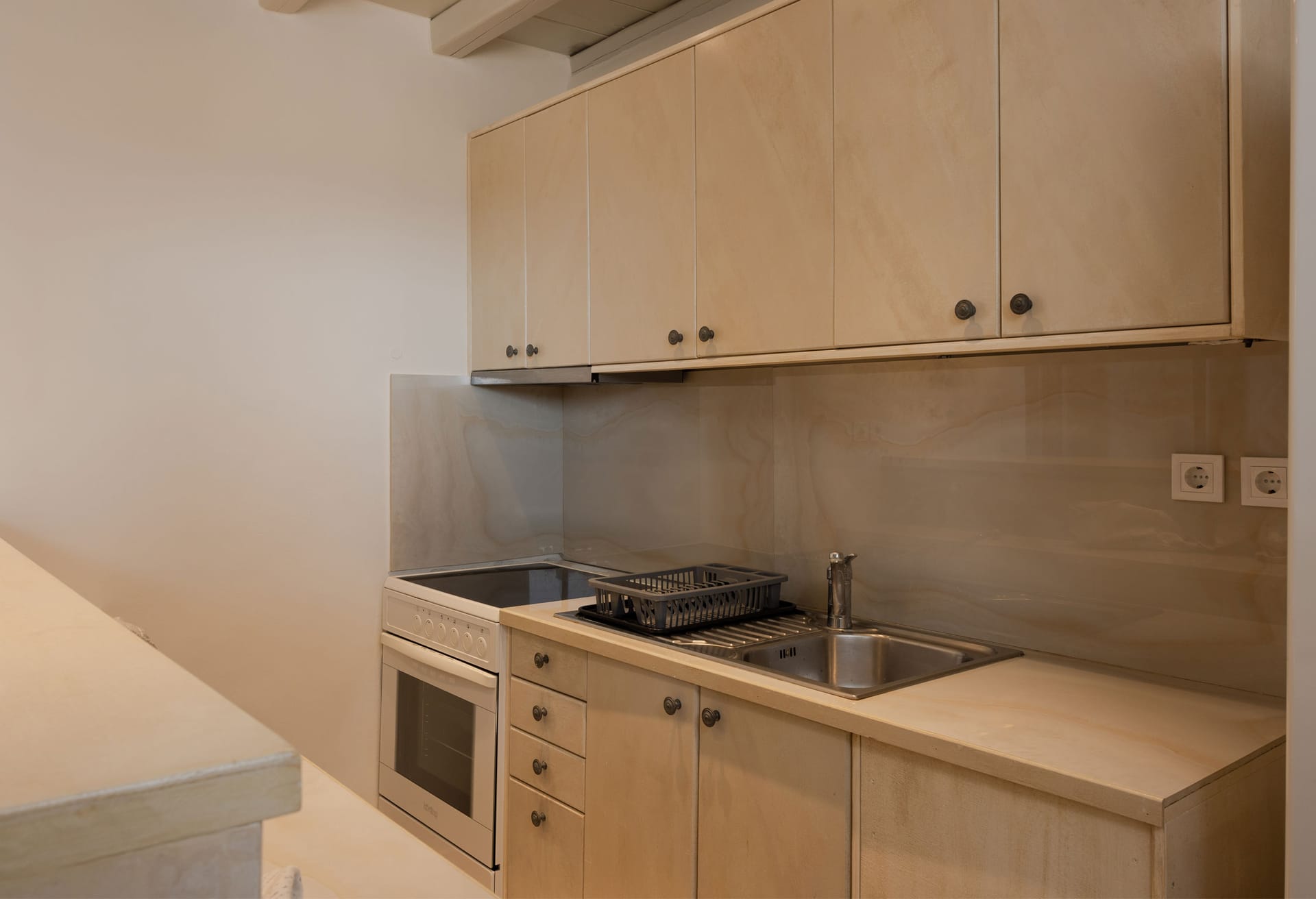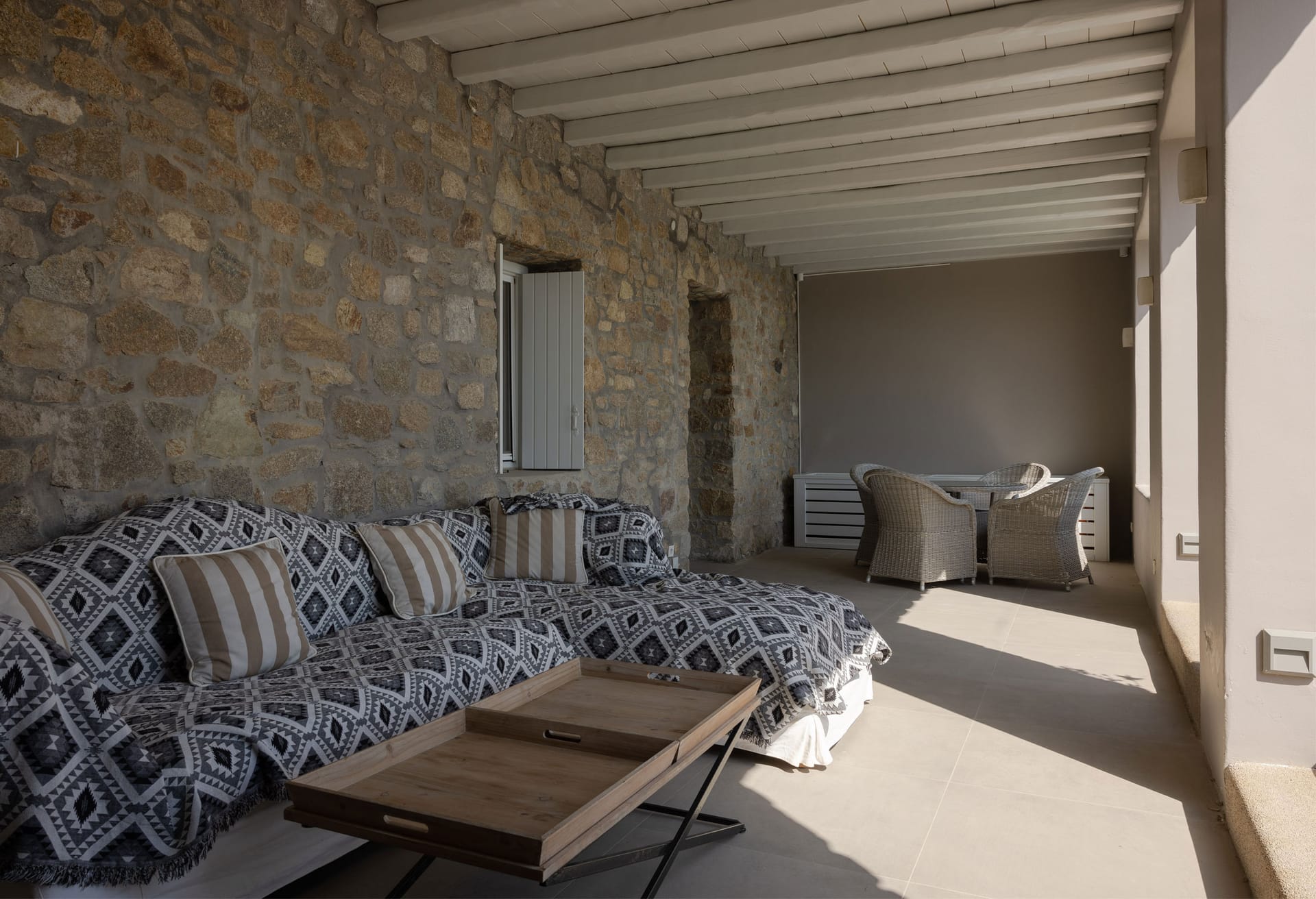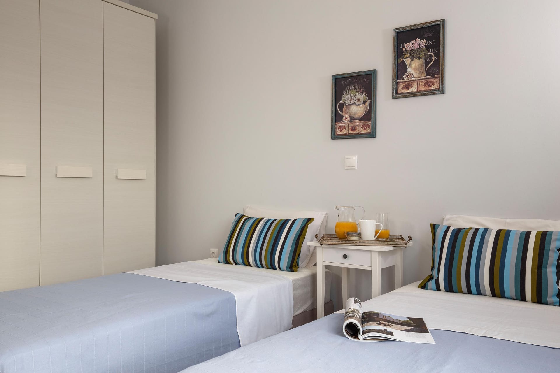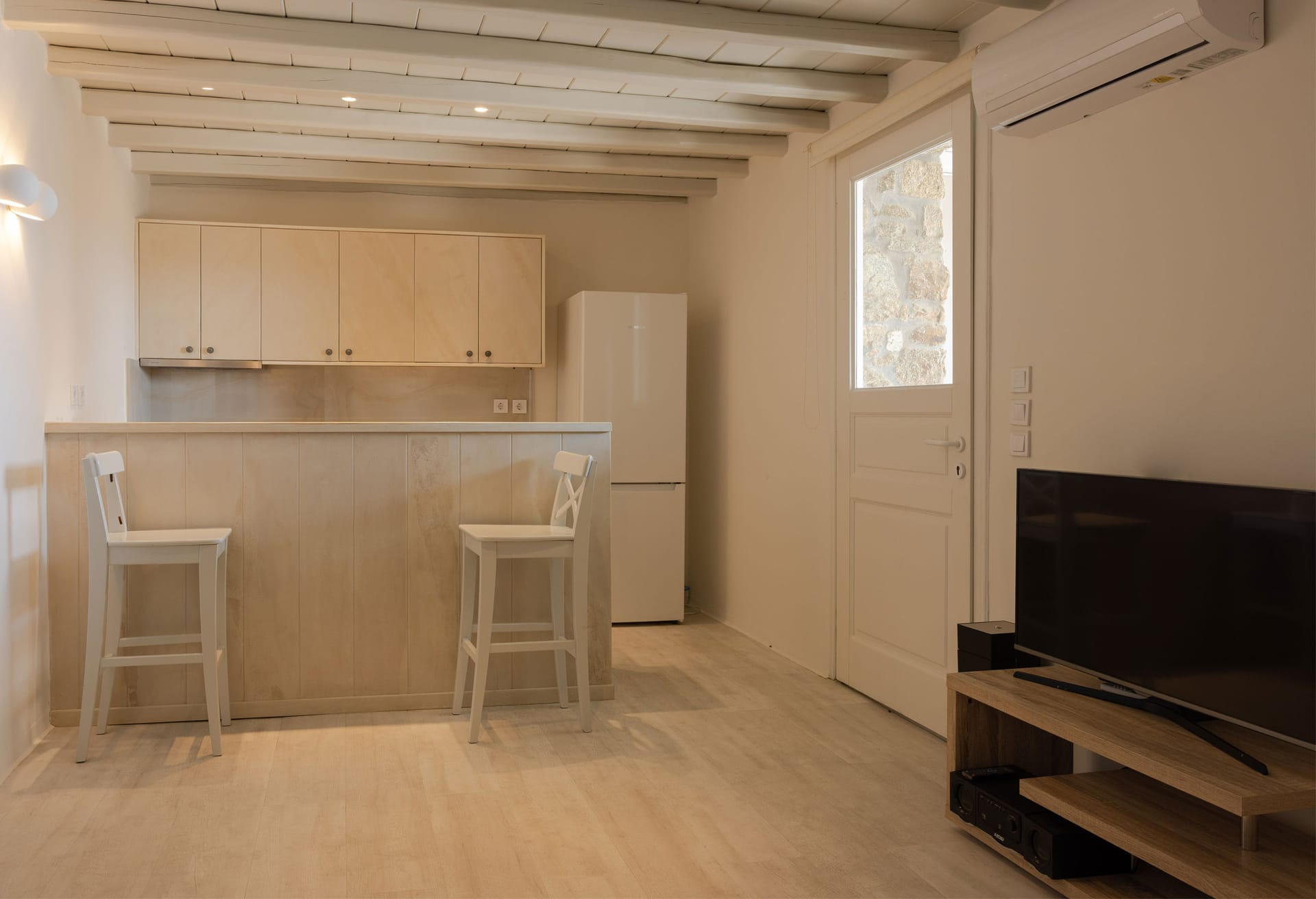 Thalassa Luxury Villa conveniently accommodates up to 8 guests. The villa features three fully air-conditioned bedrooms on the first floor: one double-bedded room and two bedrooms with twin beds (which can be converted into double beds upon request). Additionally, there is a bedroom on the second floor with a comfy double sofa bed. The double-bedded room includes an ensuite bathroom with a shower, while there are two more bathrooms available, one with a bathtub and the other with a shower.
