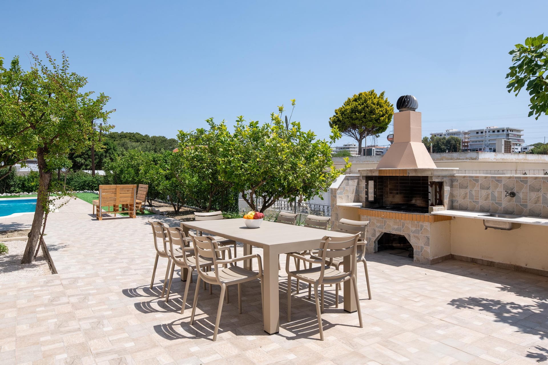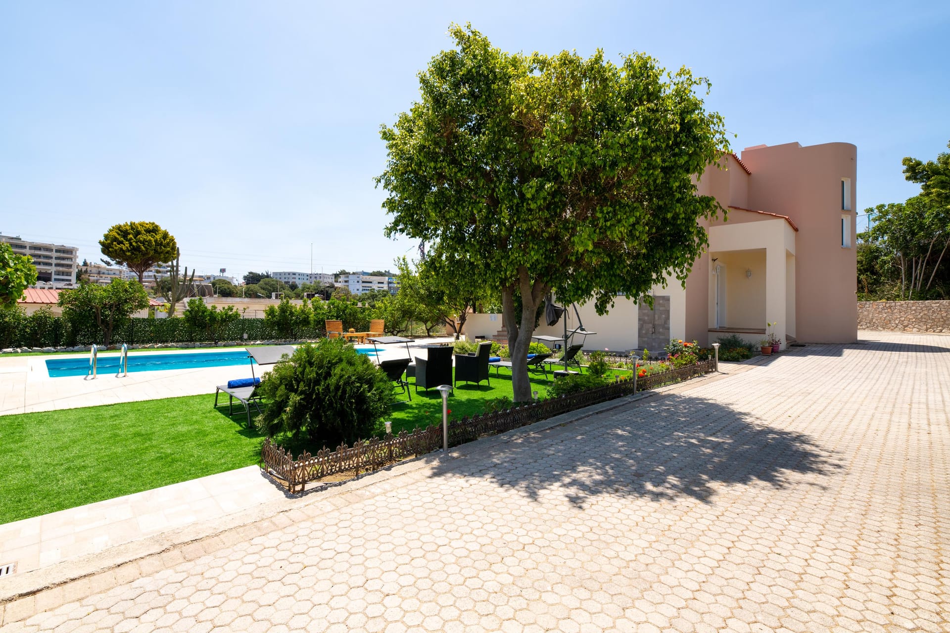 The fully equipped kitchen beckons culinary adventures. Step outside into the lush garden, where an outdoor dining area and BBQ await al fresco feasts. Dive into the sparkling private swimming pool for refreshing dips, or simply bask in the sun-kissed surroundings. Villa Emerald offers private parking space, ensuring hassle-free arrivals. Whether you're seeking relaxation or adventure, this villa promises the perfect retreat for families or groups, with ample space and modern comforts to create unforgettable memories amidst the beauty of Rhodes.