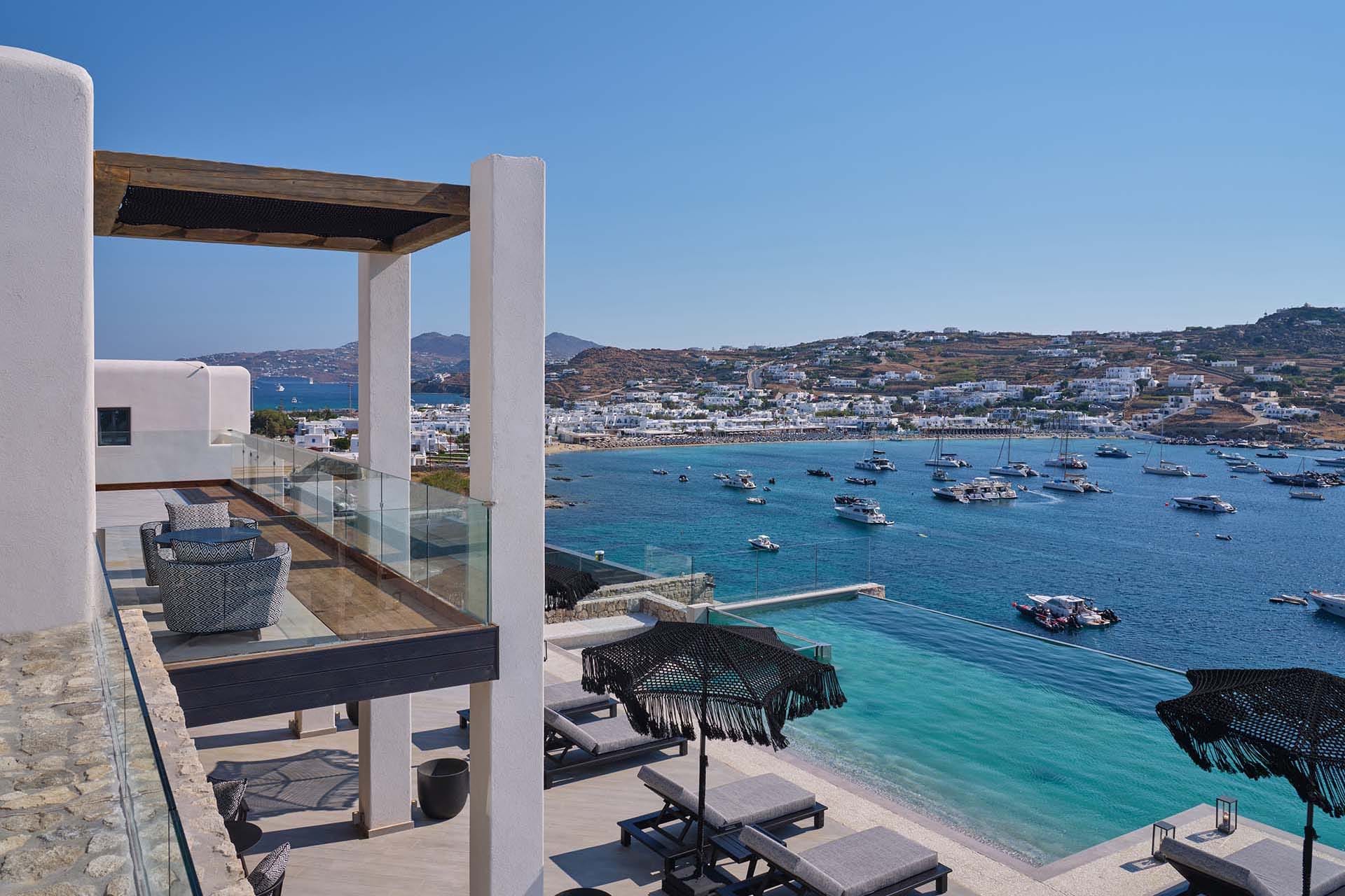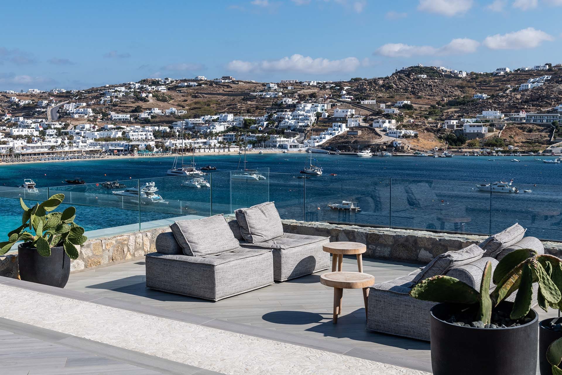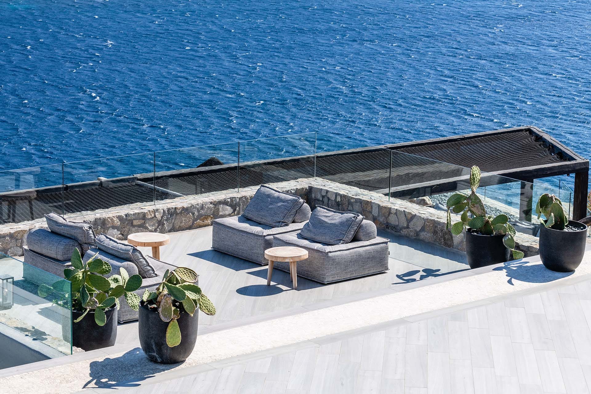 This open plan Suite is sophisticatedly decorated and it also features an open-air dining area, creating a unique setting to relax and soak the captivating views, while enjoying your breakfast or dinner. The in-door seating area is fitted with a satellite TV and a DVD player. Its bathroom and bathtub come with Korres toiletries, bathrobes and slippers.