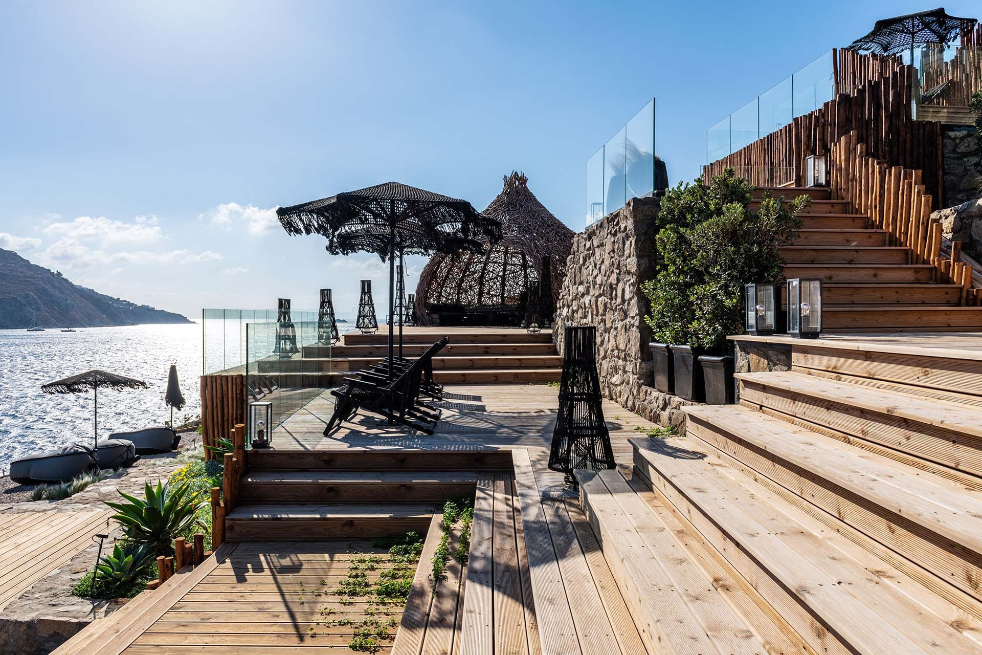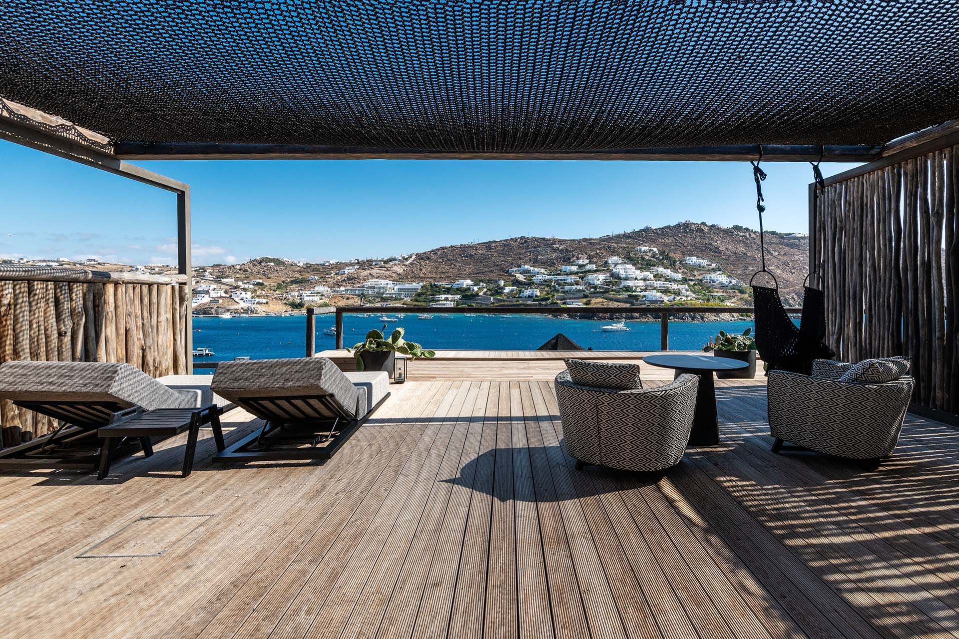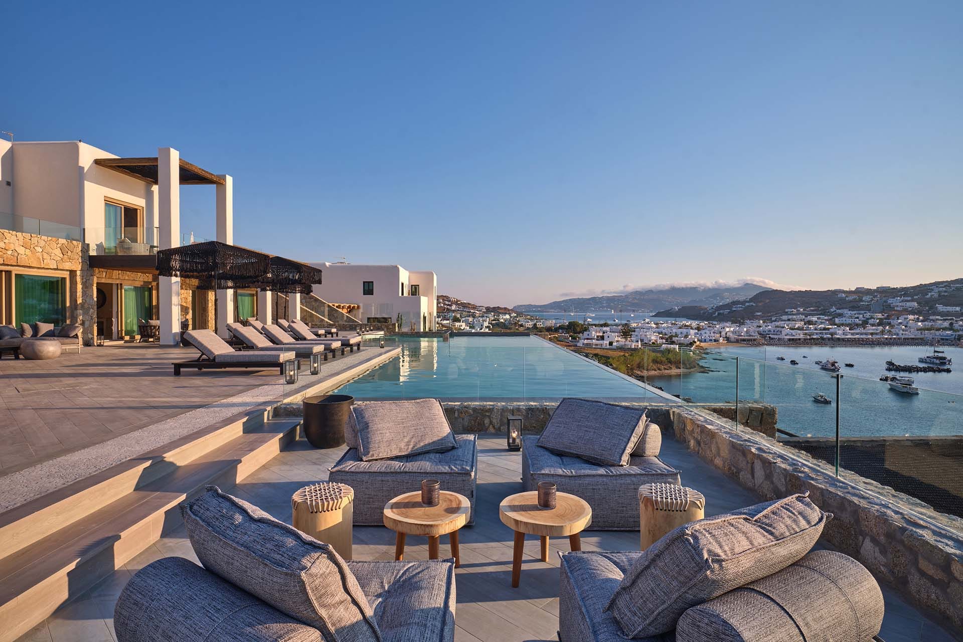 This open plan Suite is sophisticatedly decorated and it also features an open-air dining area, creating a unique setting to relax and soak the captivating views, while enjoying your breakfast or dinner. The in-door seating area is fitted with a satellite TV and a DVD player. Its bathroom and bathtub come with Korres toiletries, bathrobes and slippers.