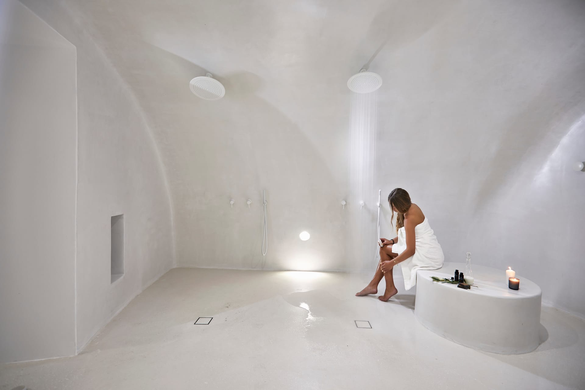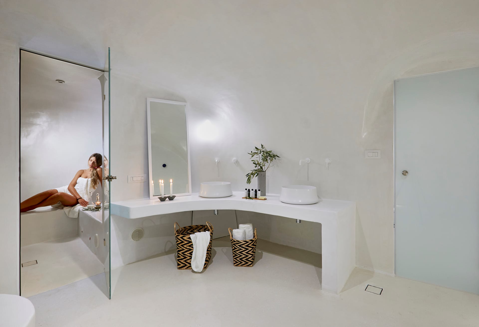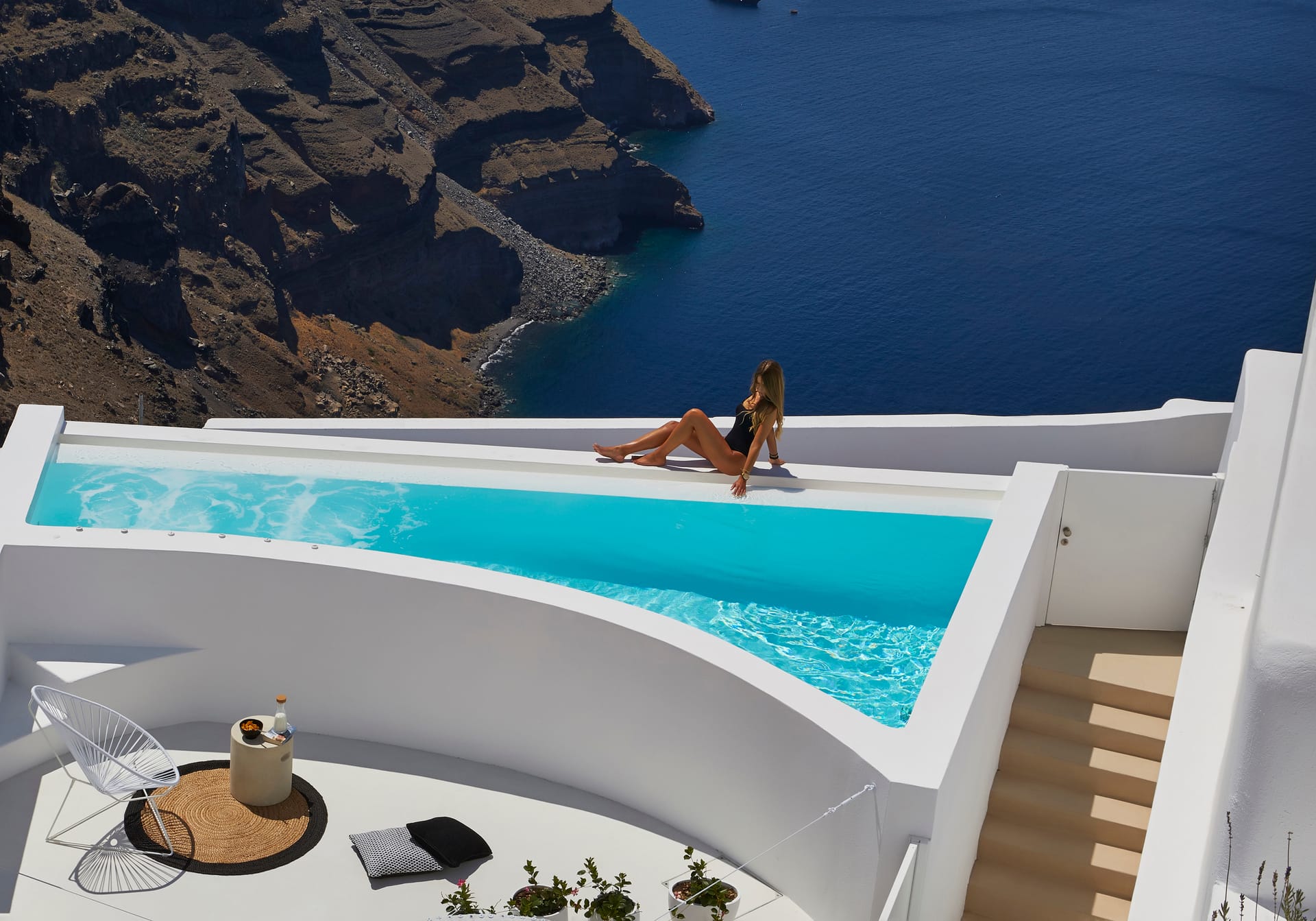Wide, sun-washed outdoor areas feature a private infinity pool, unobstructed sea views, a separate stone-built outdoor jacuzzi on a raised platform, a shaded lounge area under a pergola, and luxurious sun beds. From the moment you step onto the terrace, the landscape takes over. You will find plenty of cozy spots to hang out, grab a snack, or just enjoy the starry night. Surrounded by native greenery and herb bushes, Celadon also offers a petite roof terrace made for sunrise yoga.