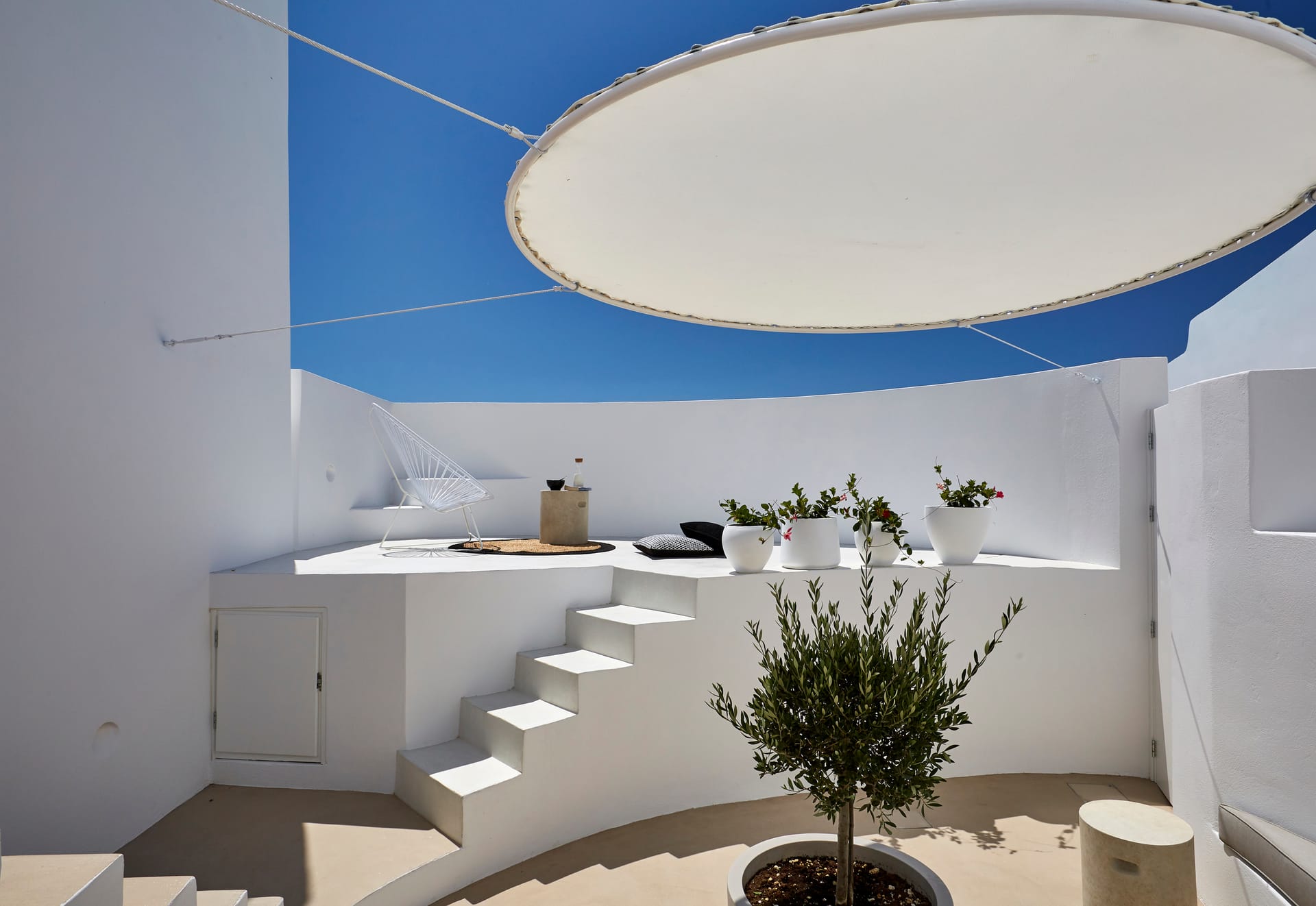 Celadon follows Cycladic traditional architecture and uses eco-friendly materials throughout. The former cylindrical lime kiln has been ingeniously converted into the living and kitchen area, crowned by a shaded skylight that floods the space with natural light. The layout is oriented so most rooms enjoy the same exceptional view. Sleeping arrangements include a master suite, a standalone guest suite, and an upper three-bedroom suite—each ensuite and ready to host up to 10 guests.