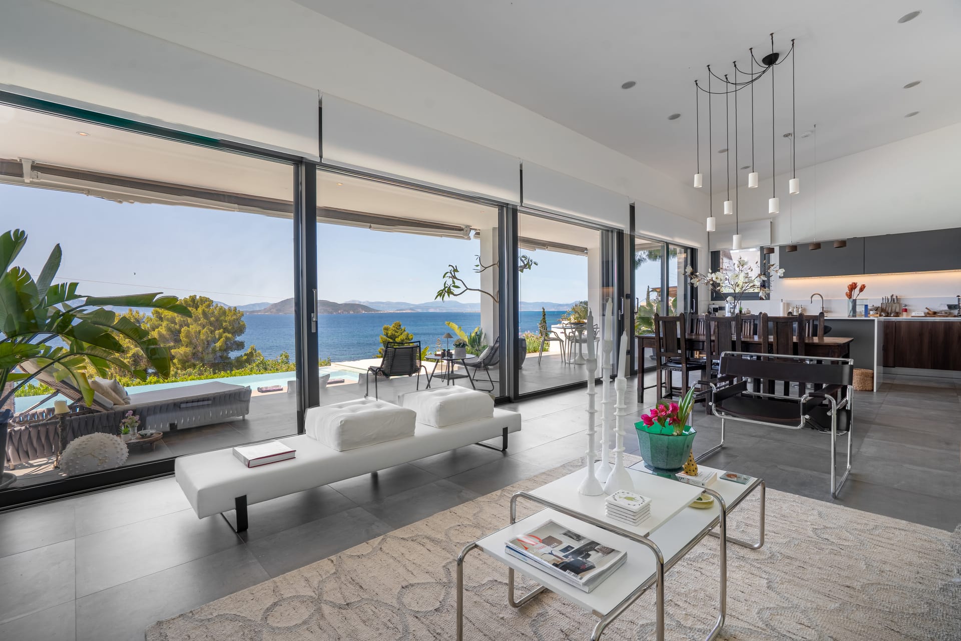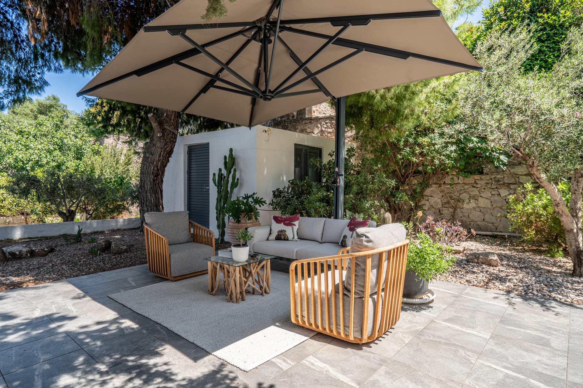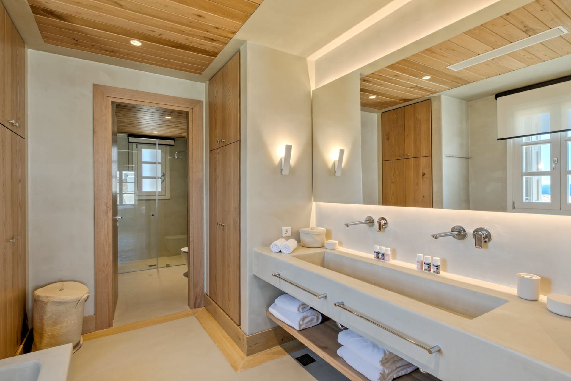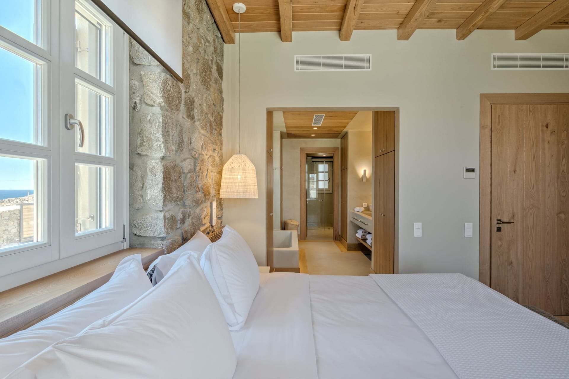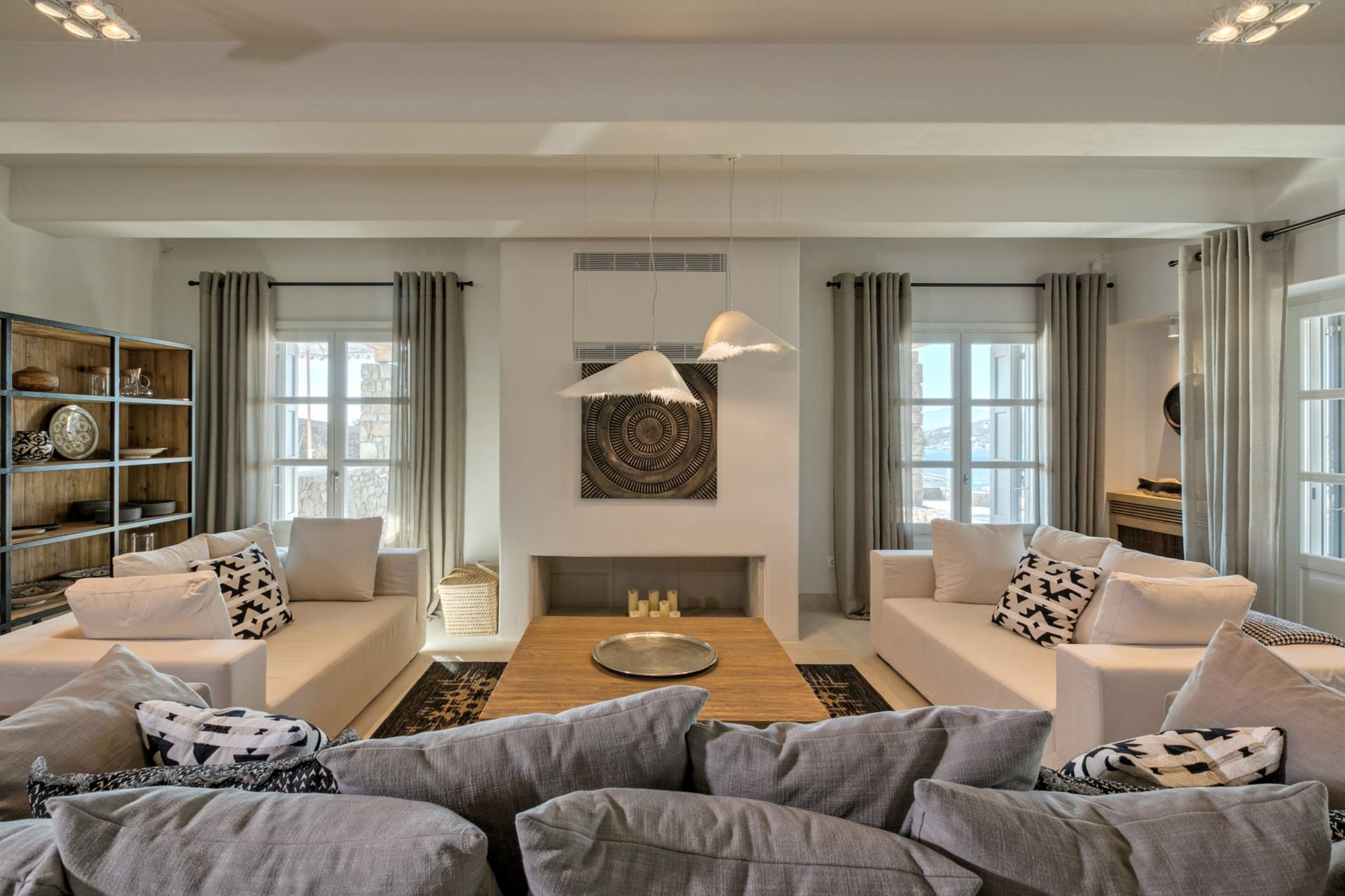 The property takes full advantage of its perfect position and spectacular surroundings. The unmistakably Mykonian design, whitewashed with stone-built and wooden elements and the various interior and exterior spaces in white and earth tones, allows you to immerse yourself in the Mykonos Lifestyle. With weather this good, you won’t want to go inside, the Villa boasting a poolside bar, a private relaxation pool and a BBQ. The gym and the massage room are located underground, while the property features gardens surrounding the Villa and private parking area.