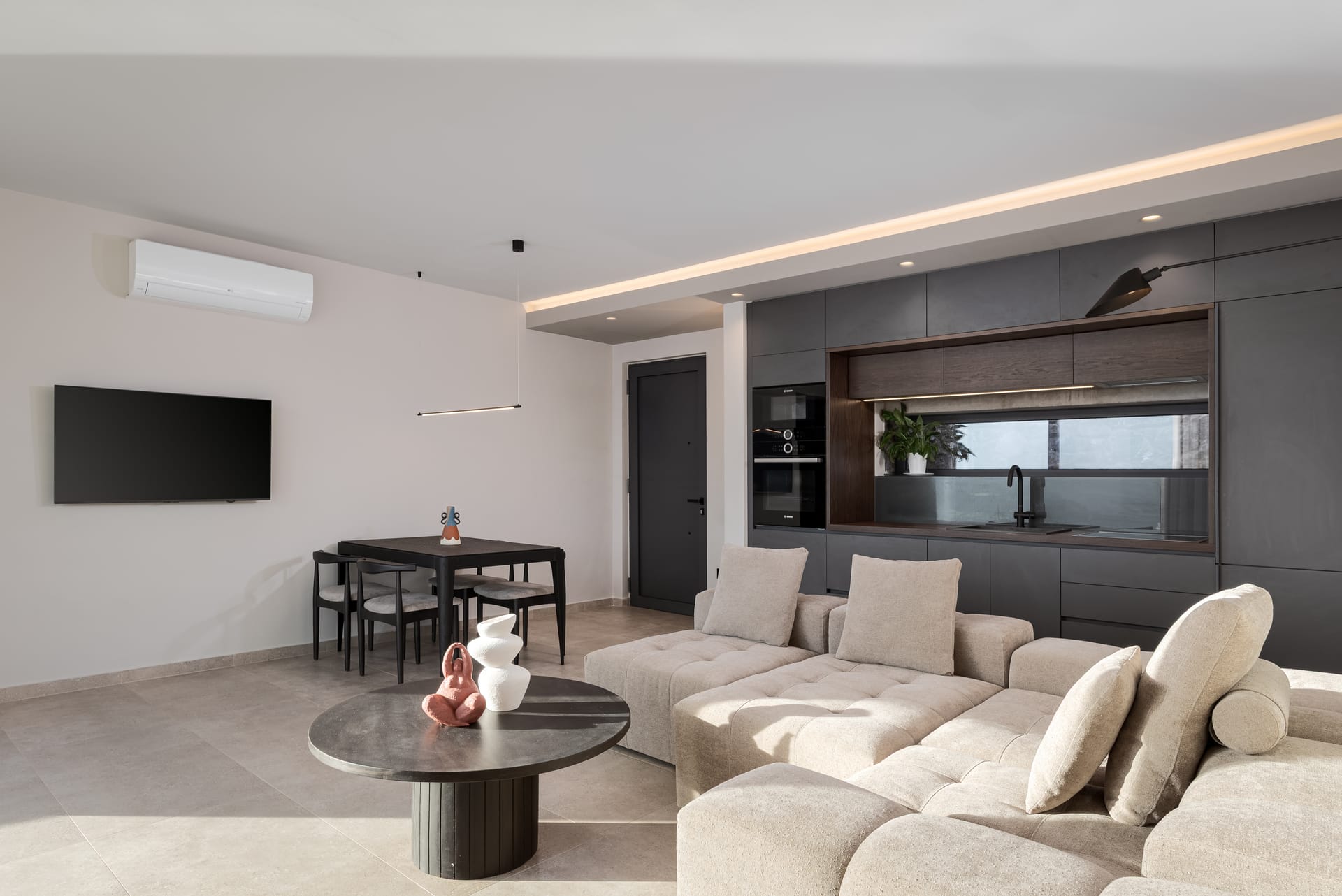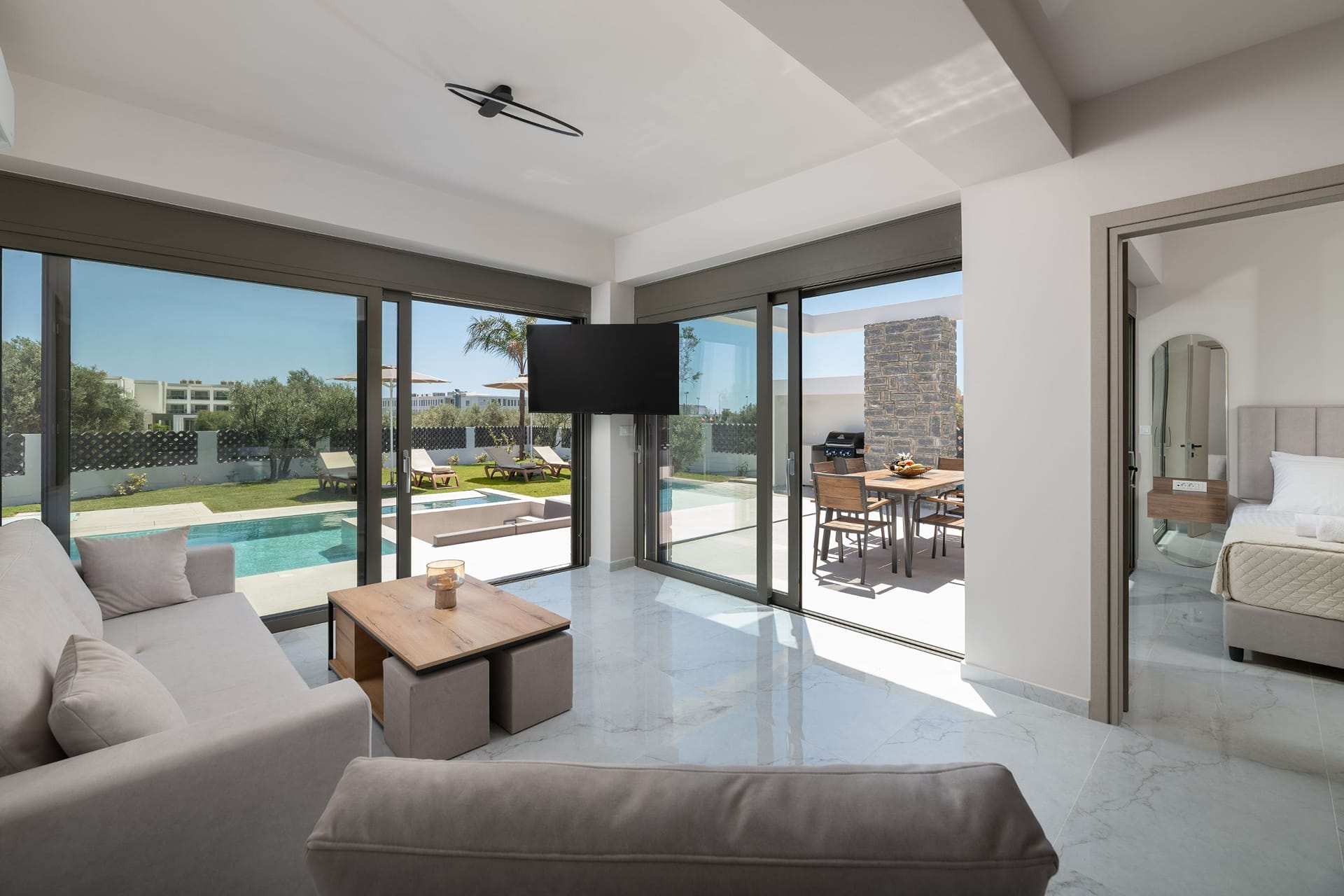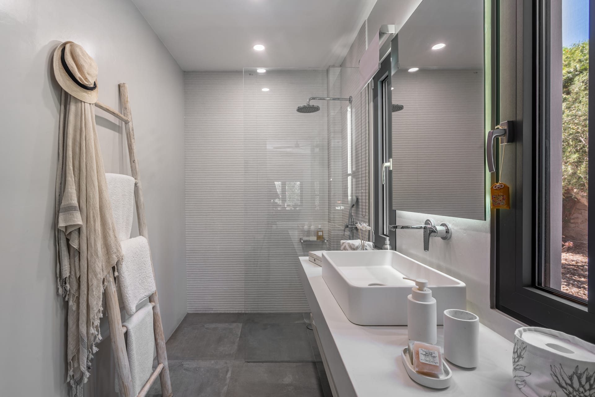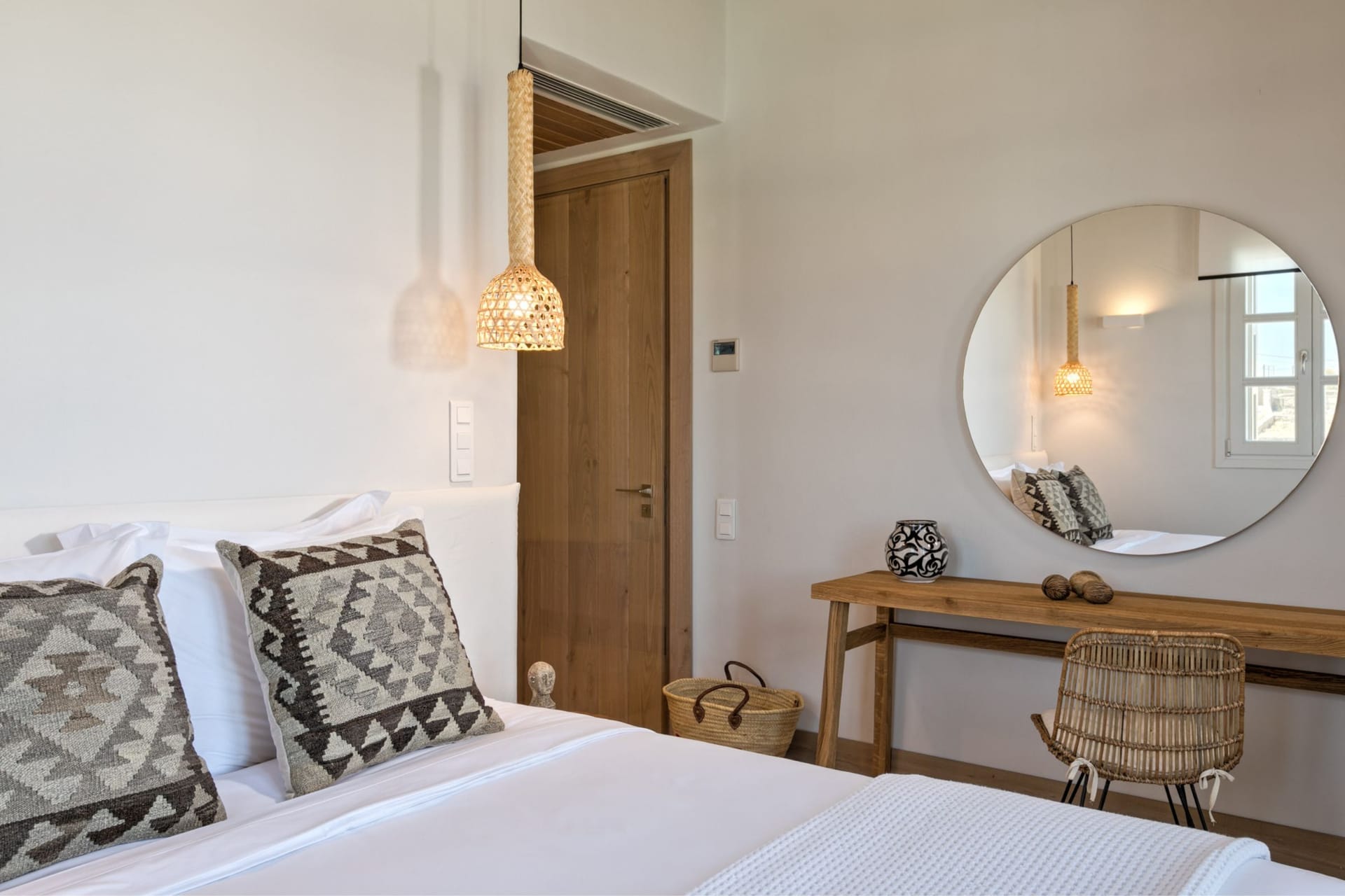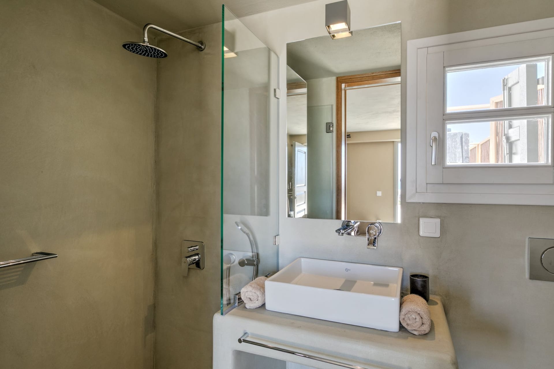 The property takes full advantage of its perfect position and spectacular surroundings. The unmistakably Mykonian design, whitewashed with stone-built and wooden elements and the various interior and exterior spaces in white and earth tones, allows you to immerse yourself in the Mykonos Lifestyle. With weather this good, you won’t want to go inside, the Villa boasting a poolside bar, a private relaxation pool and a BBQ. The gym and the massage room are located underground, while the property features gardens surrounding the Villa and private parking area.