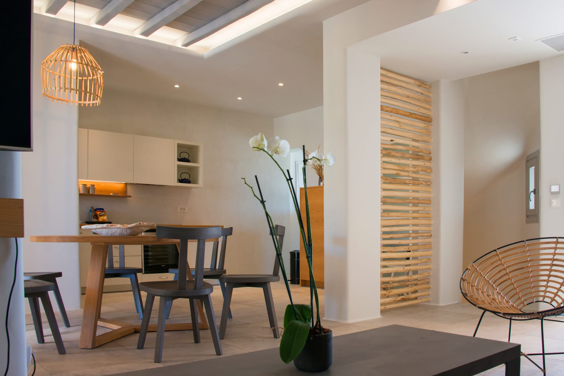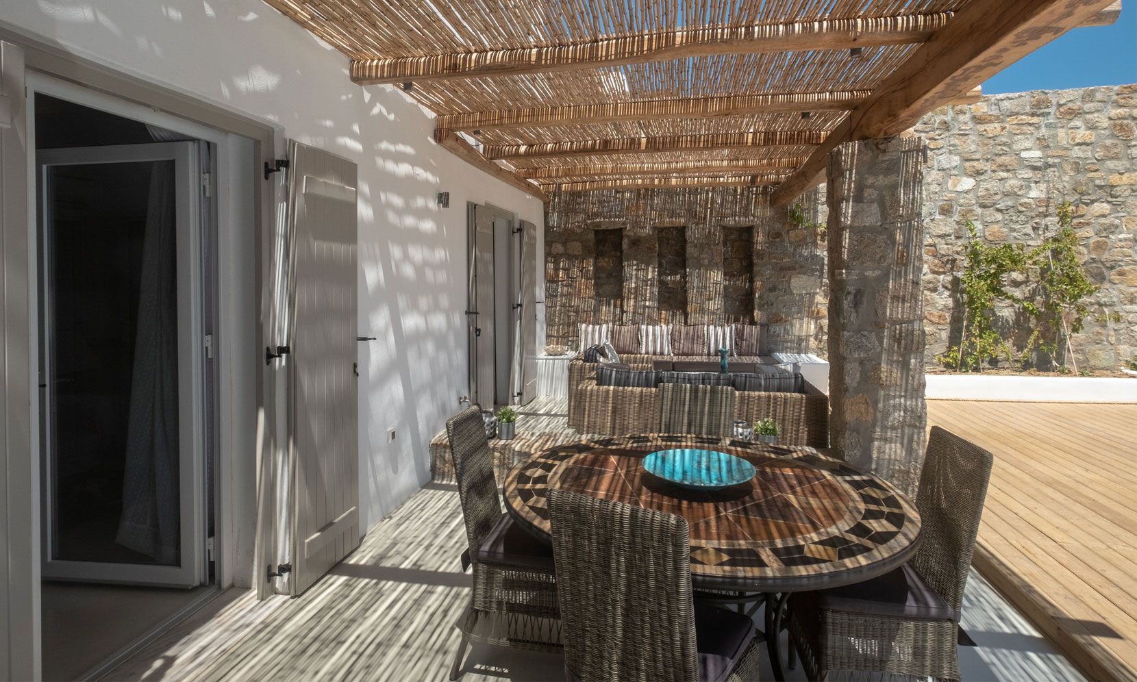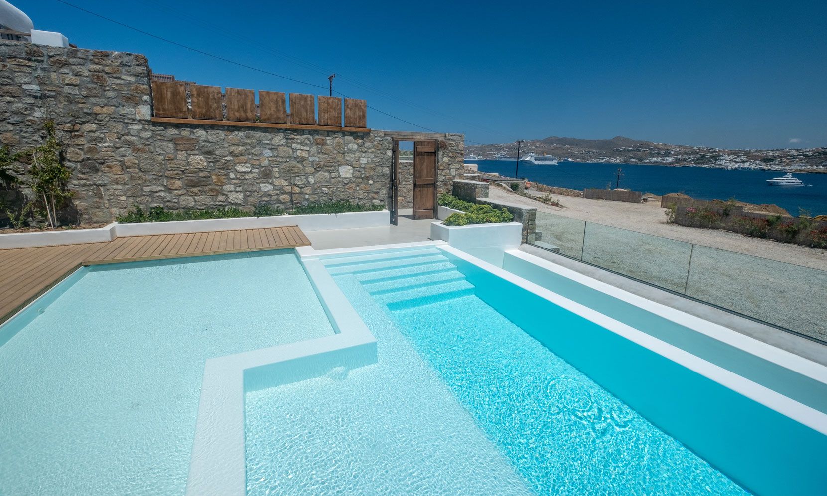 The stone-build design of the villa incorporates perfectly the traditional Mykonian architecture and the modern design trends. After a wild night in Mykonos Town or a long day at the beach, spend your time at the tranquil outdoor areas of Aigli, lounging or enjoying your private jacuzzi.