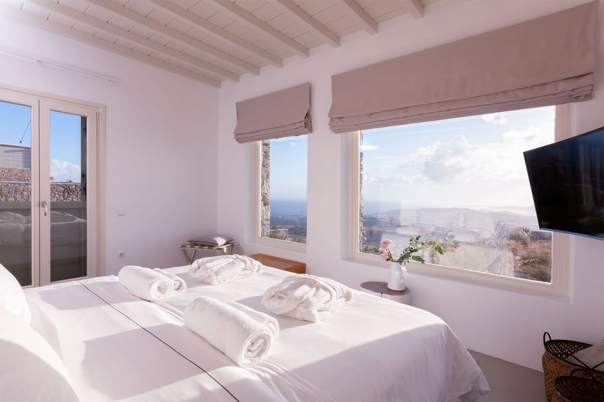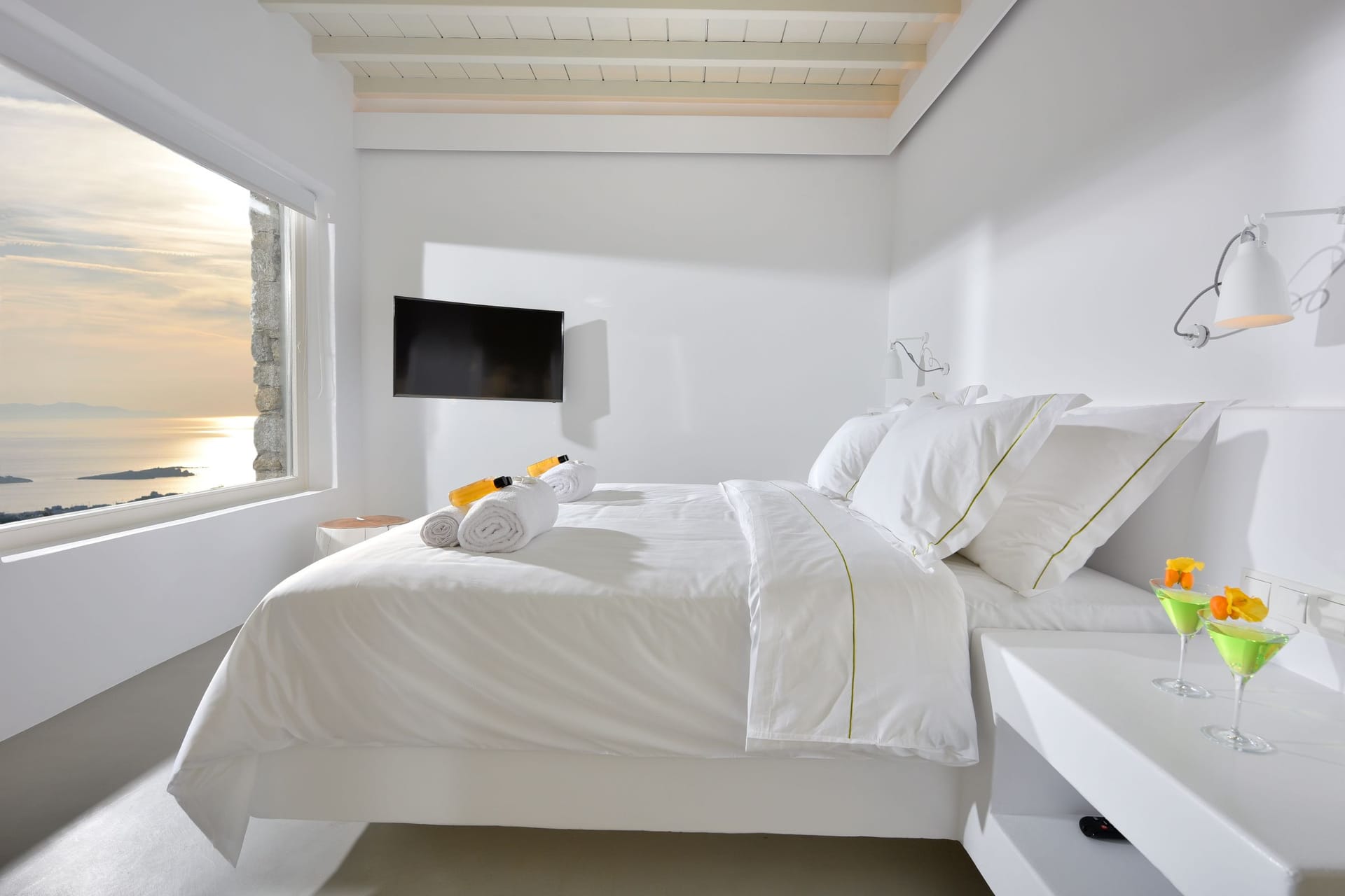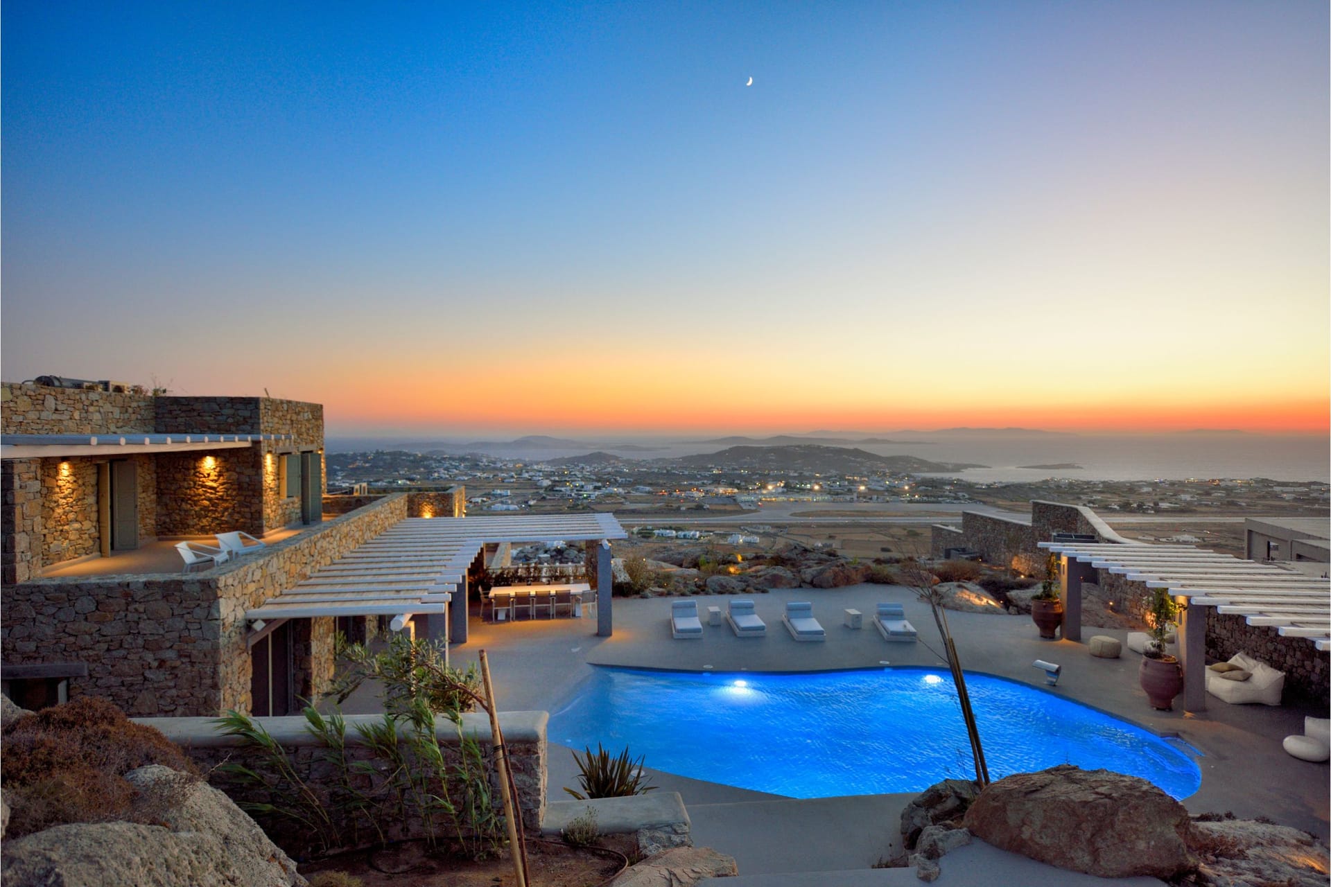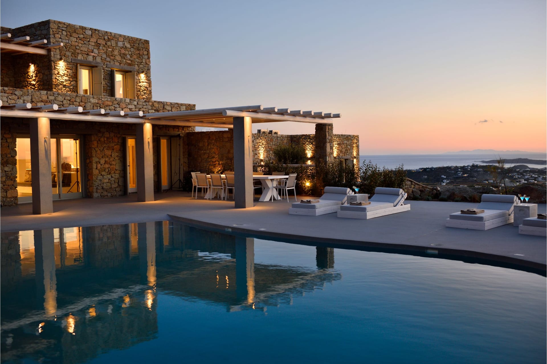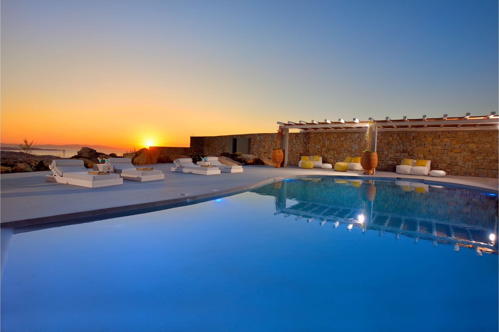 Antiopi is a luxurious villa, part of a modern complex, situated upon a privileged position in the Kounoupas area, overlooking the island of Mykonos and the traditional whitewashed settlements. Especially idyllic during the sunset, it bathes the villa with its golden colors and offers its guests an eye-popping picture.